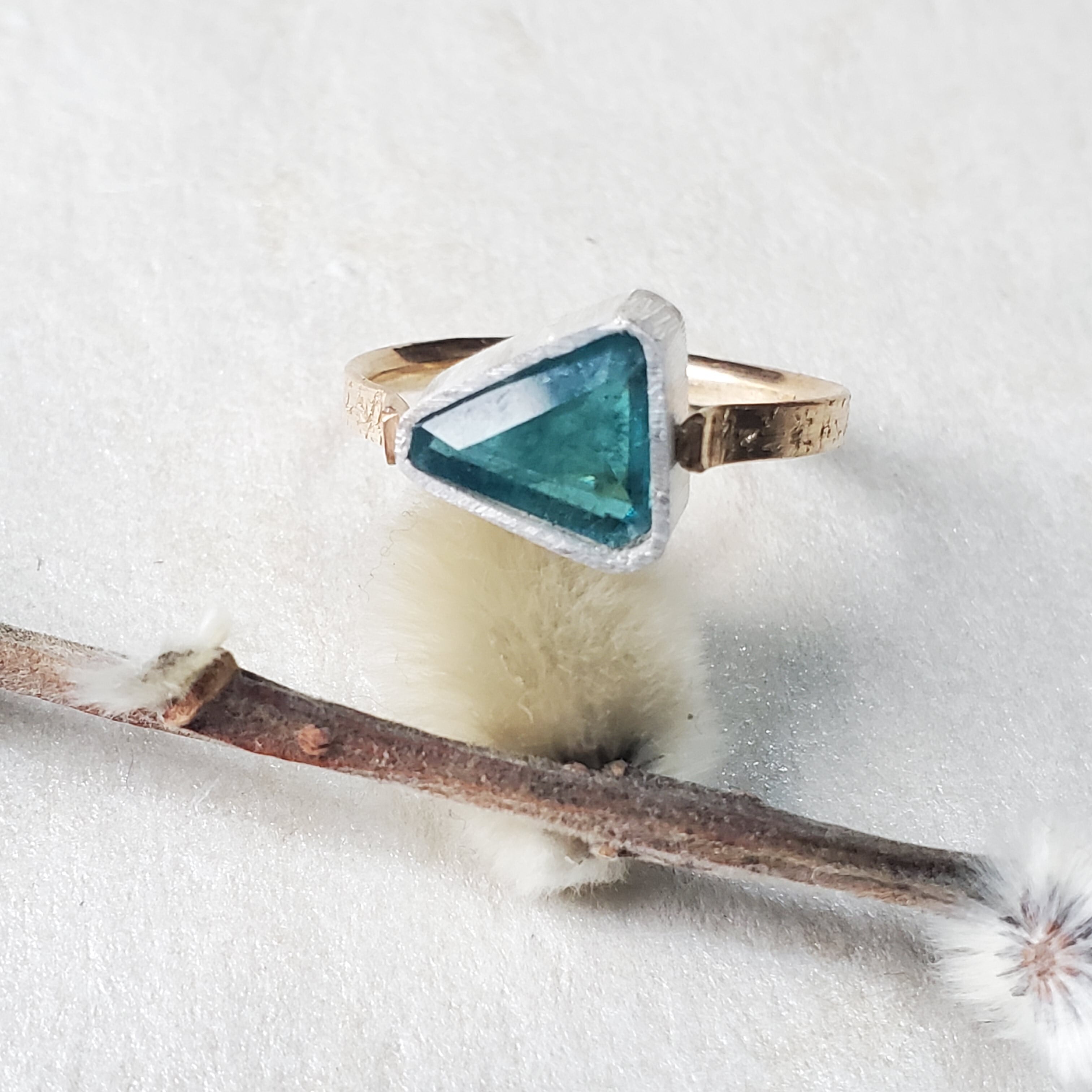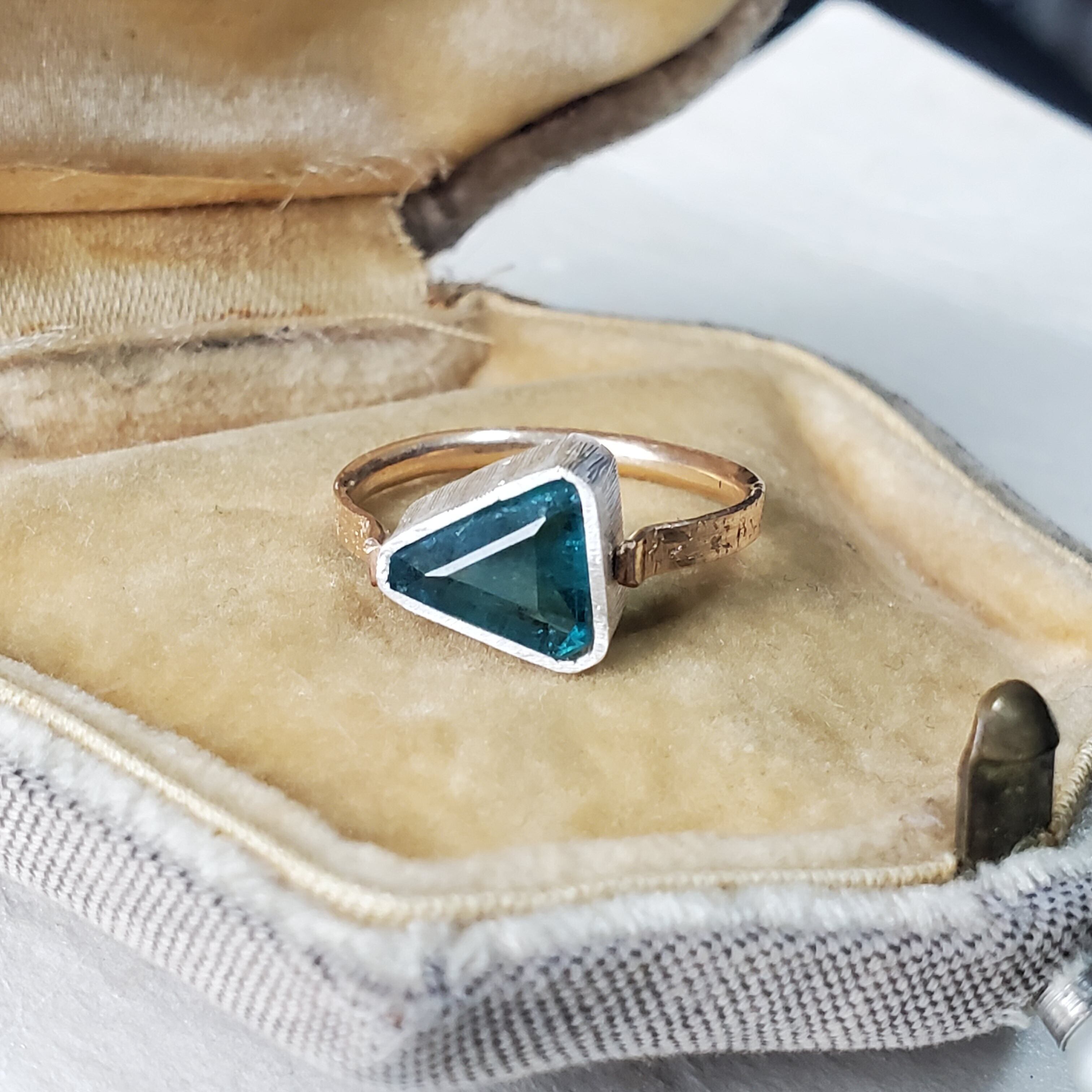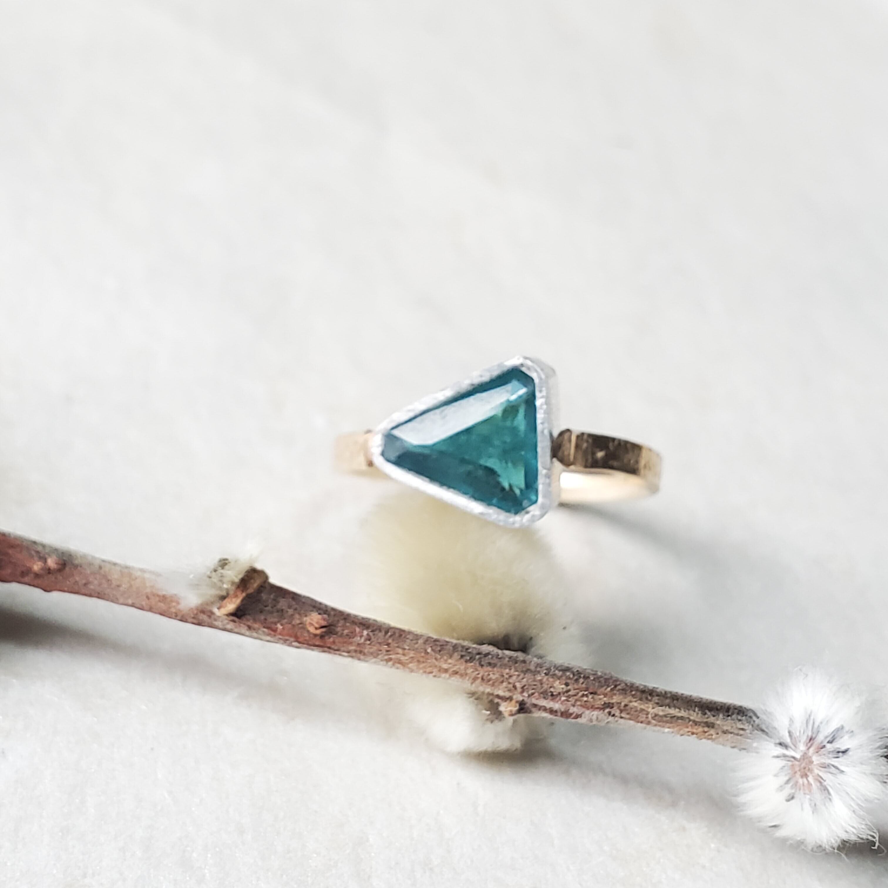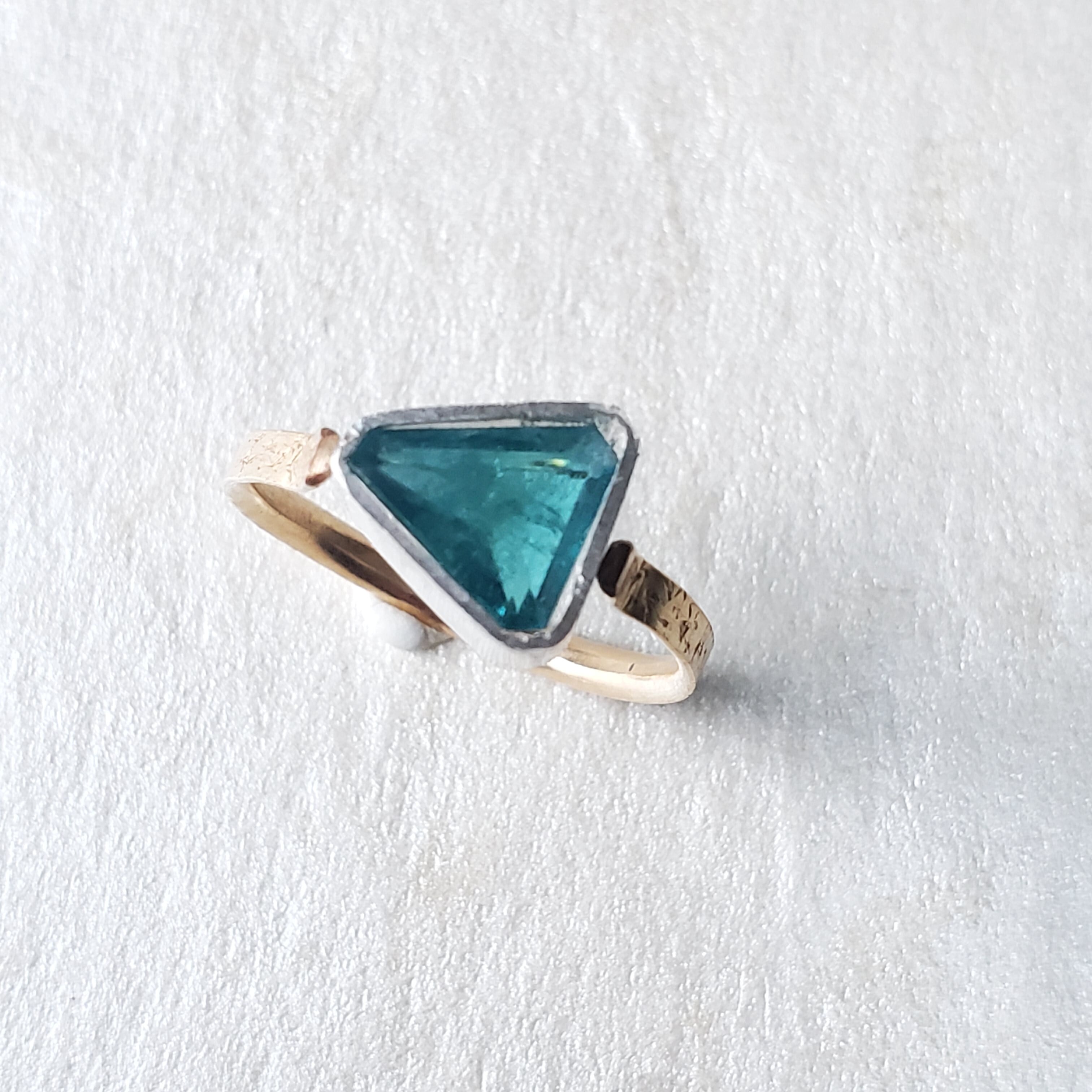 変形のカットに合わせた石枠を付けてあります。こういうカスタムシェイプは手間がかかるのでなかなかジュエリーとして出回ることが少ないですね。(とくにフクリン留めで作ると石留めを慎重にやる‥やら‥ざるをえないので相当に時間かかりますね)