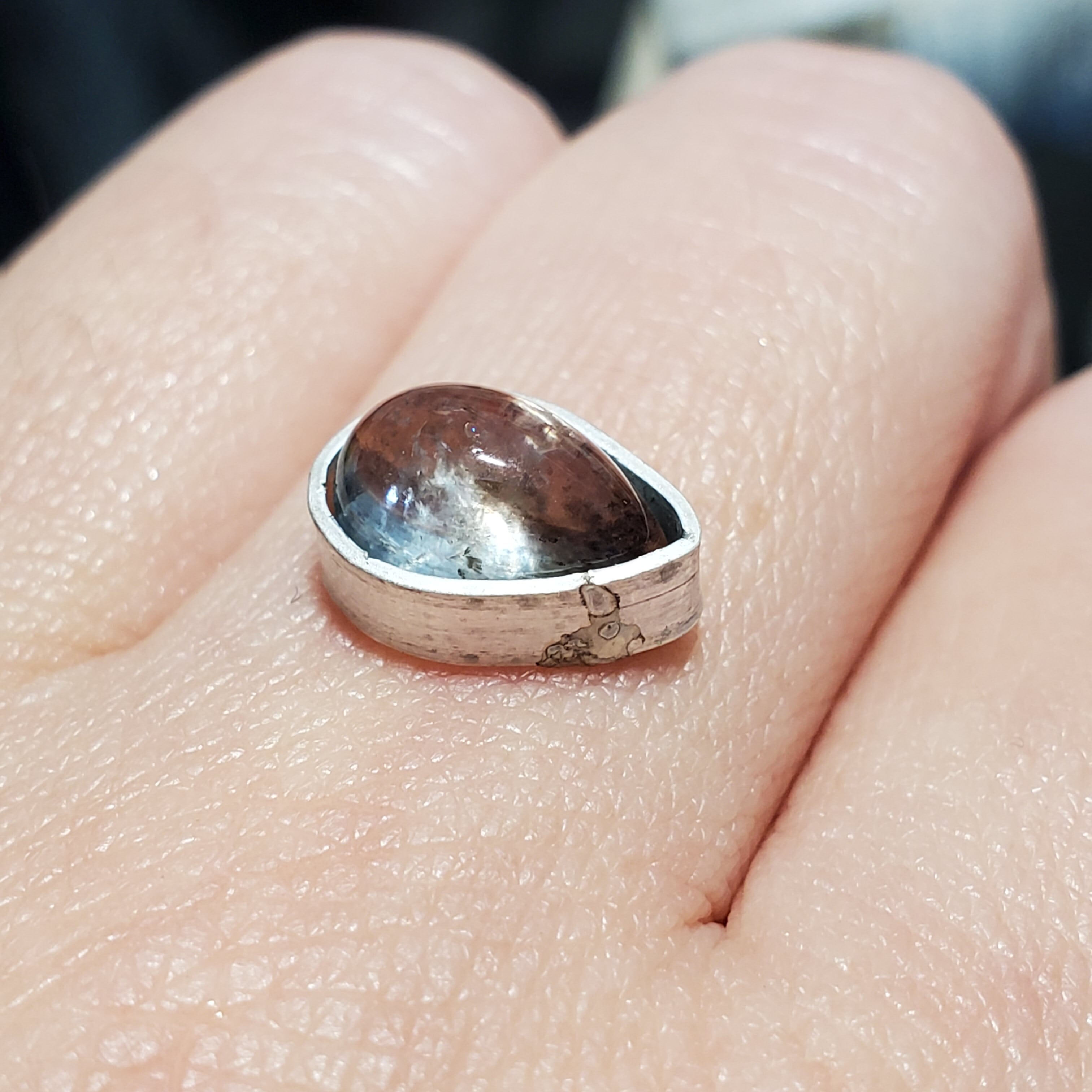 こちらはアクアマリンの中にイルメナイトが入っています。石の中の薄い朱色のもやもやがイルメナイトです。