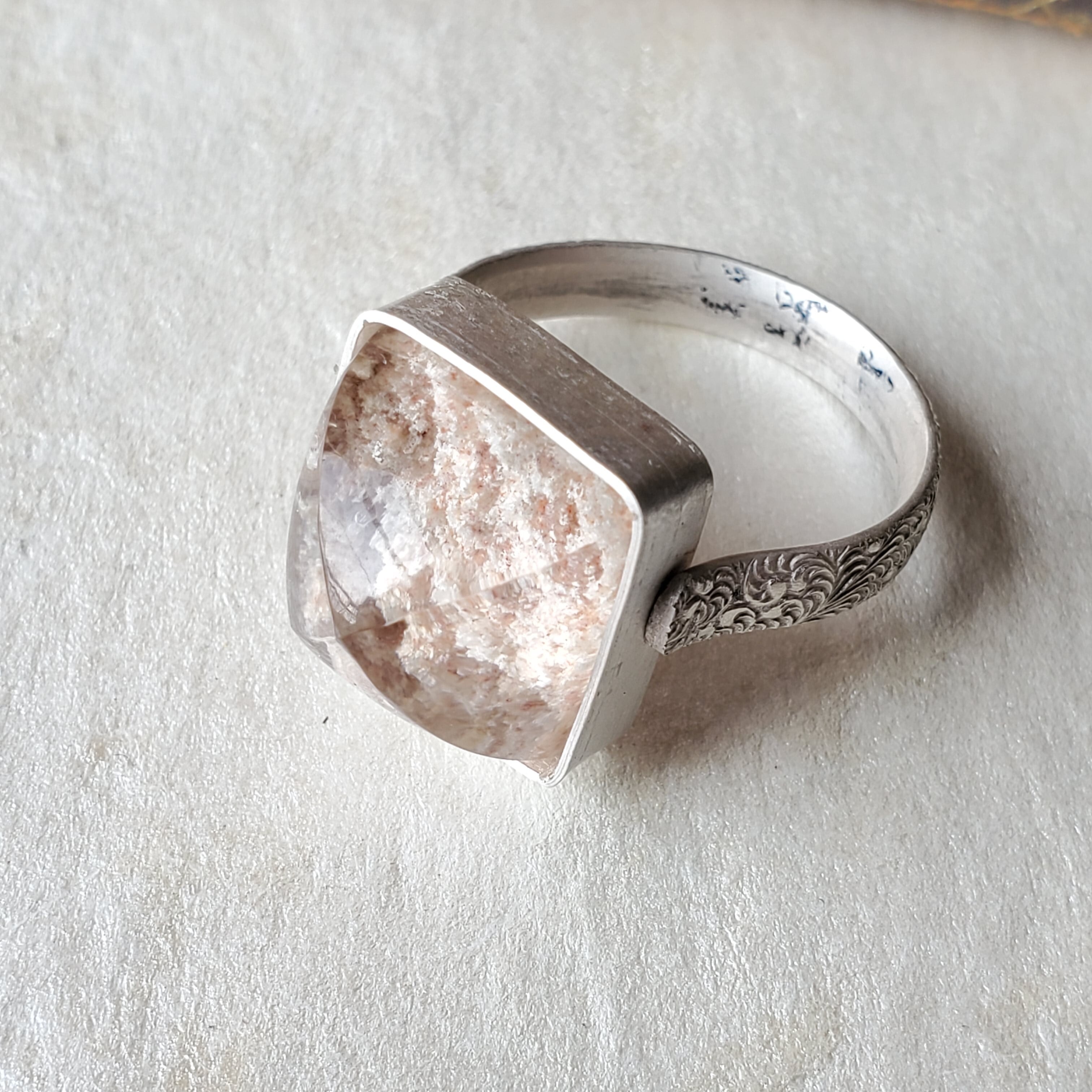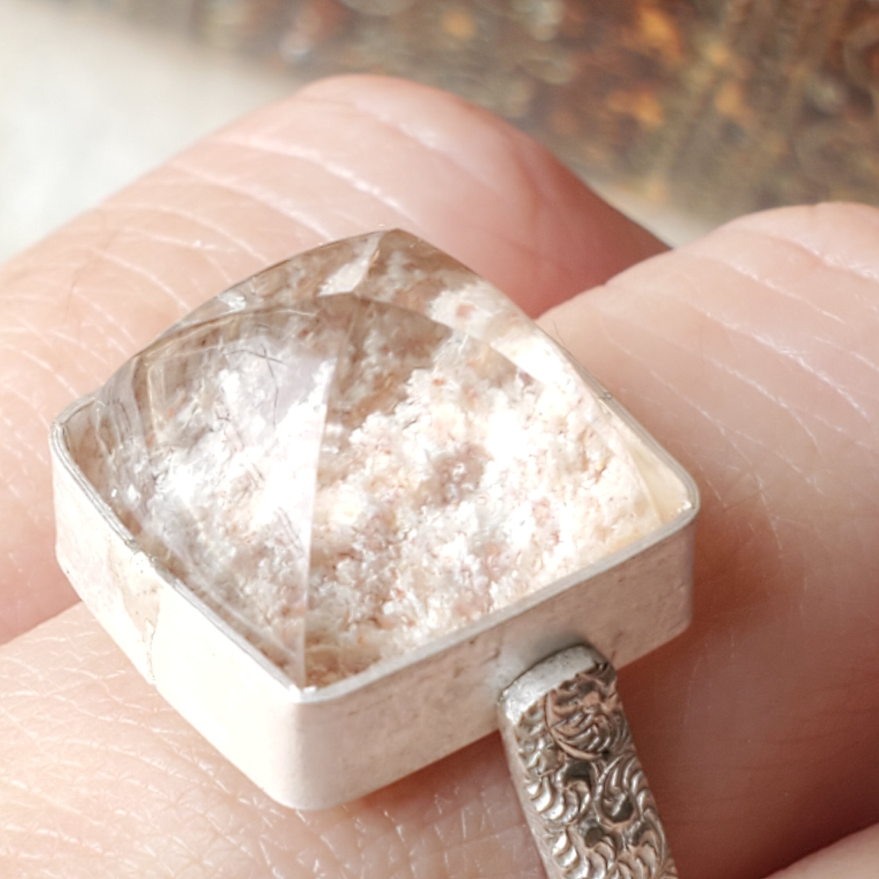 インクルージョンの色は白、ベビーピンク、ベージュピンクでにごりやくすみのない美しい色合いです。クォーツは透明度が高く、シュガーローフカットの個性派です。