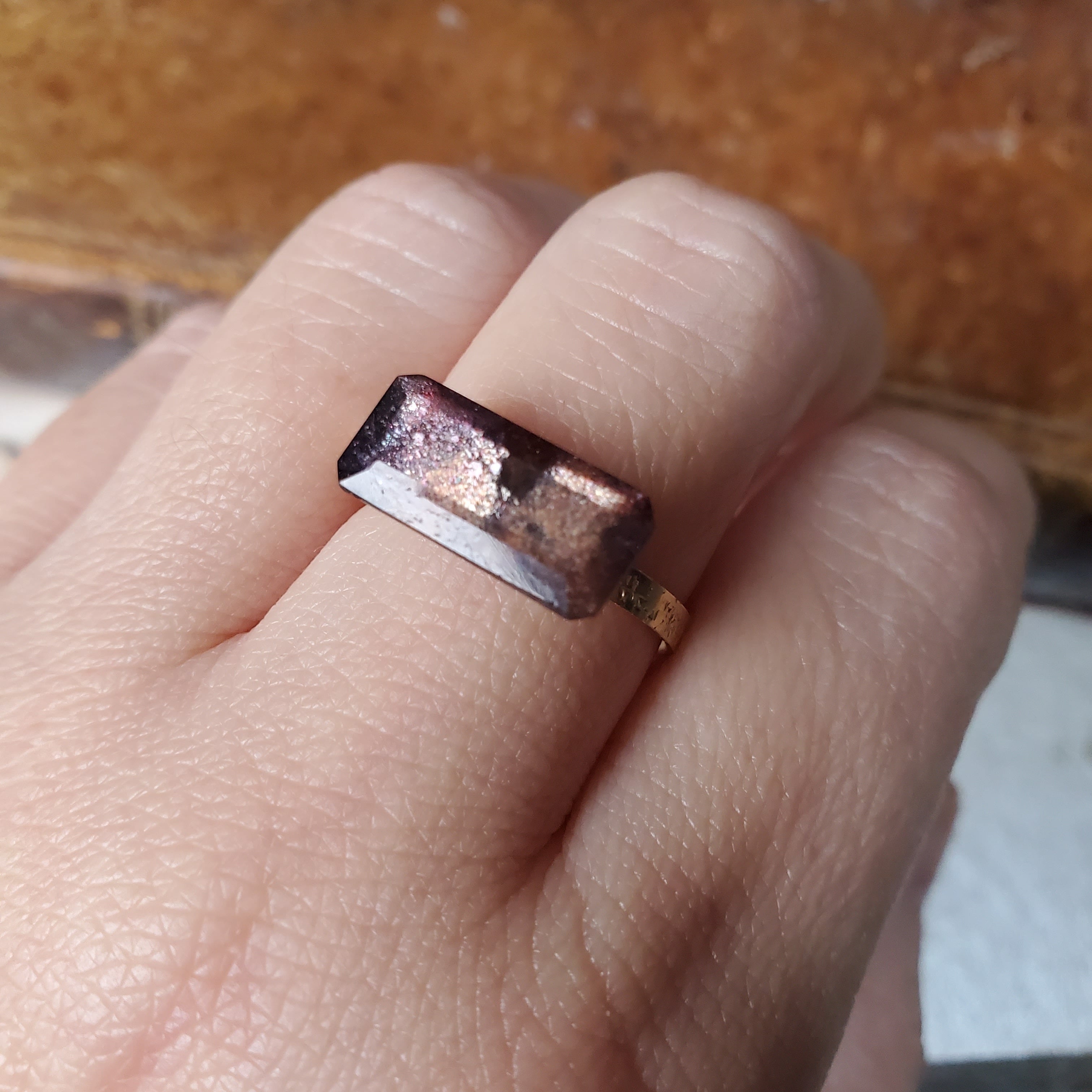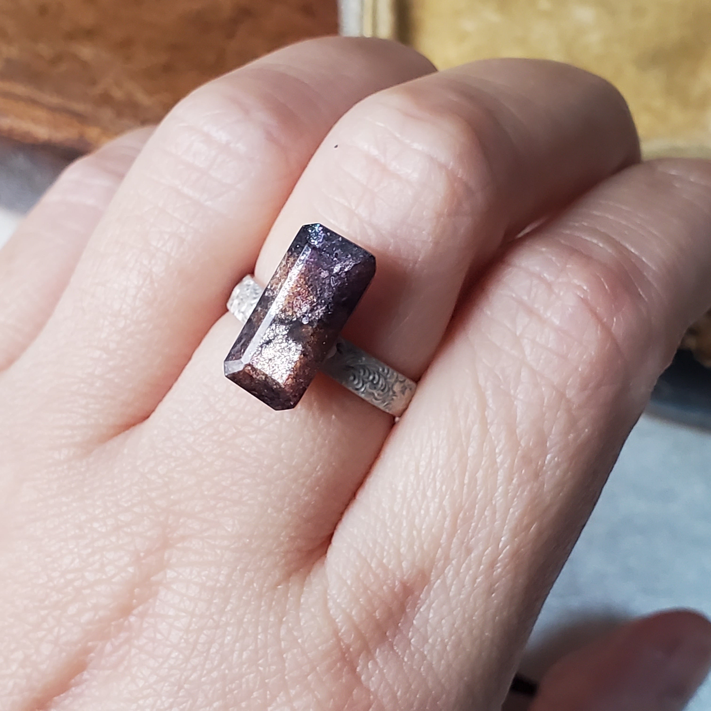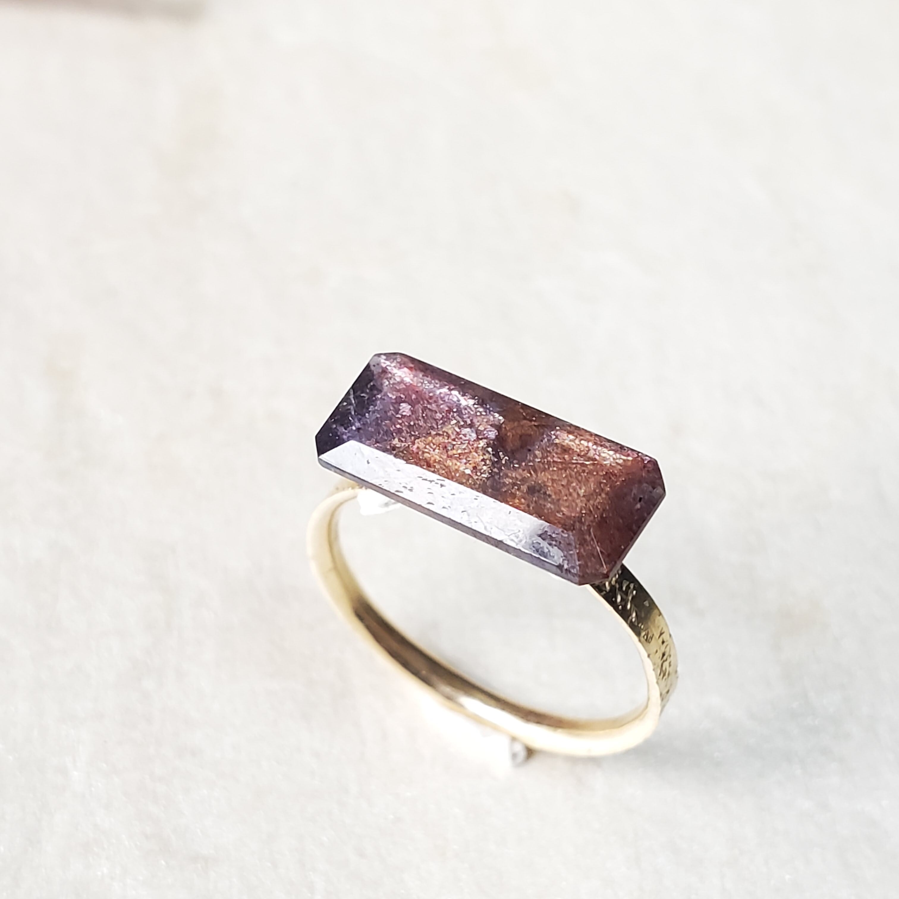 闇色のアイオライトにサーモンピンクのインクルージョンがパッと浮かび上がります。はしの方までしっかりインクルが入っています。