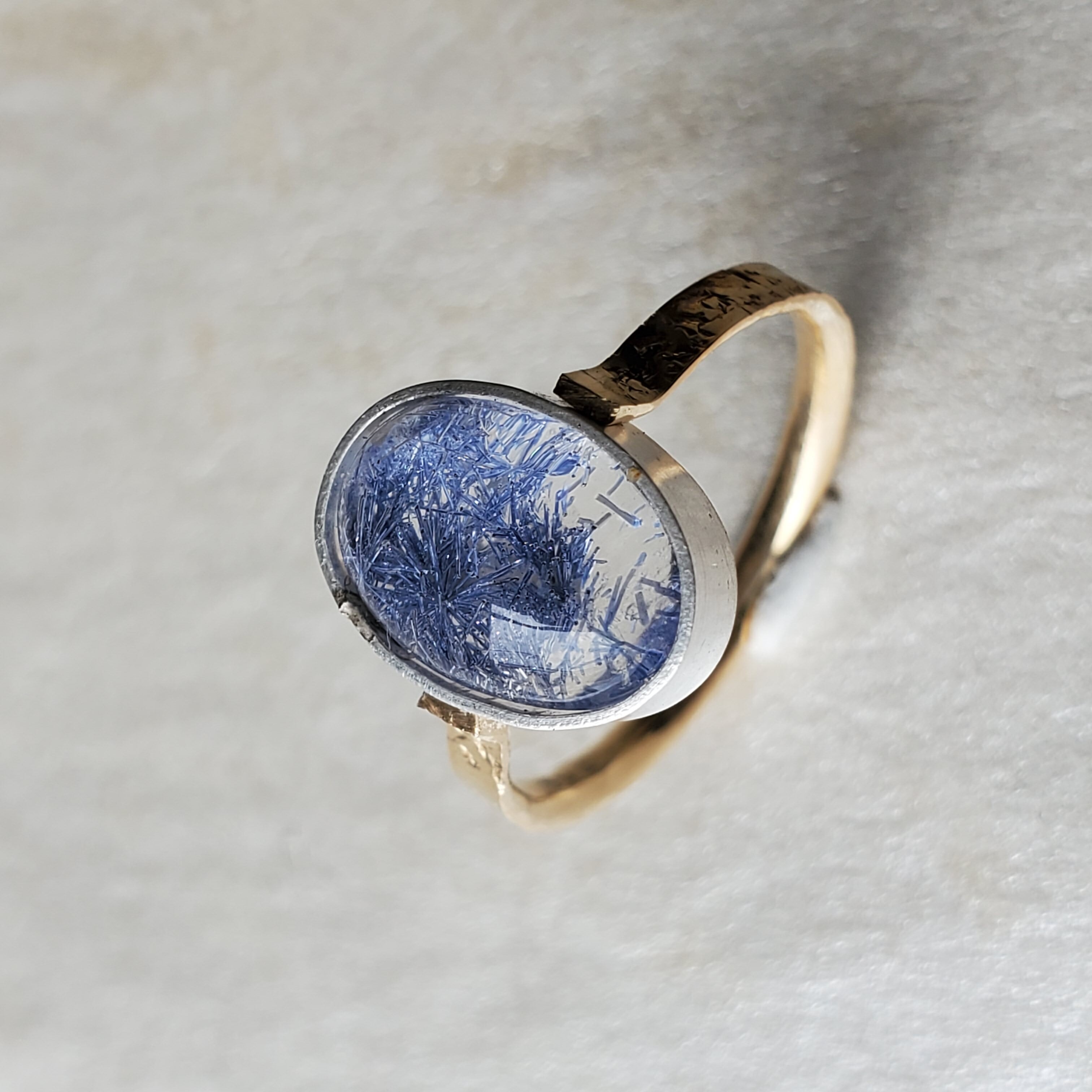 透明感のあるクォーツに青い火花のようなデュモルチェライトが入っています。