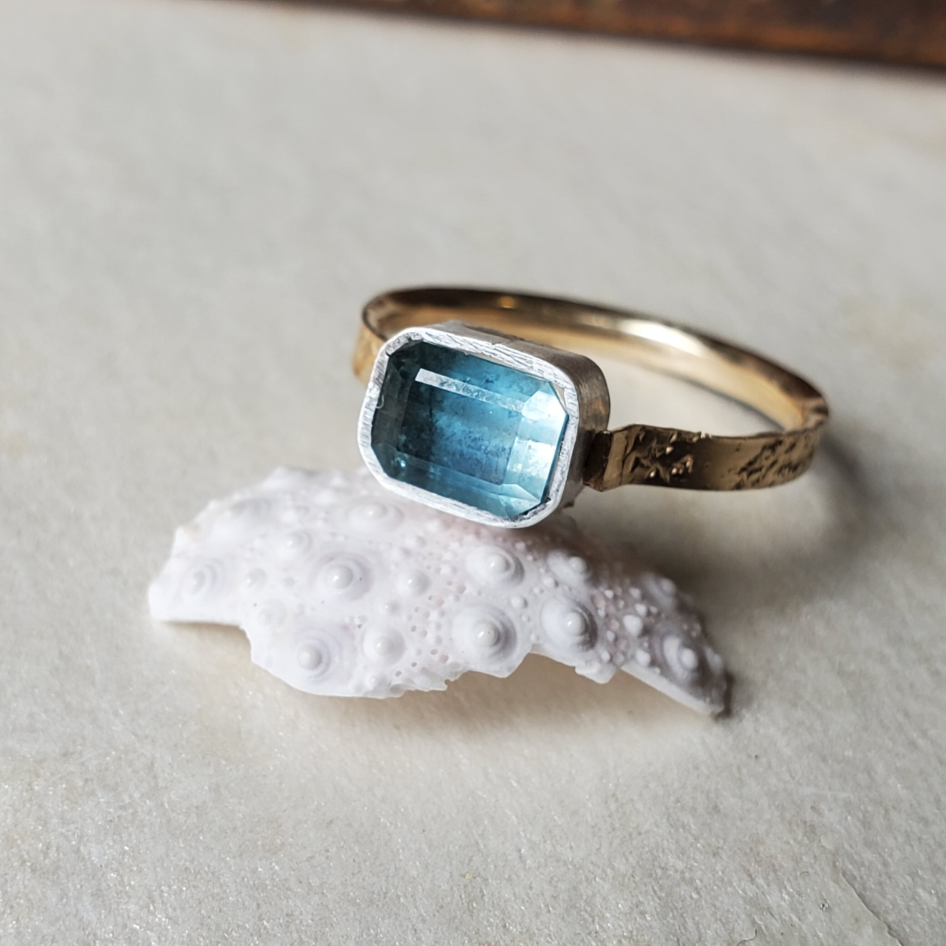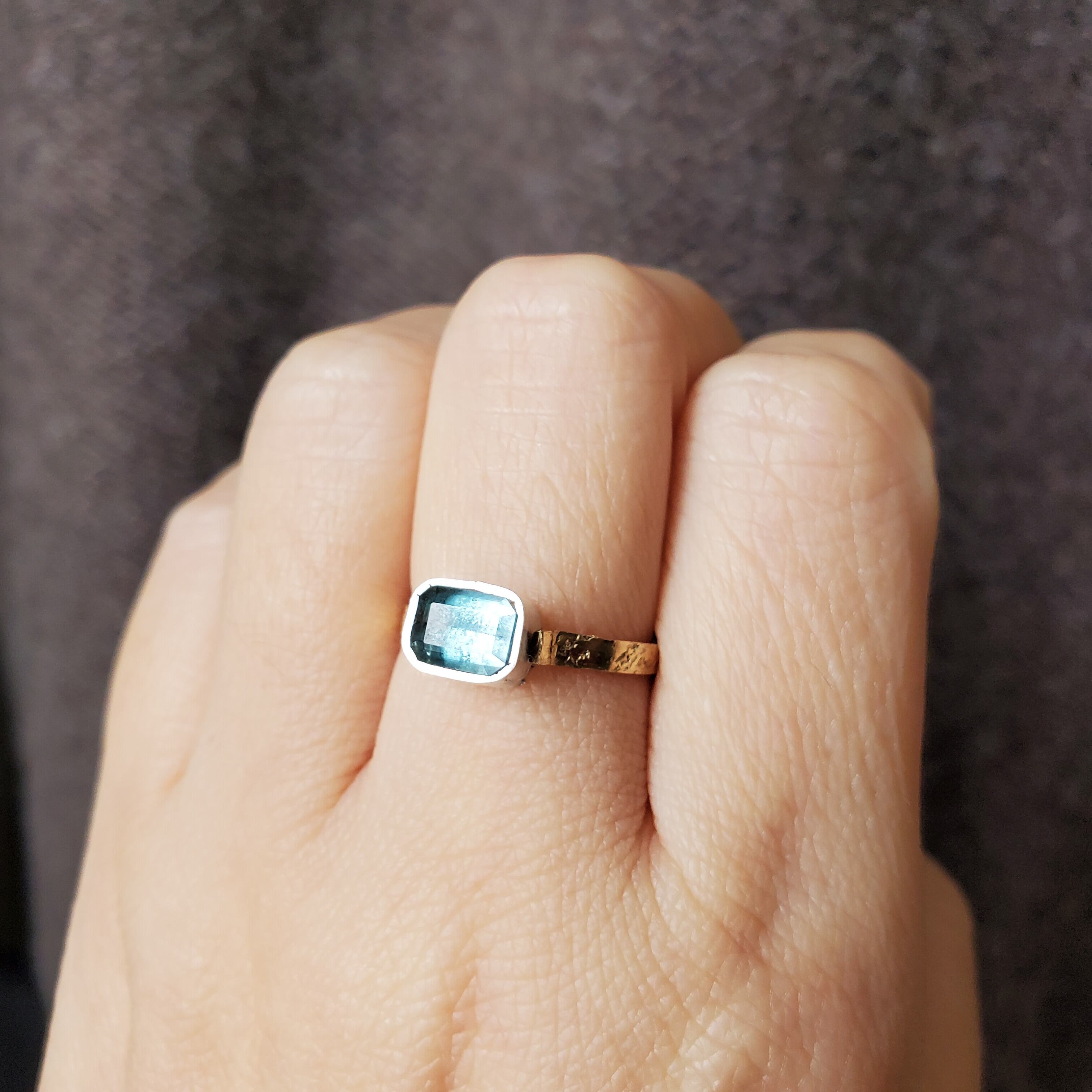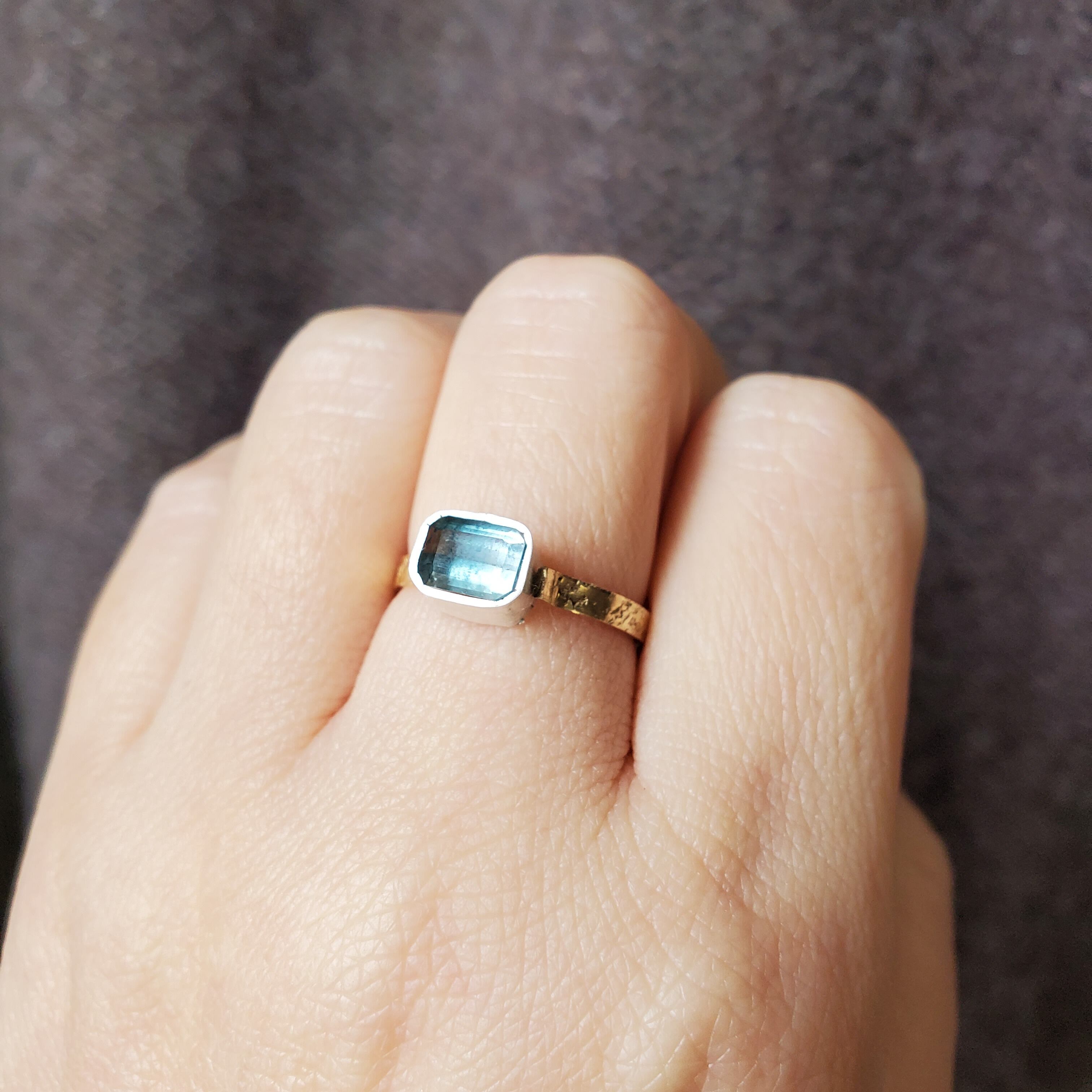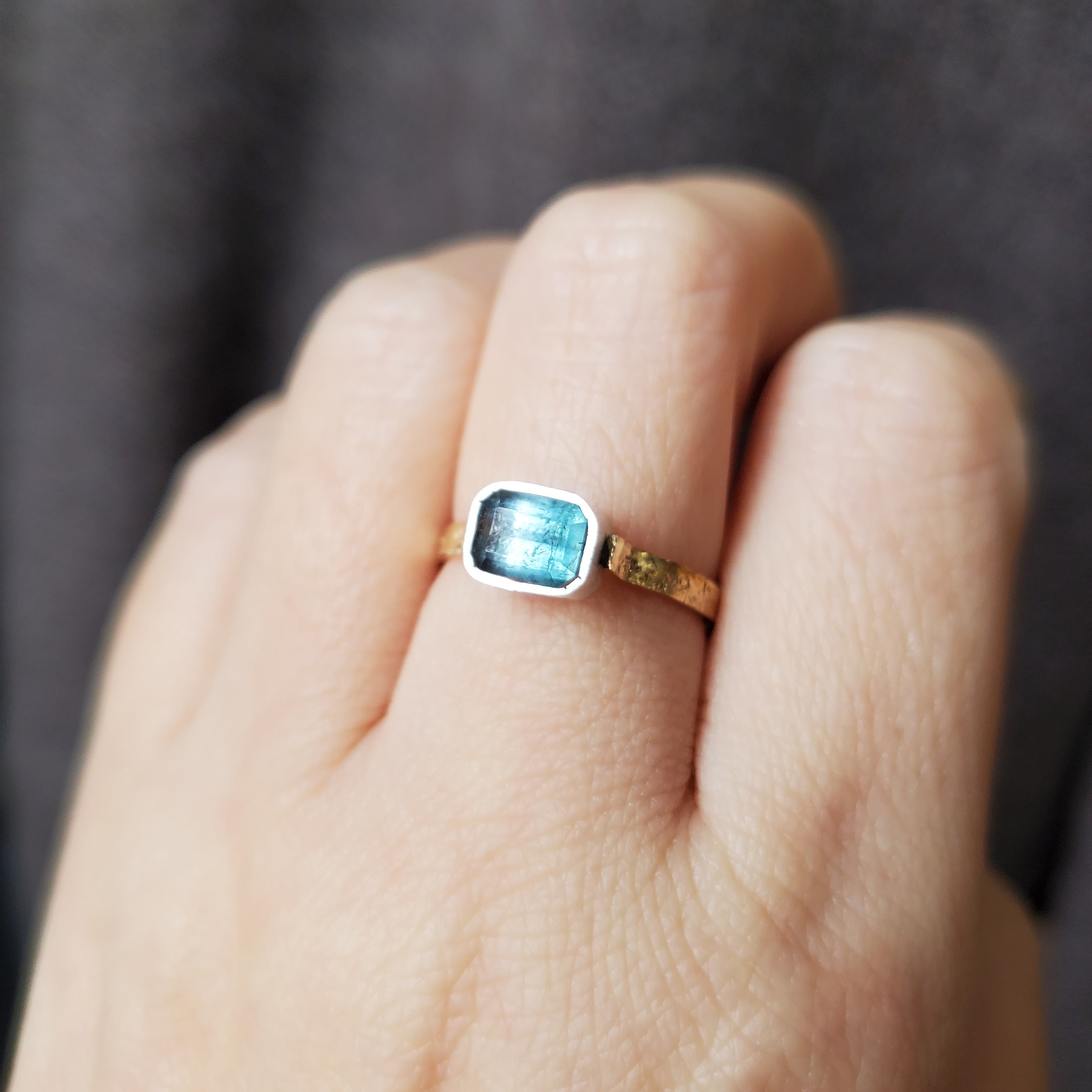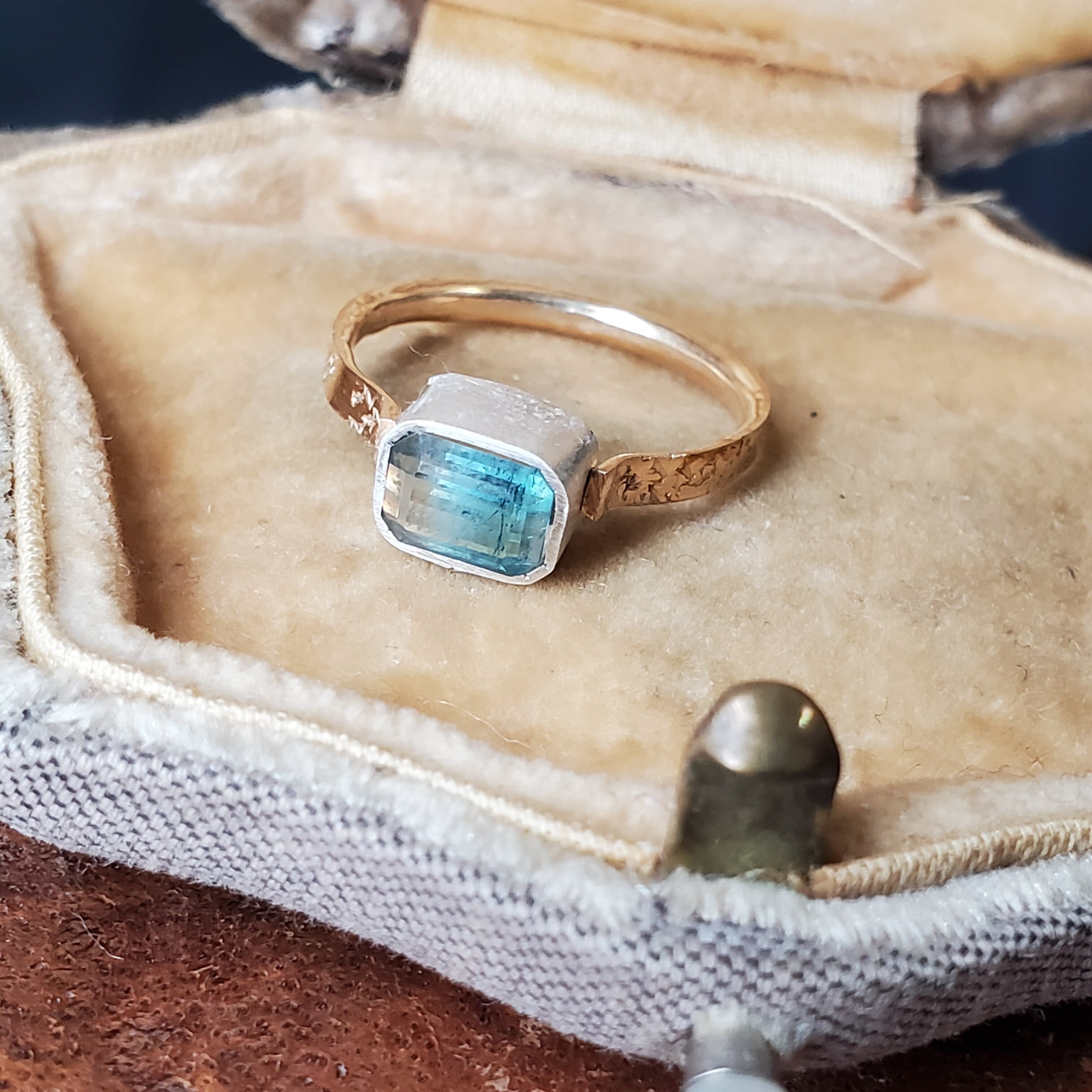 石の左側がクリア、右側がアイスブルー、透明感のあるネイビーブルーになっていて、その中間は美しいグラデーションになっています。