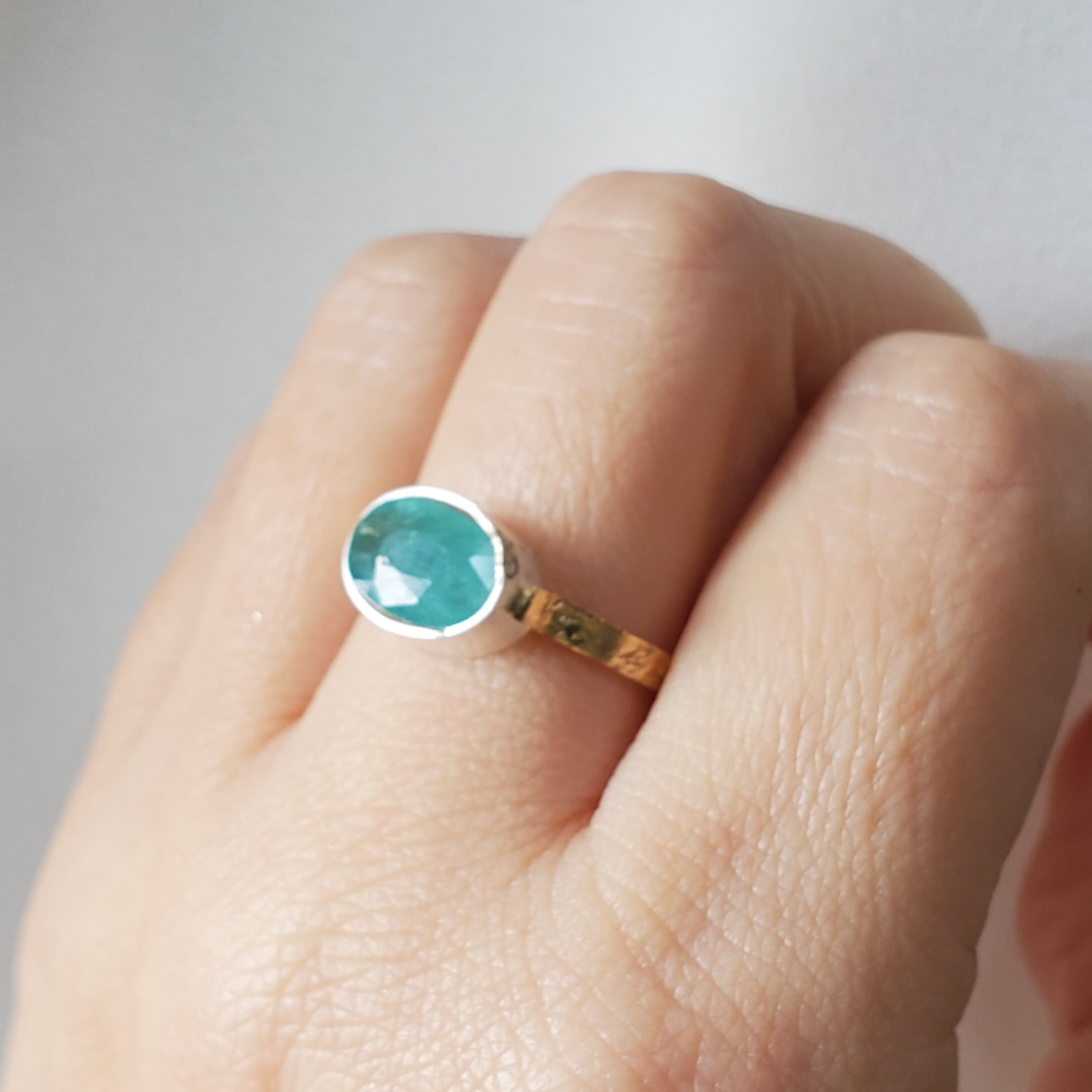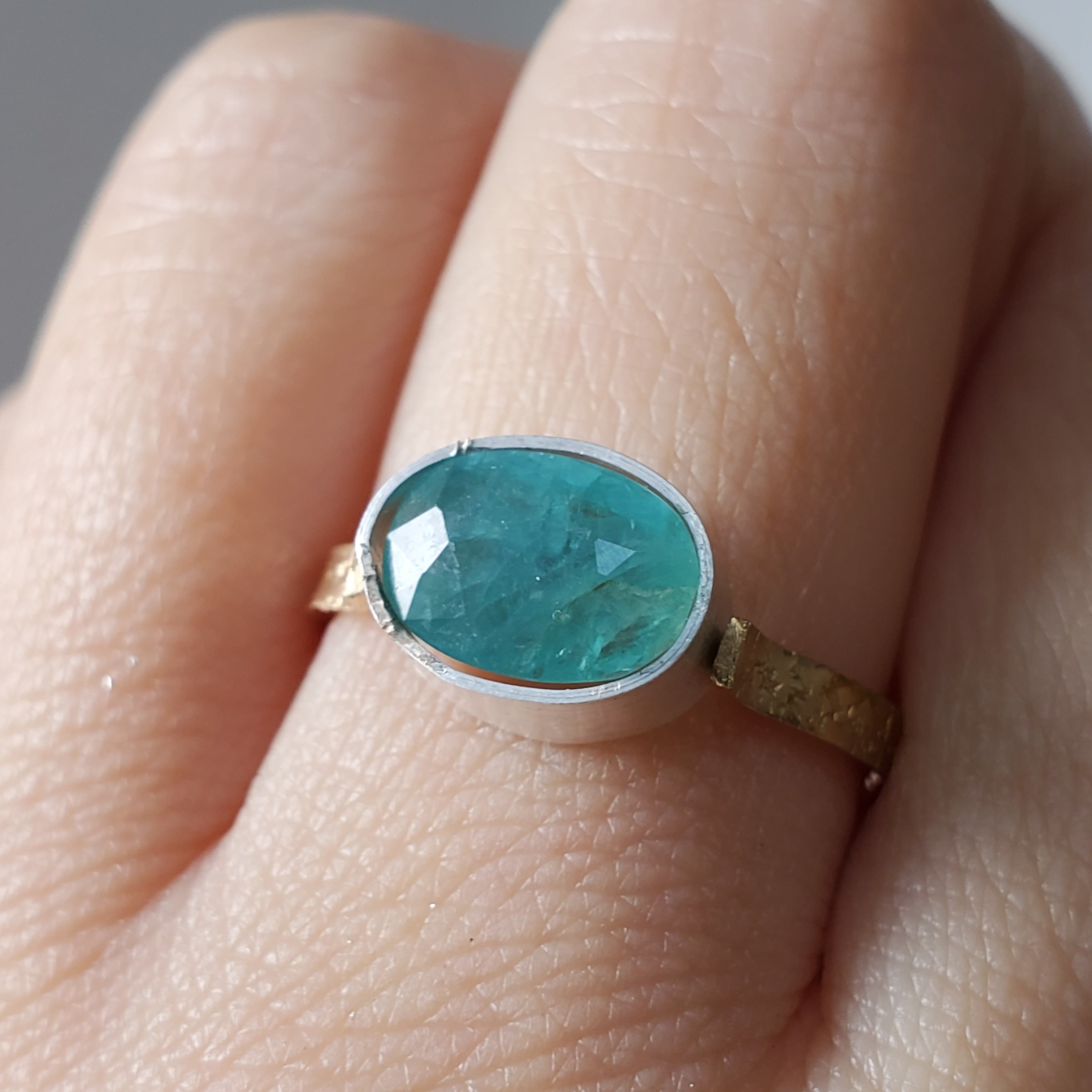 水色~ややグリーンみの色合いです。石の中に透明感のある部分ともやのような部分がいりまじって、水の波紋のような美しい表情を見せてくれます。