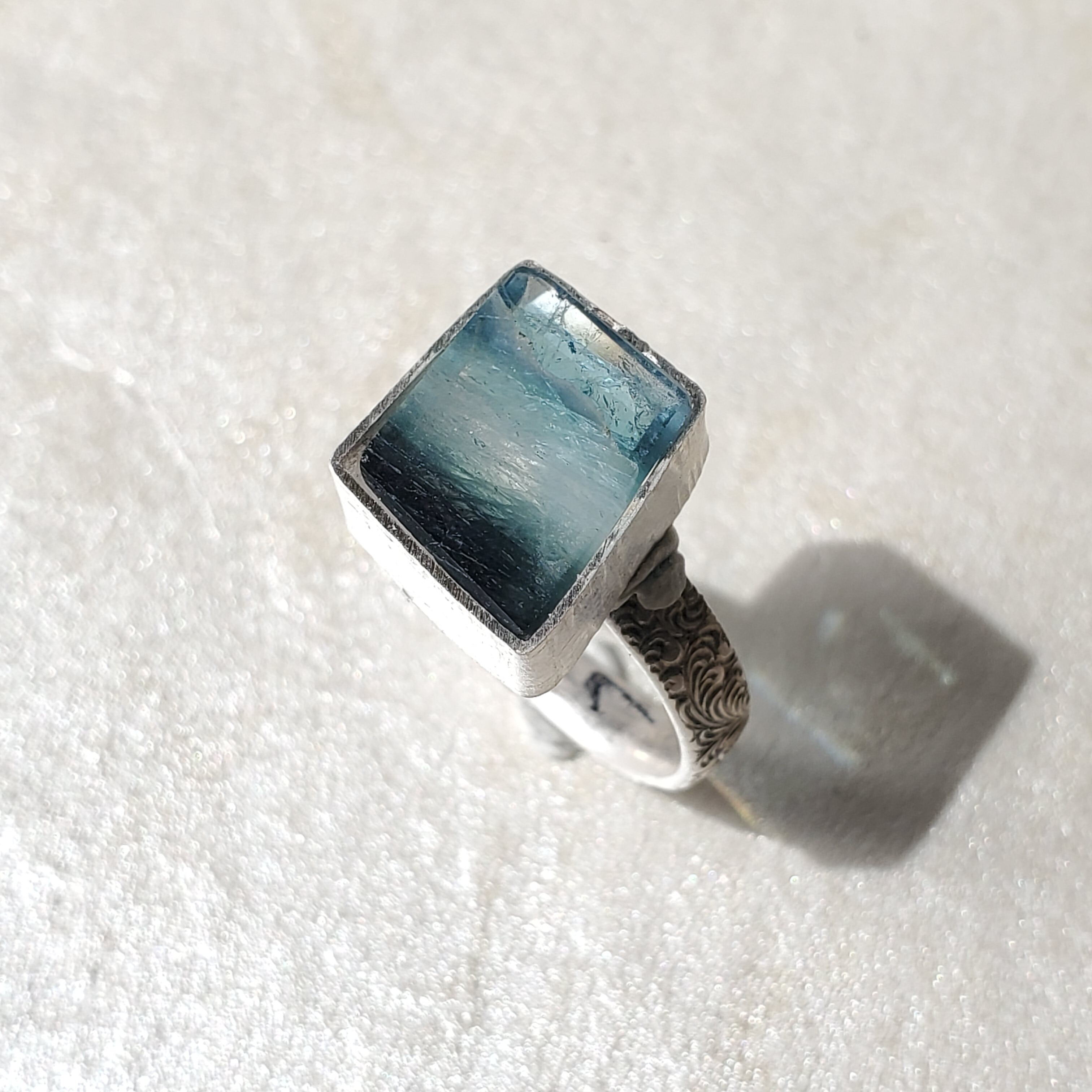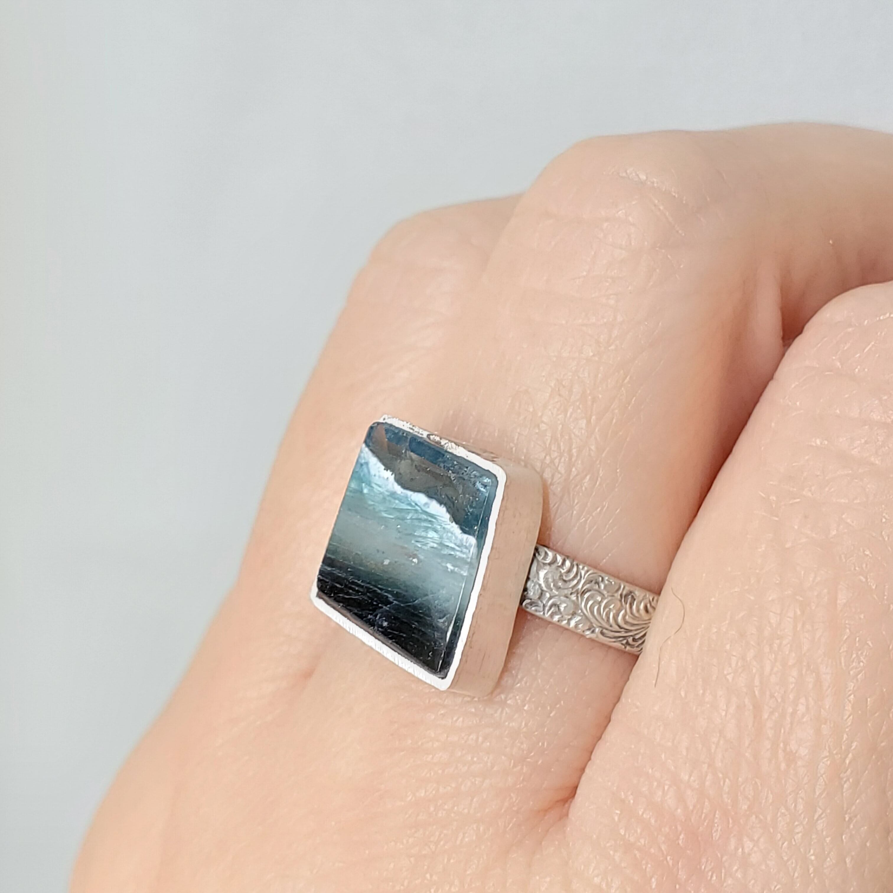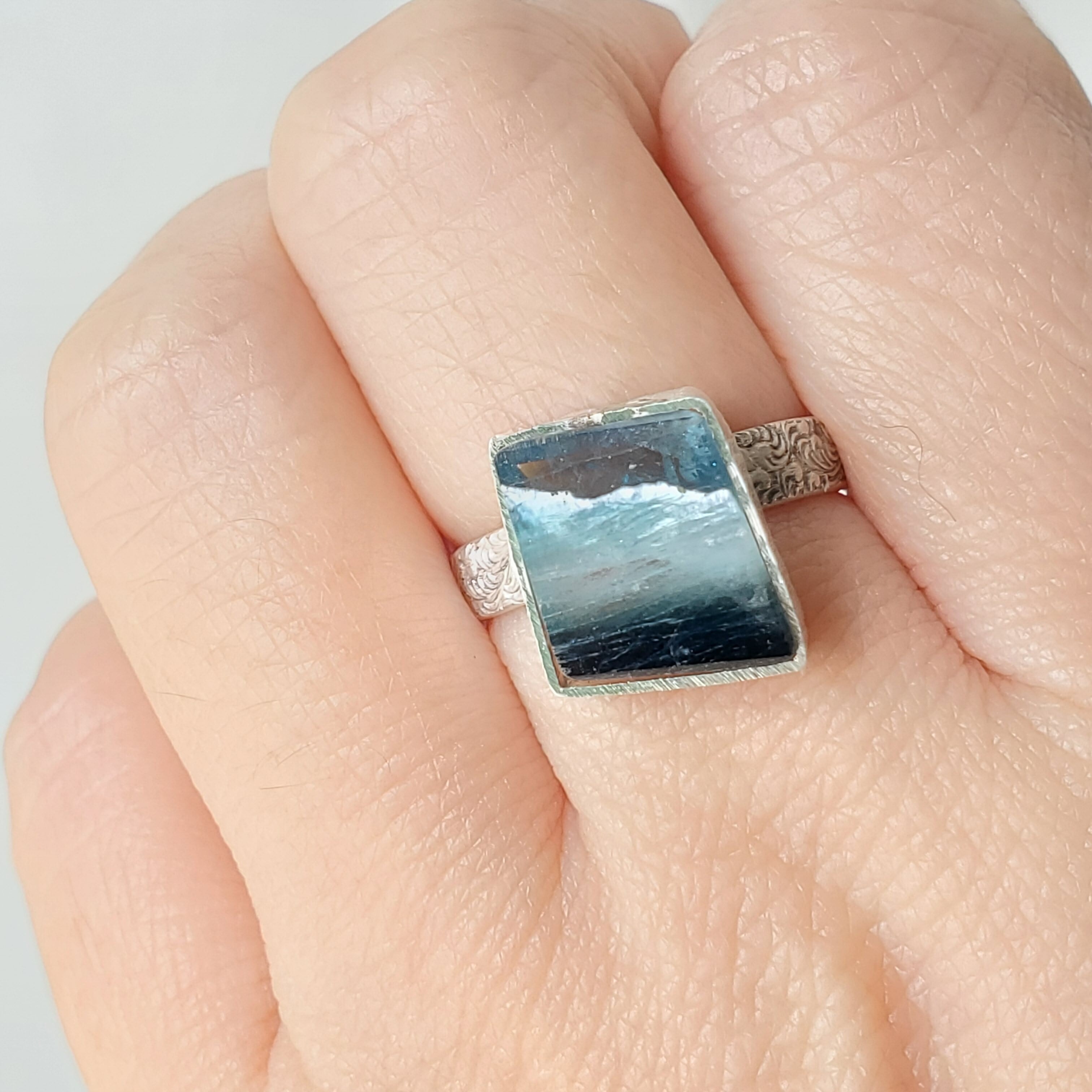 基本は黒からアイスブルーへ変わっていくバイカラーの石なんですけど、そこに白い層が入ってアクセントになっています。