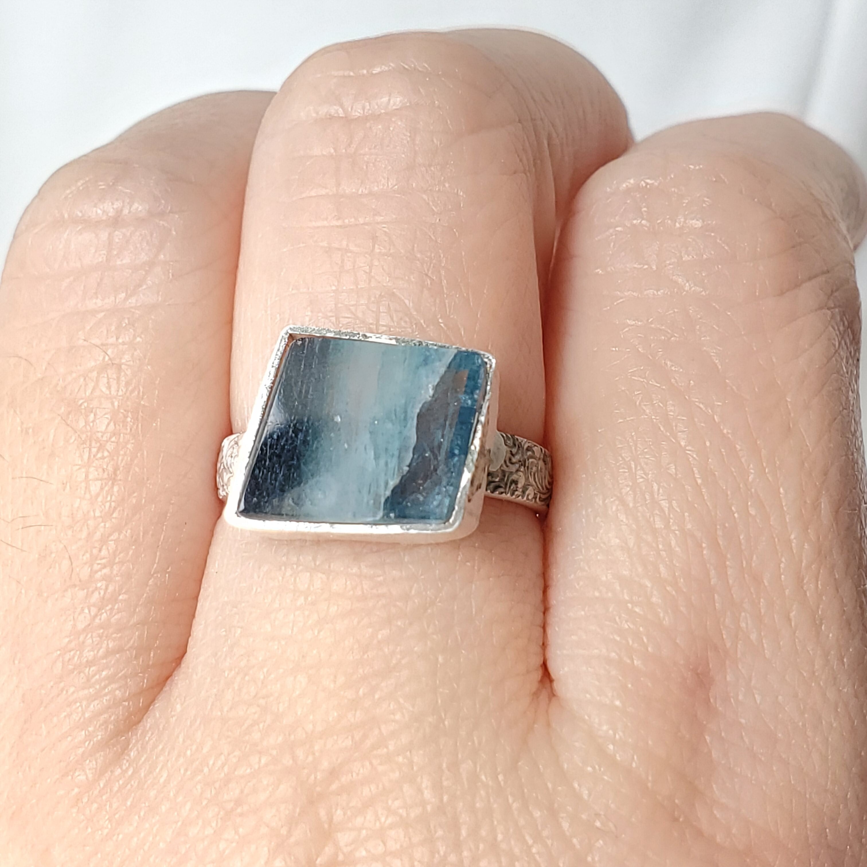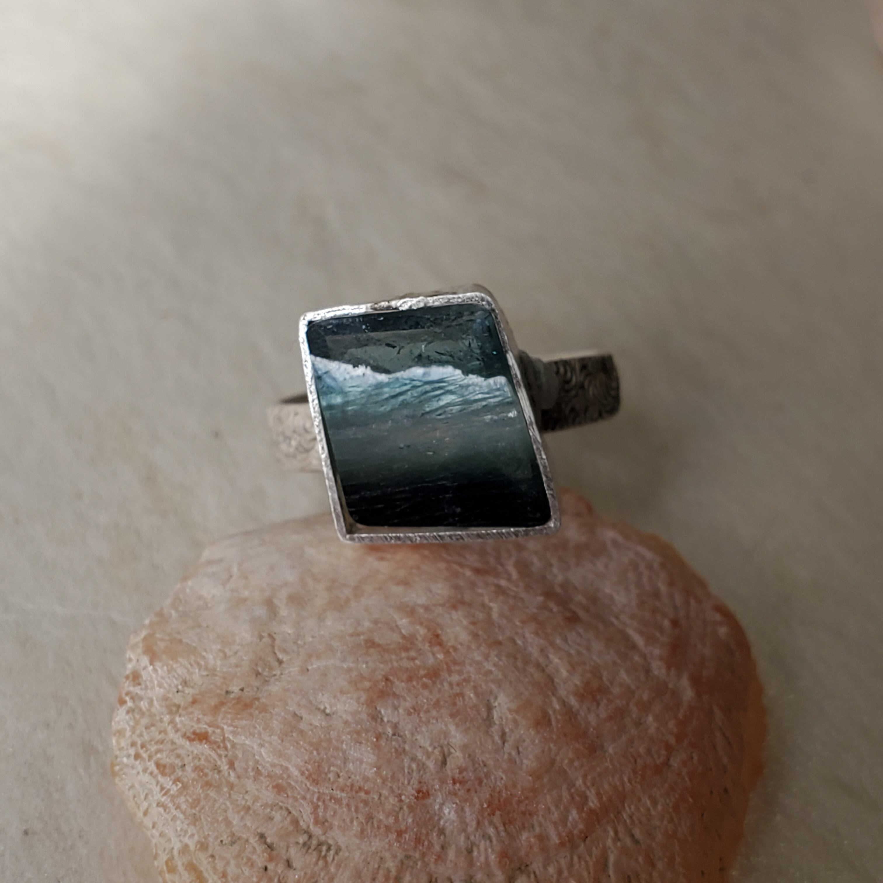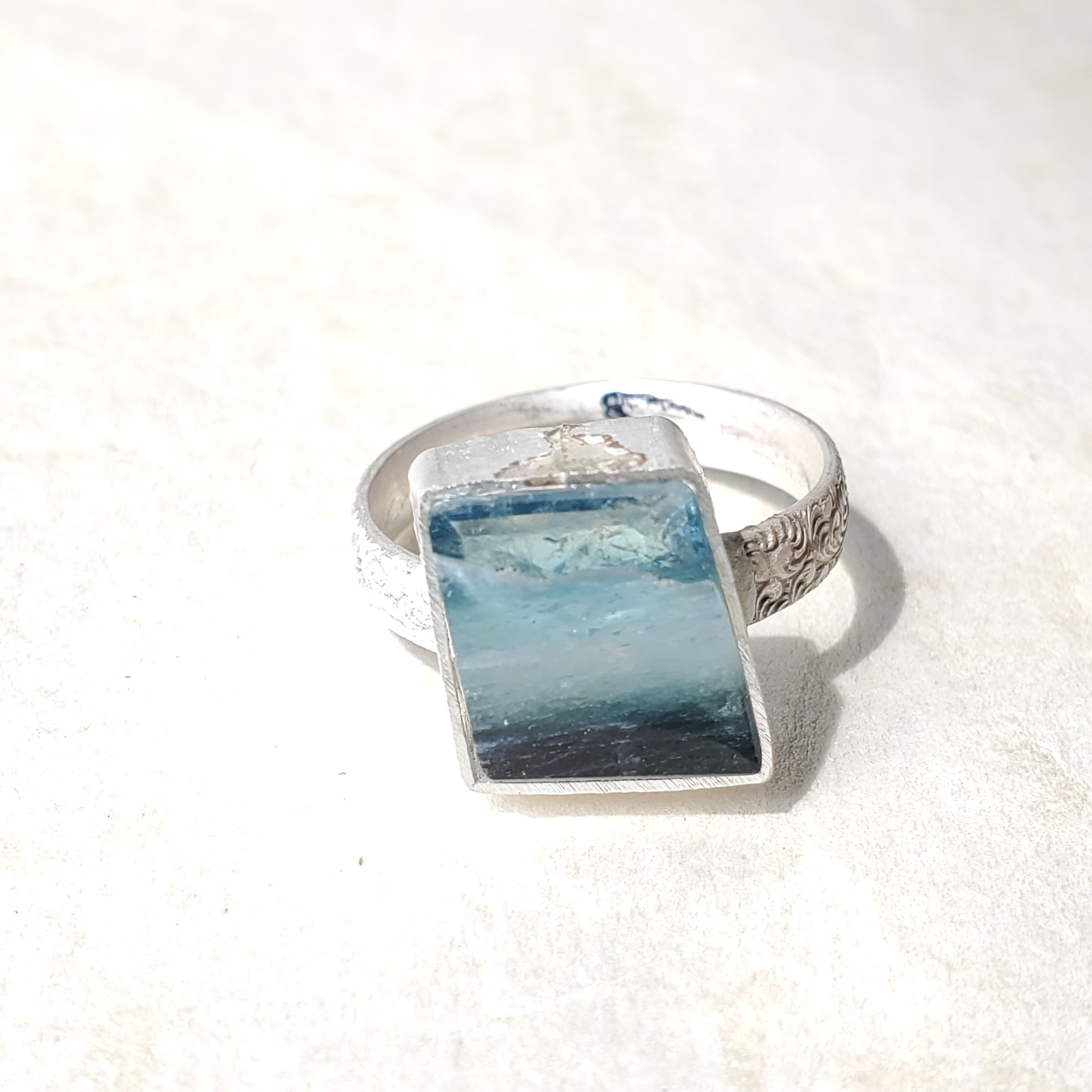 基本は黒からアイスブルーへ変わっていくバイカラーの石なんですけど、そこに白い層が入ってアクセントになっています。
