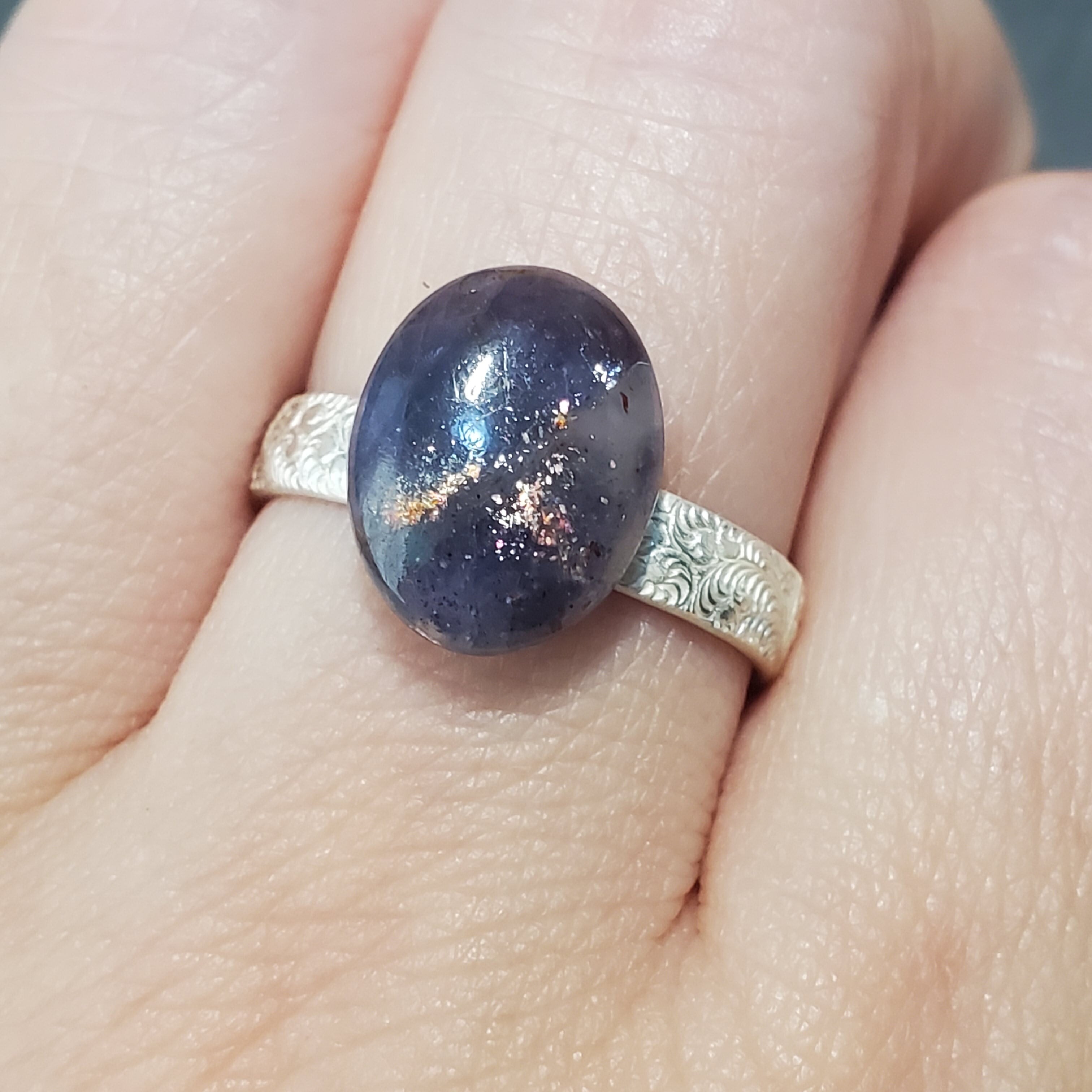 斜めに走るインクルージョンの輝きが詩情を感じさせます。角度が合った時のラメの輝きが強く存在感があります。