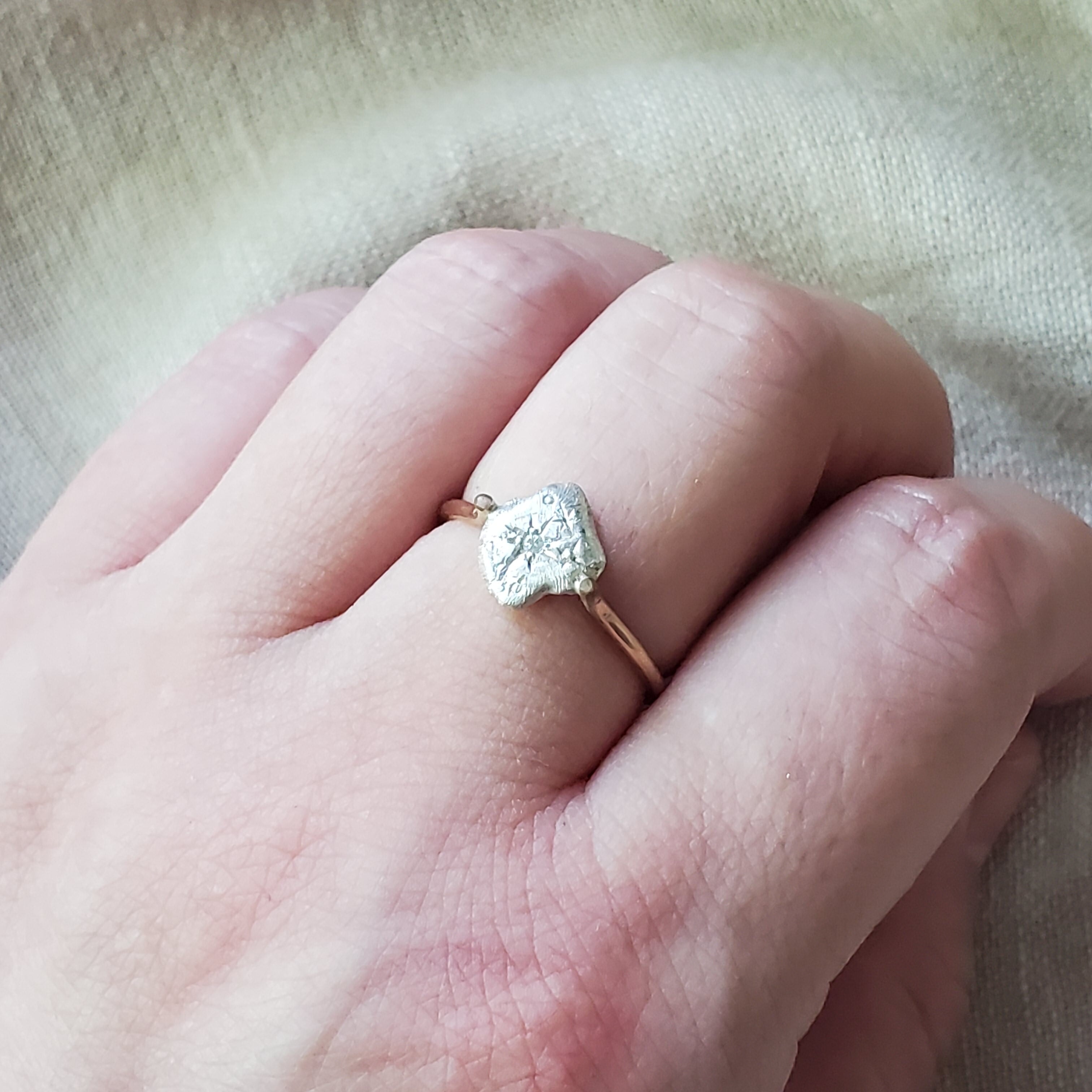 金属は硬質な性質の素材ですが、柔らかくとろんとしたホイップクリームのようなフォルムを持たせました。小さな天然ダイヤモンドが石留めしてあり、そのまわりにもいくつかの星が彫り込んであります。