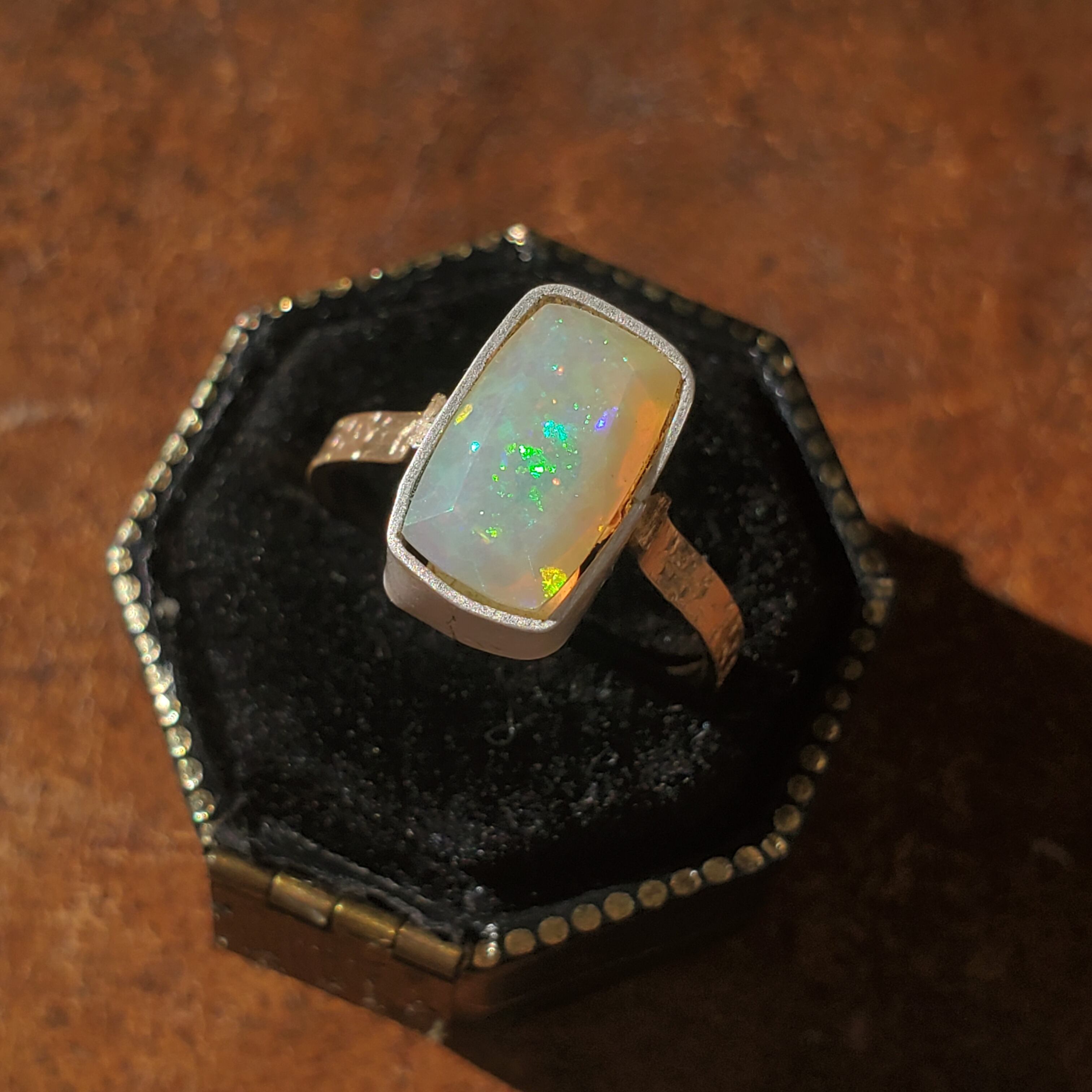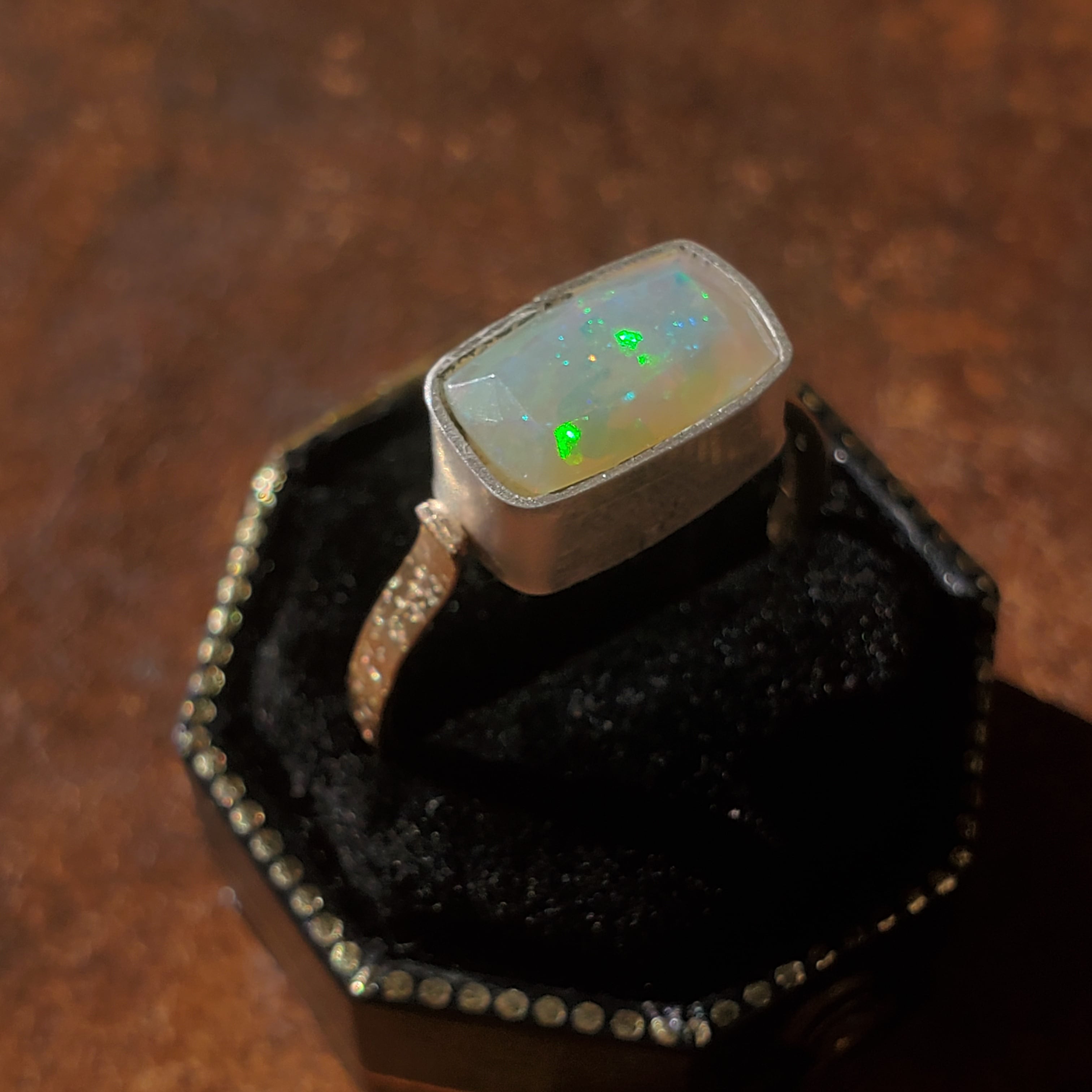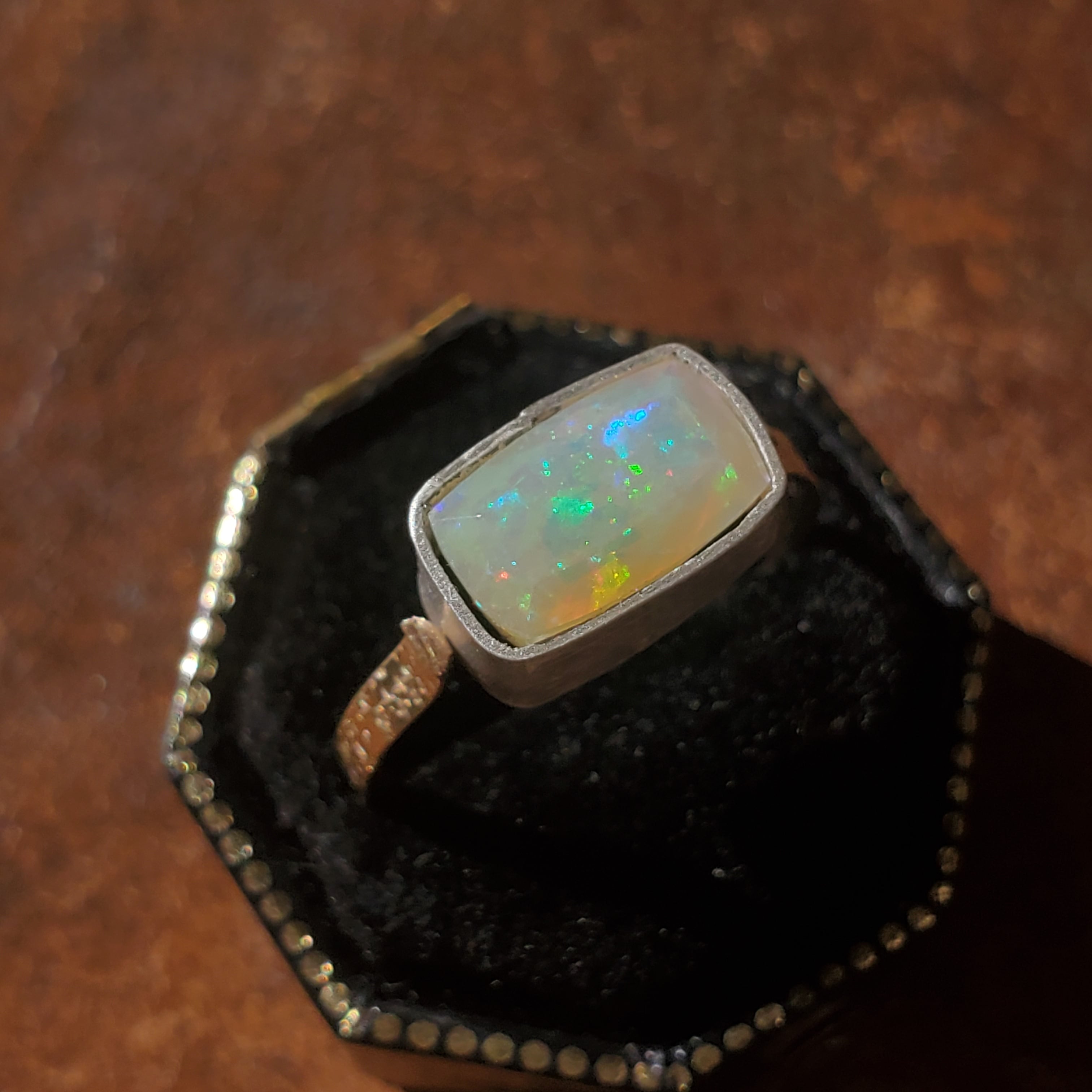 石の全面にピンフラッシュの遊色が入る珍しいタイプです。 オパールは不透明よりのクリームイエロー、遊色はライトグリーンをメインにオレンジ レッドが入ります。