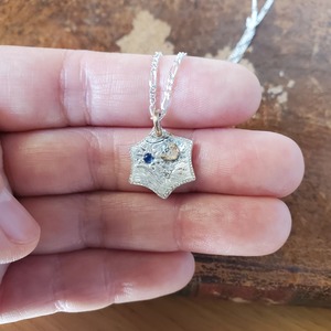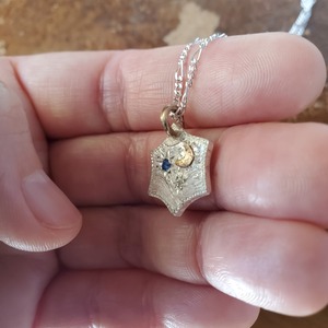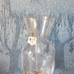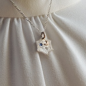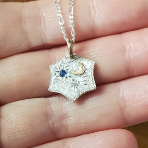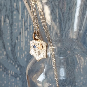 金色の月と輝く星をデザインしたネックレスです。月の部分は14KGFを貼り込み、ブルーの星がサファイア、白く輝く星がダイアモンドです。