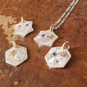 星の輝きや空の動きを細やかなシルク彫りで表現しています。丸カン部分はゴールドにして全体を引き締めるアクセントにしました。