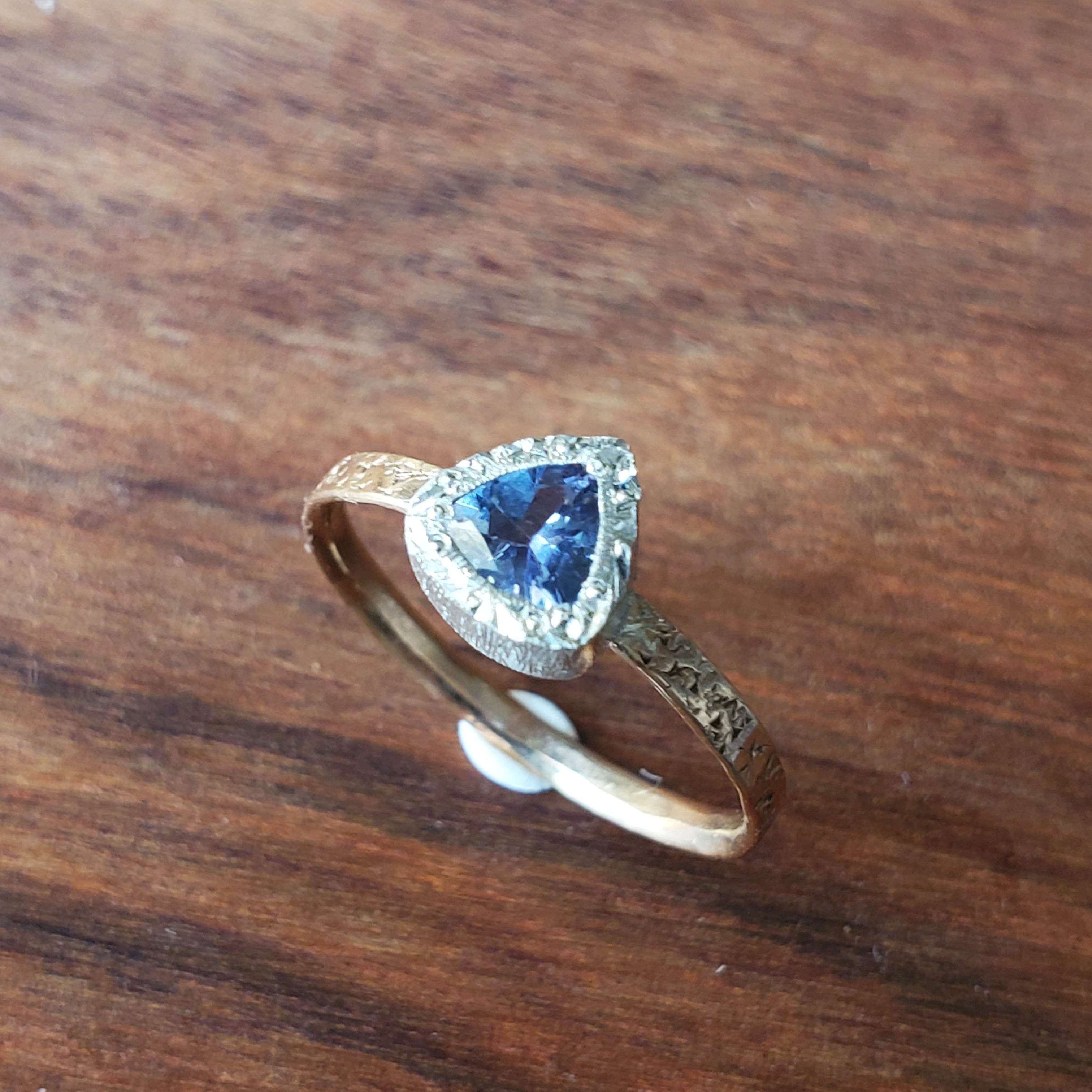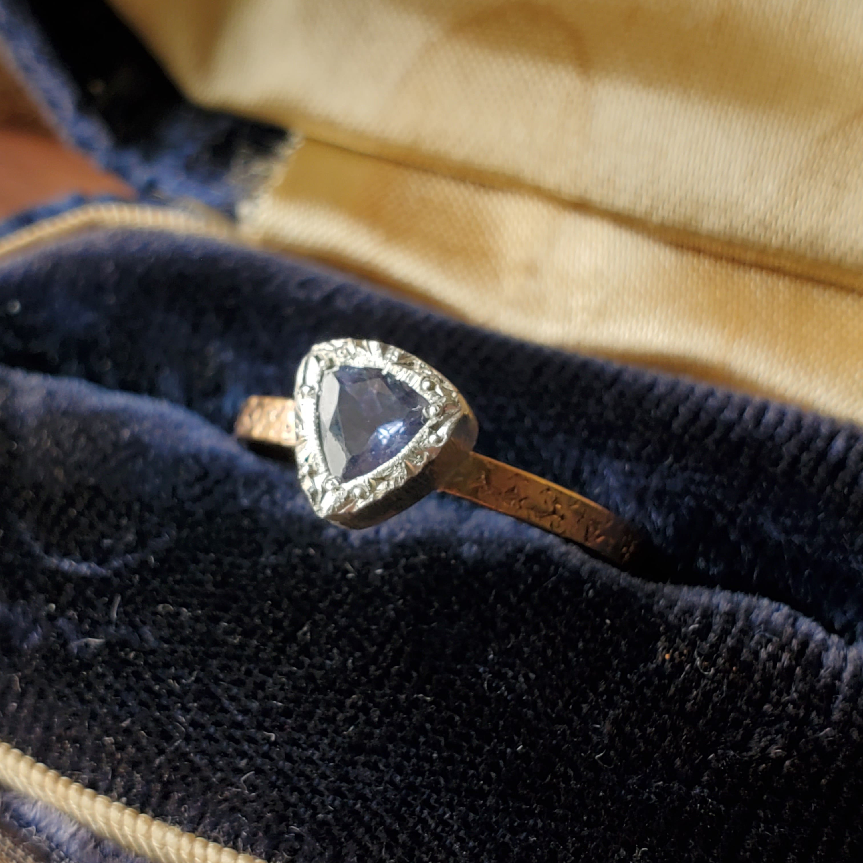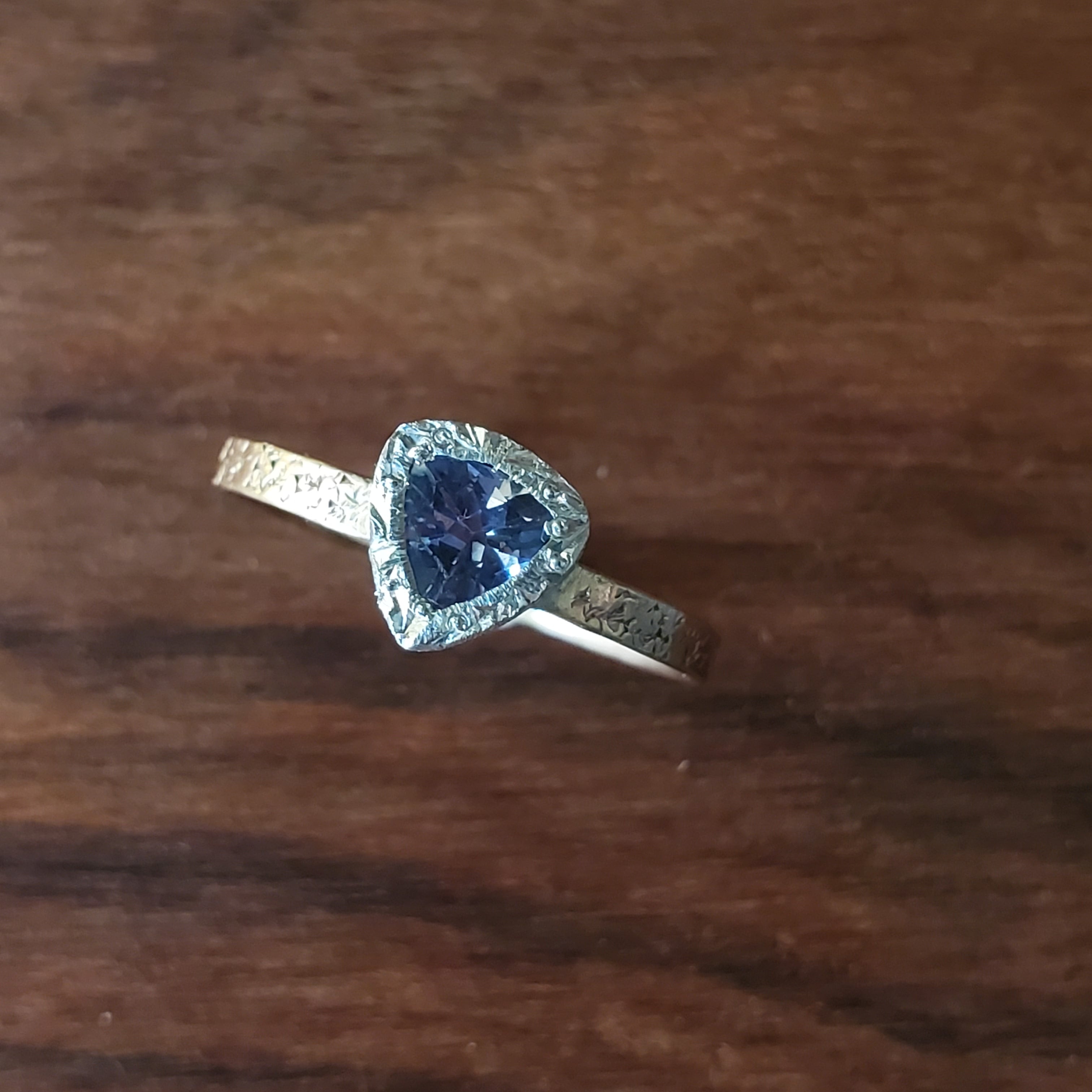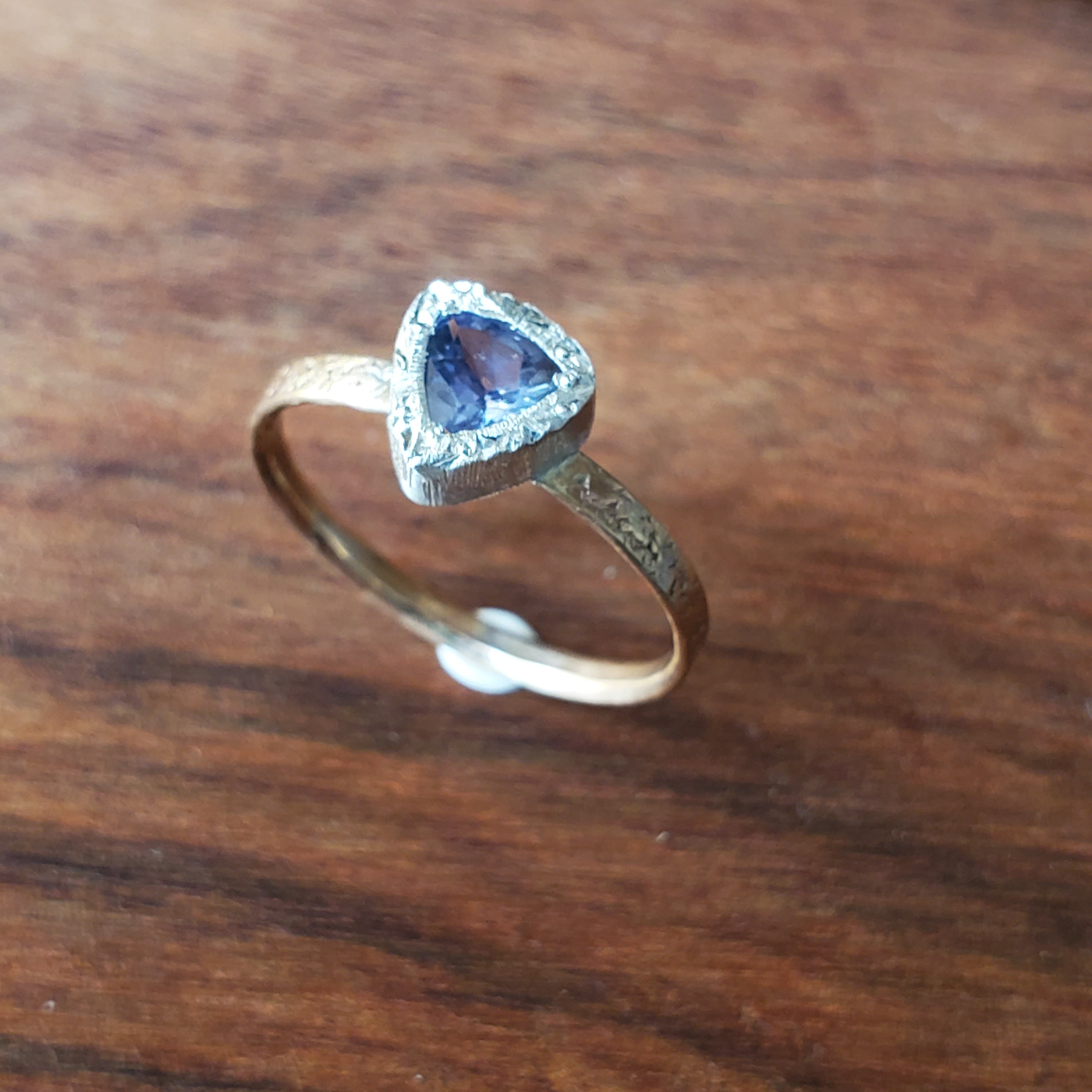タンザナイトの色合いはパープリッシュブルーで、切り子硝子のように光を取り込んで輝きます。(手でもっている画像くらいのキラキラ感があります。)