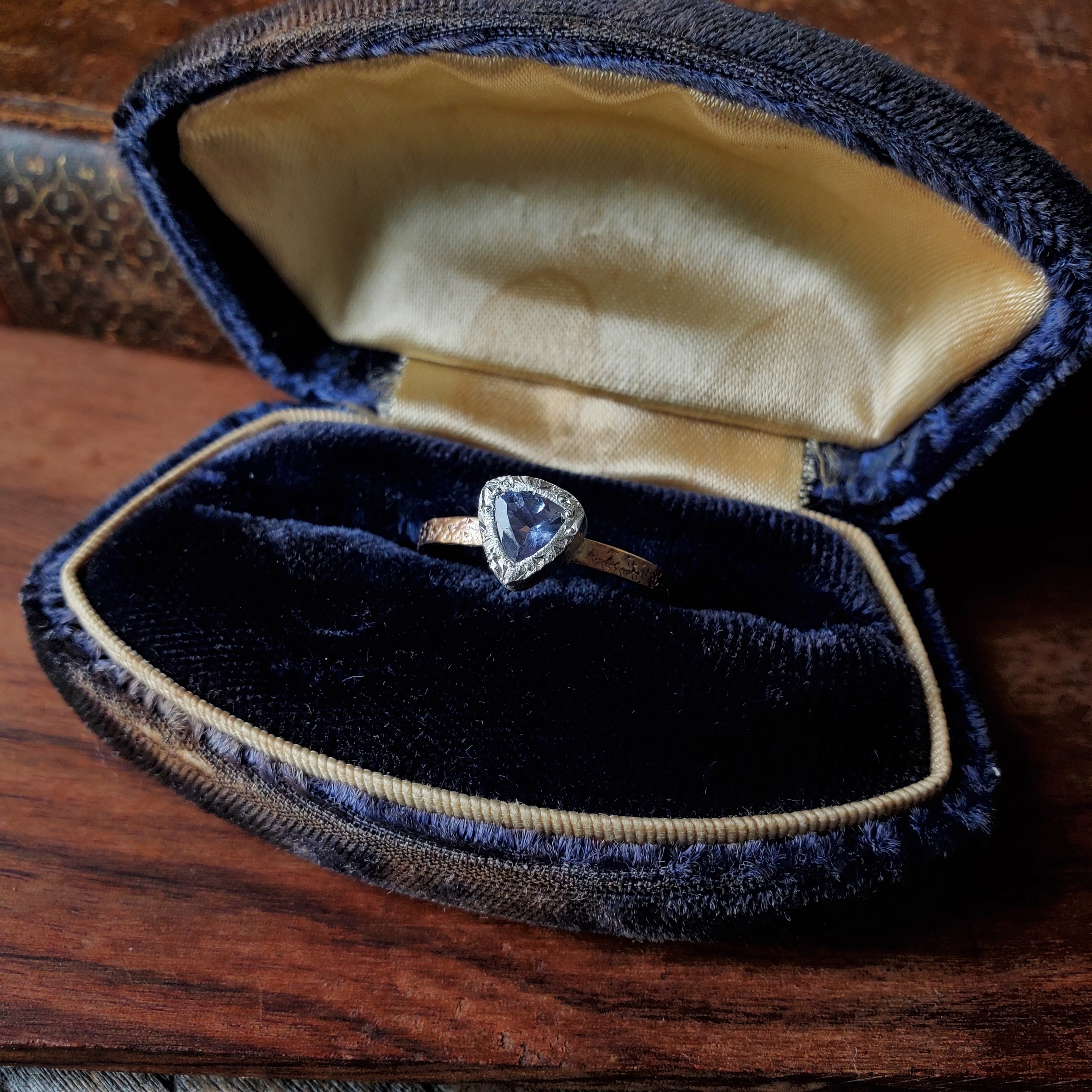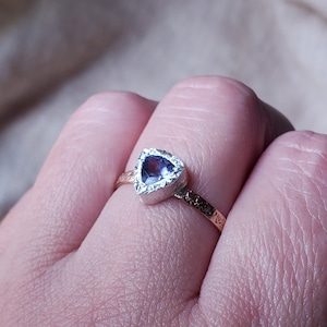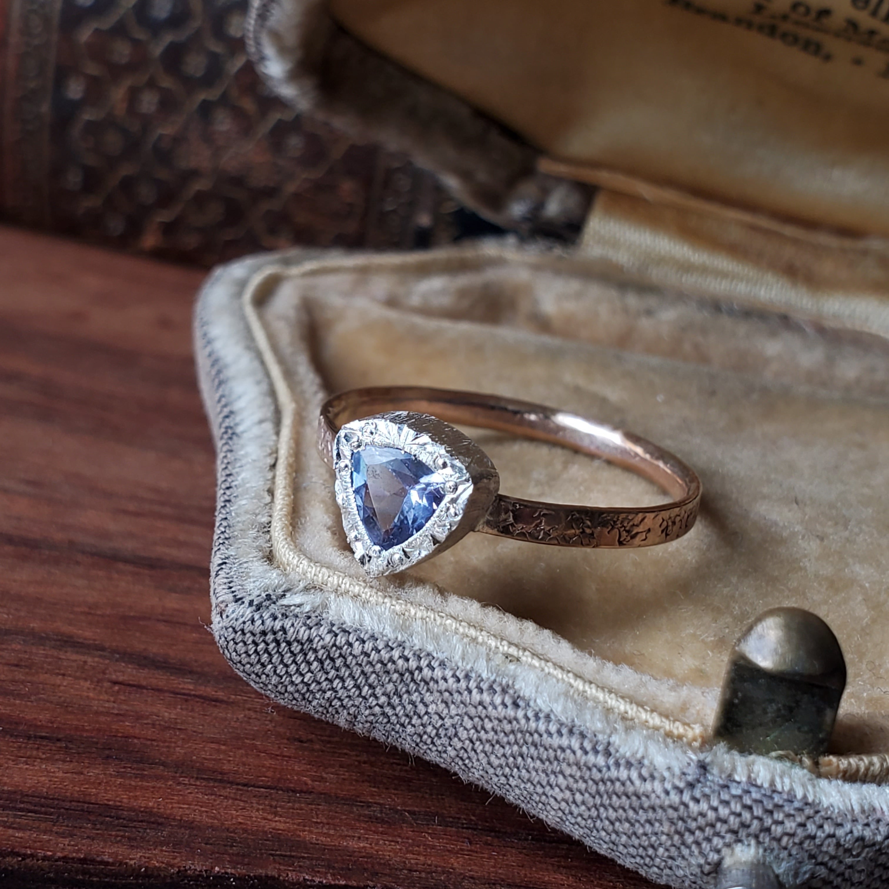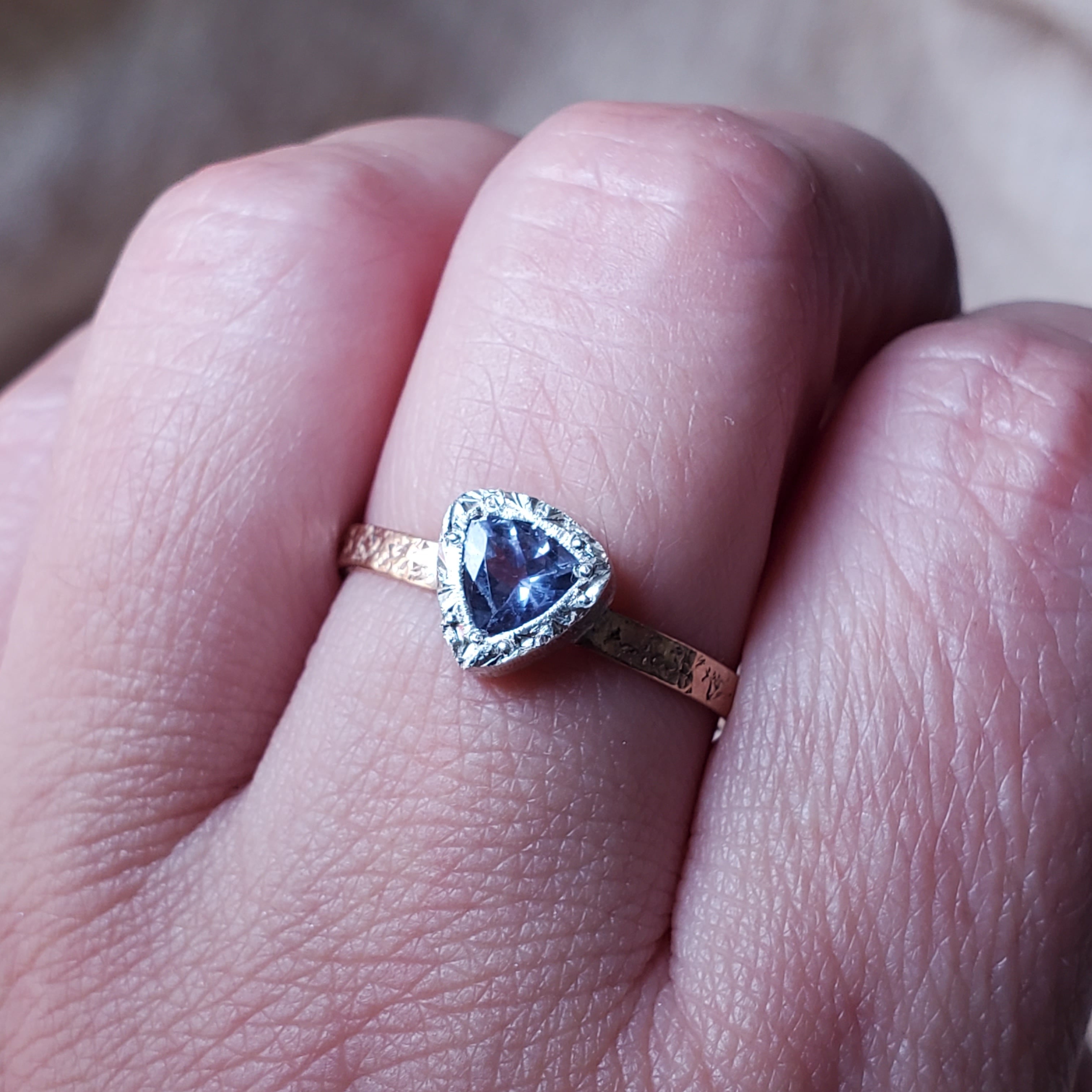 タンザナイトの色合いはパープリッシュブルーで、切り子硝子のように光を取り込んで輝きます。(手でもっている画像くらいのキラキラ感があります。)