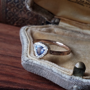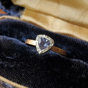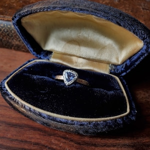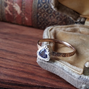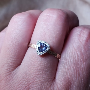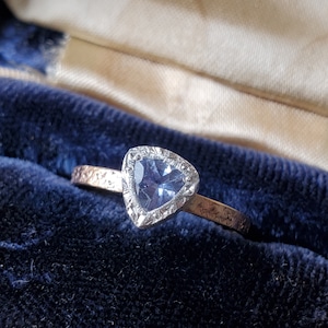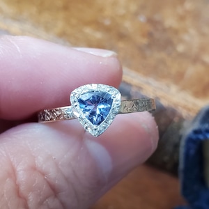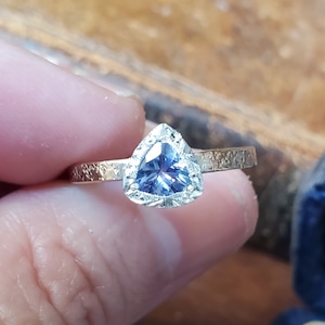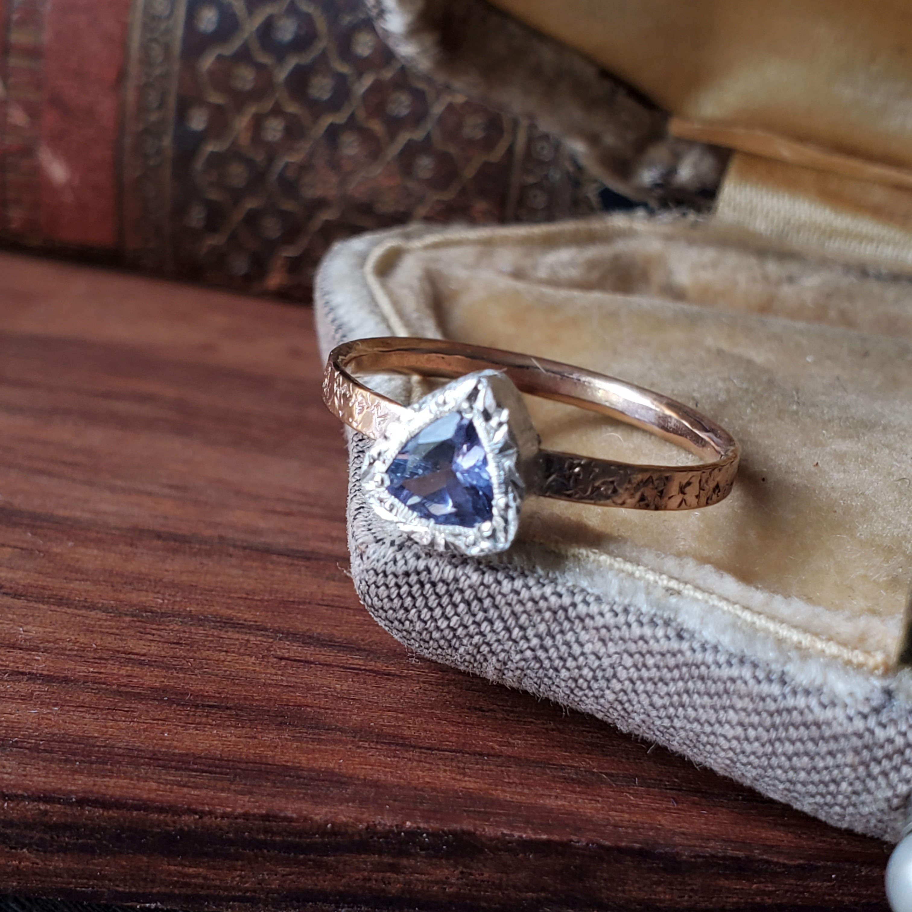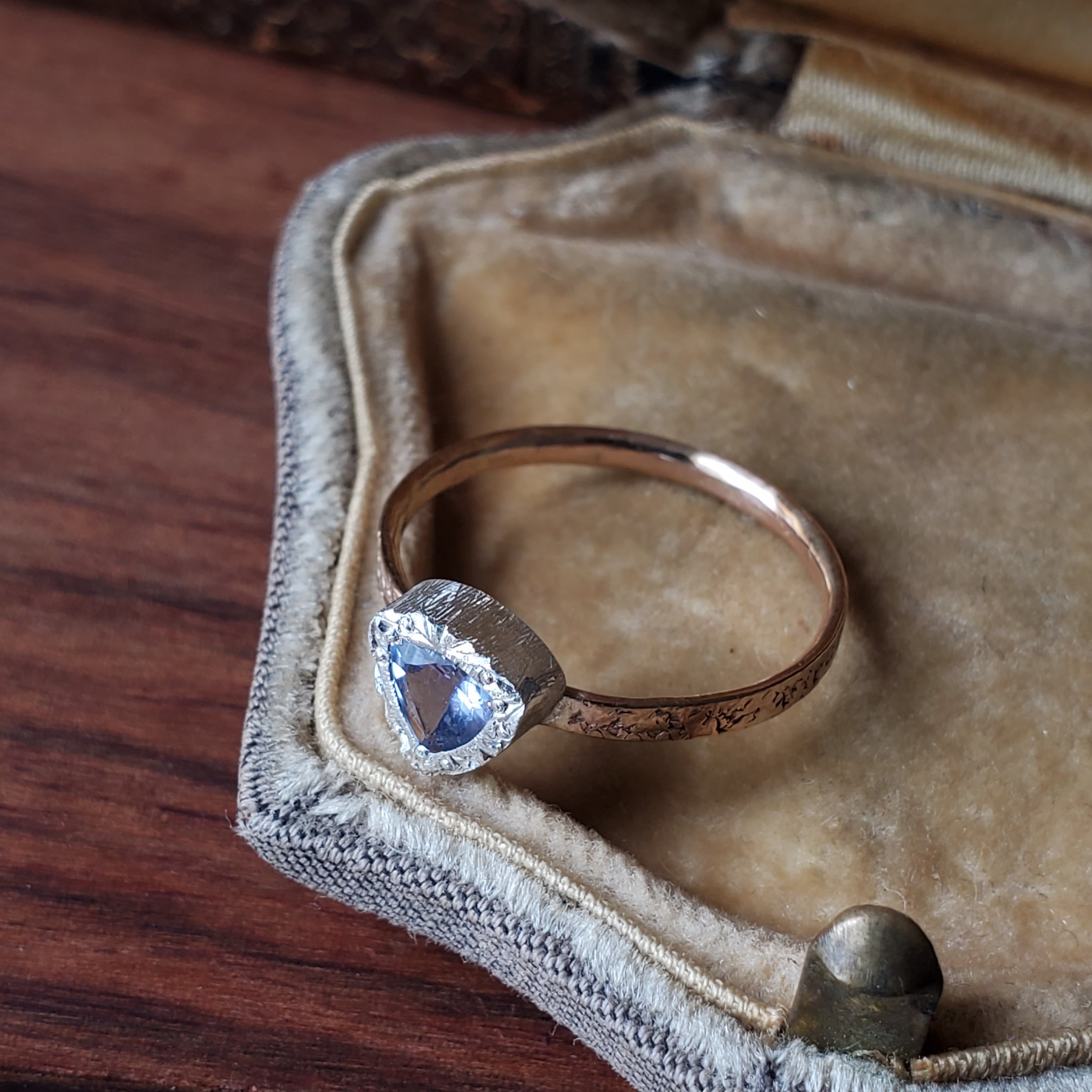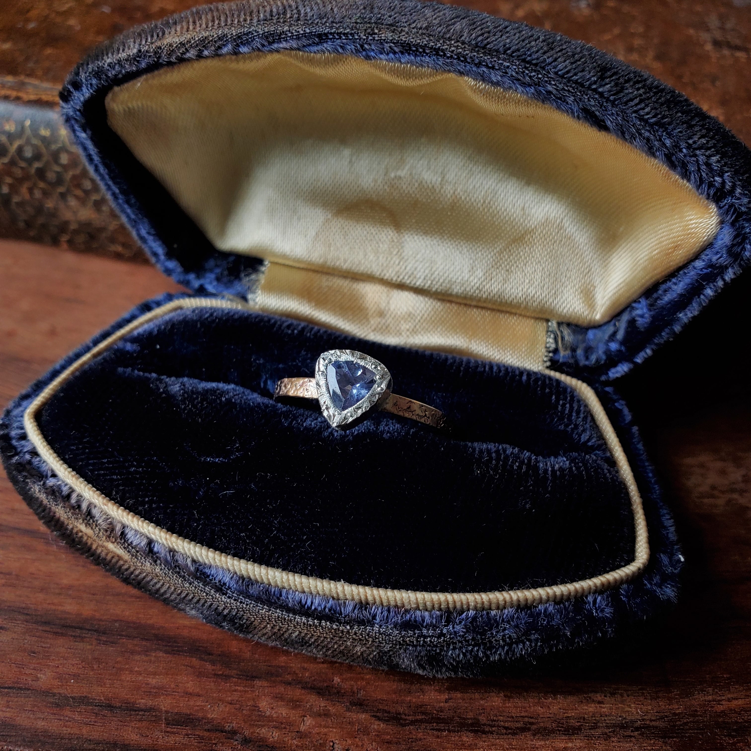 タンザナイトの色合いはパープリッシュブルーで、切り子硝子のように光を取り込んで輝きます。(手でもっている画像くらいのキラキラ感があります。)