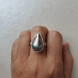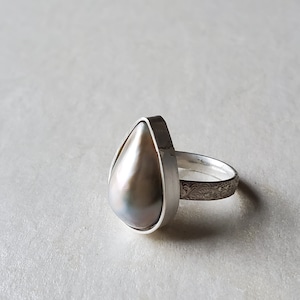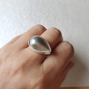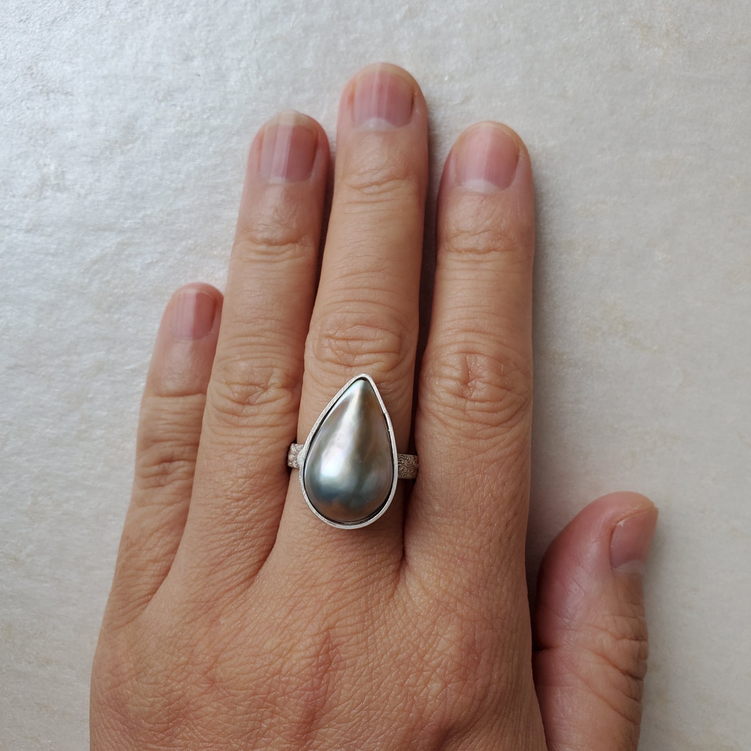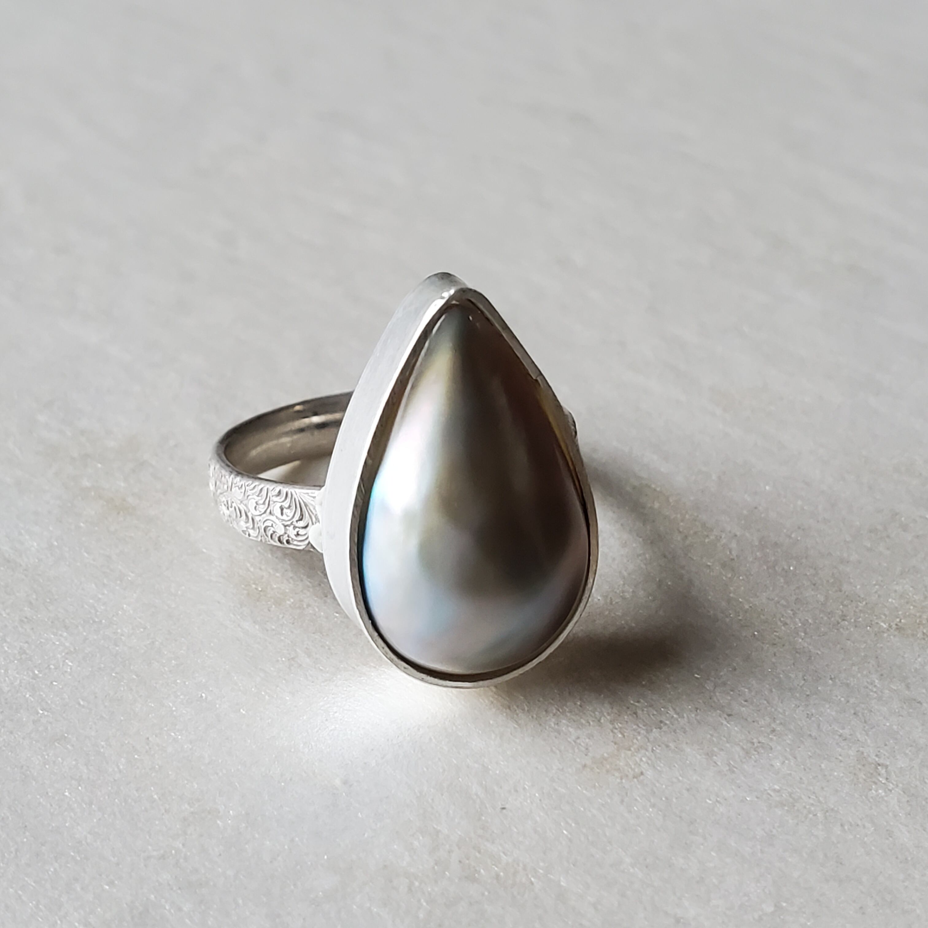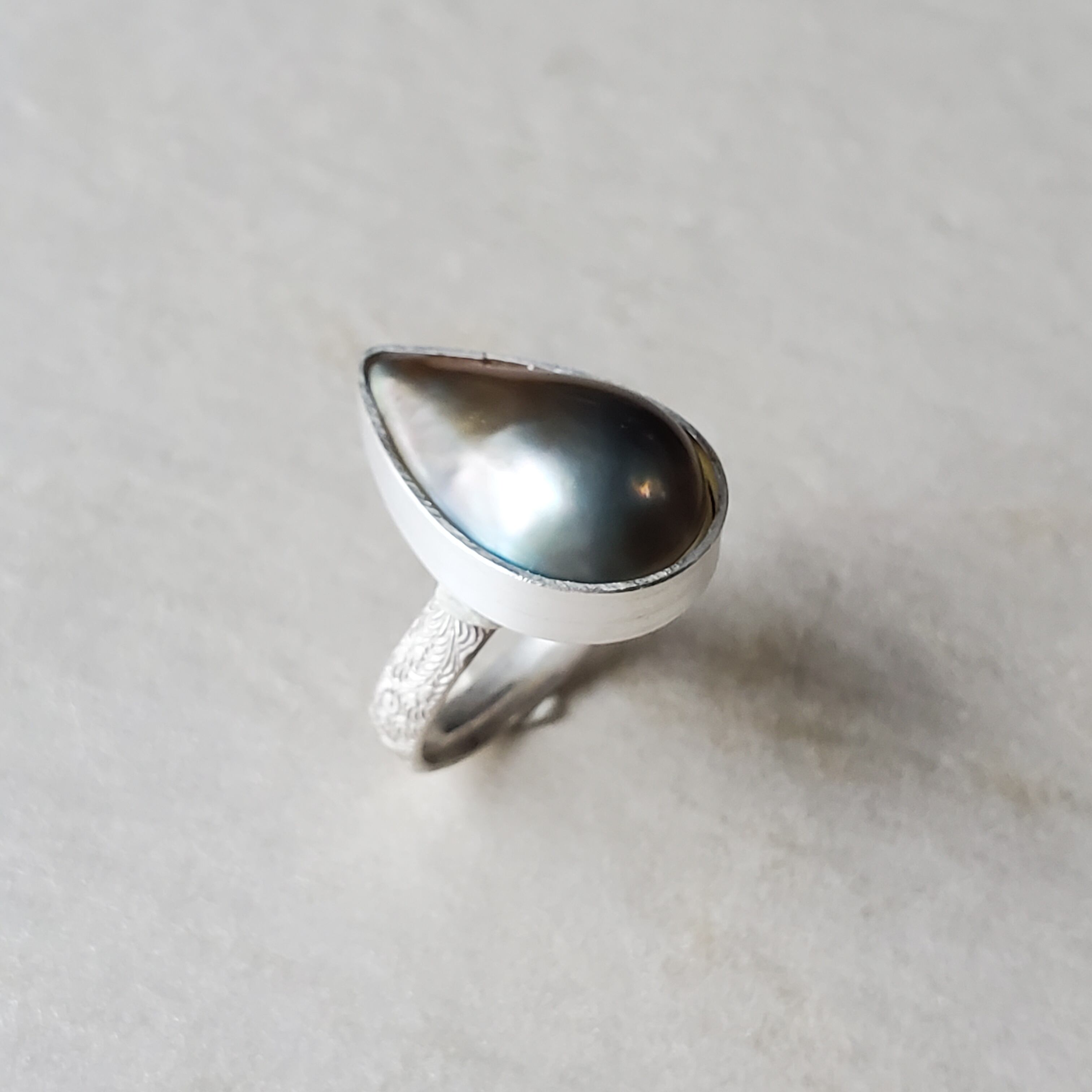 グレーの光沢が美しい大粒のマベパールです。まわりをぐるっと巻いてフクリンにしました。