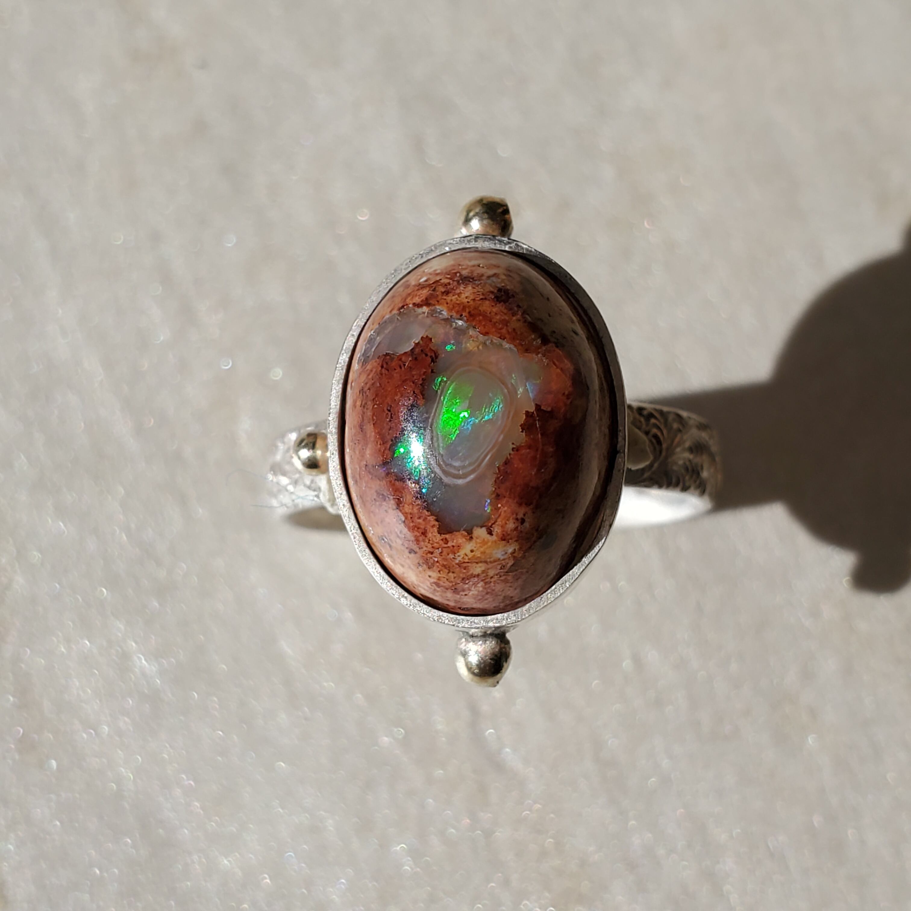 ベージュと茶色の混じりあった母岩。オパール自体はマットなグレージュっぽい色味ですが、緑や青の遊色がしっかり乗っています。