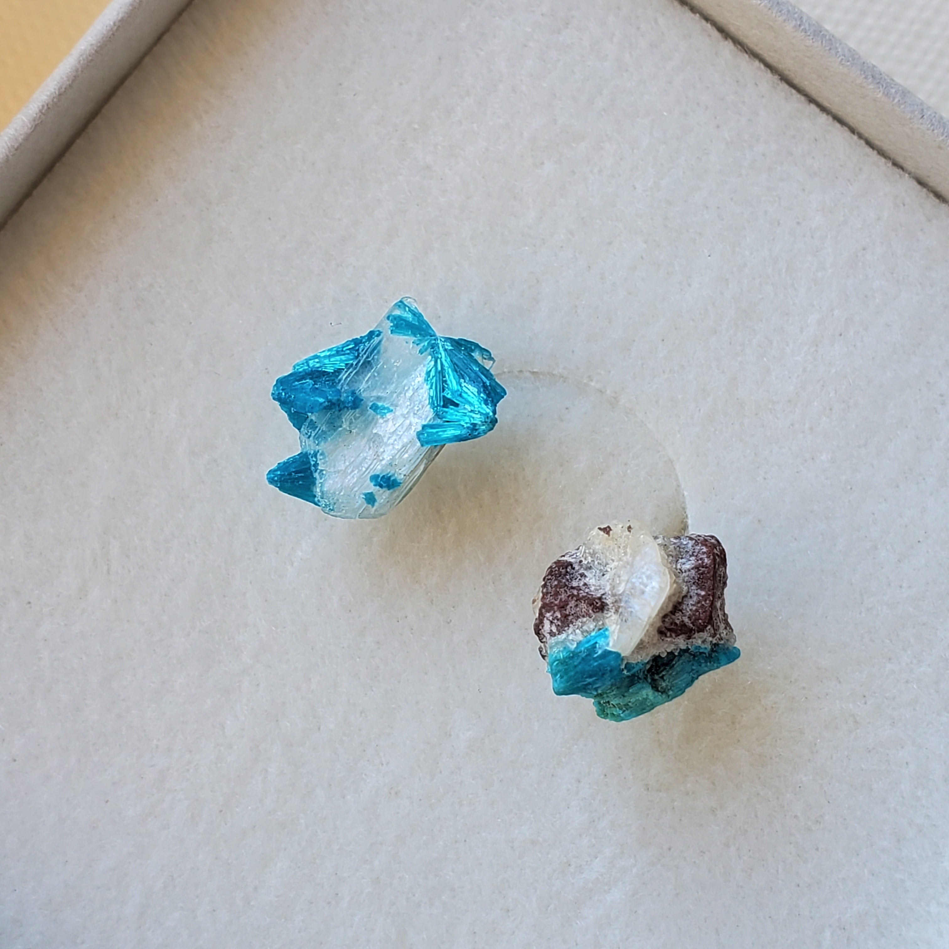 インド西部のプネーで産出します。鮮やかな青色はバナジウムによるものです。白い部分はスティルバイトという別の鉱物で、共生して産出されることが多いです。