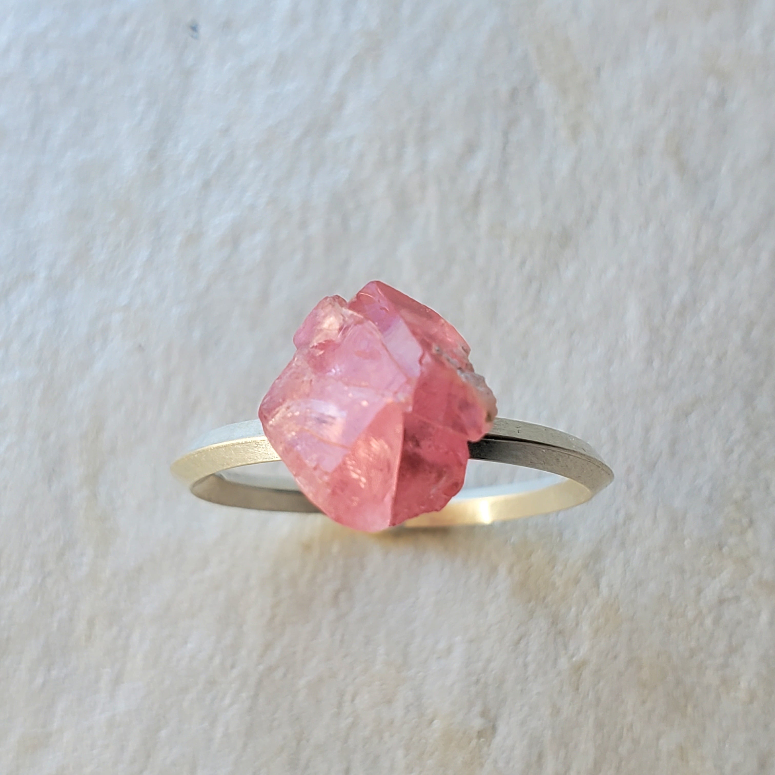 透明感のあるピンクが美しいロードクロサイトの鉱物リングです。