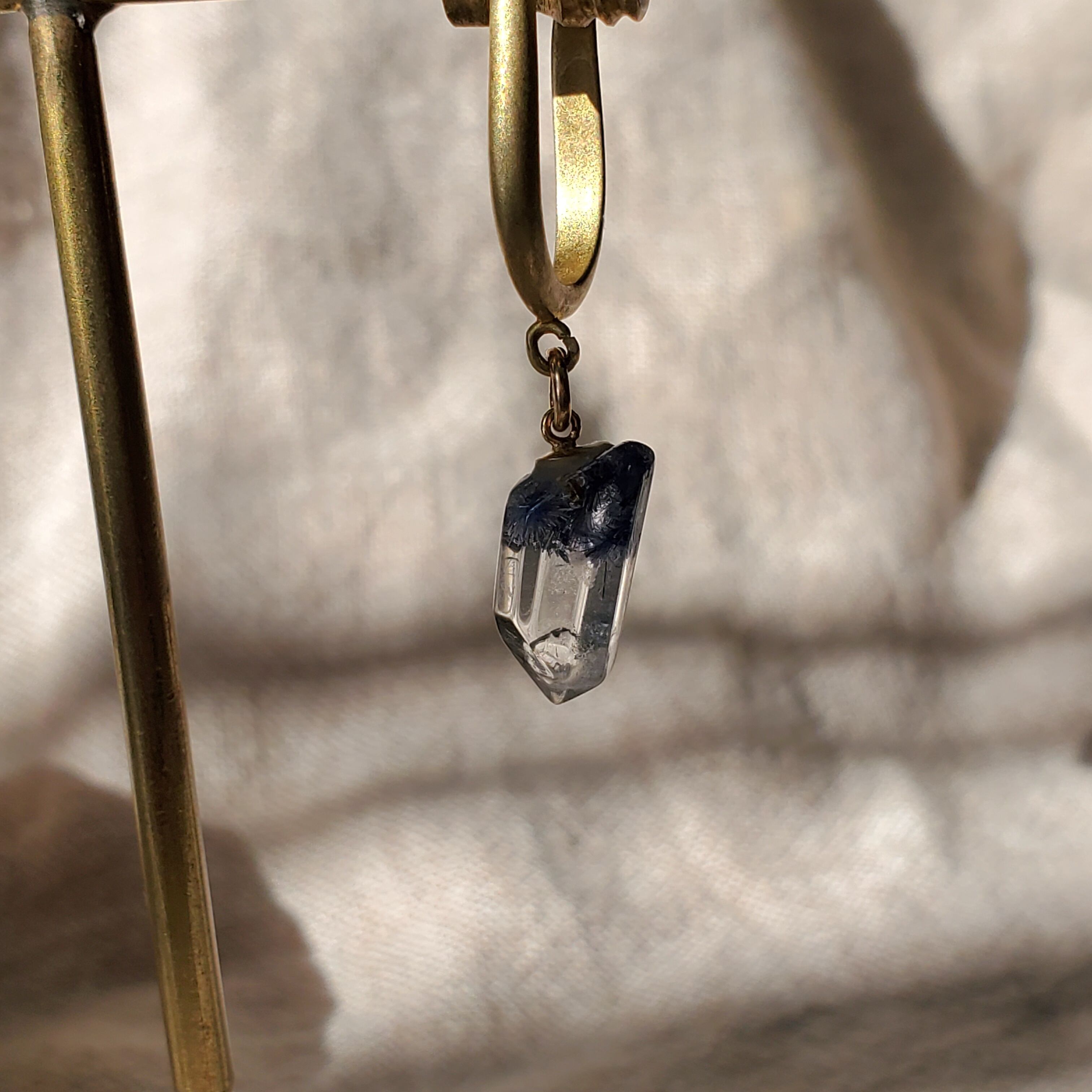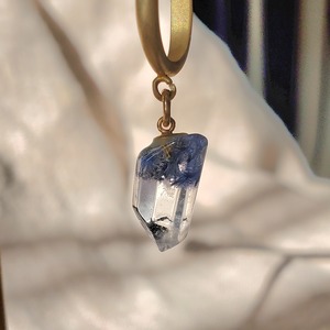 デュモルチェライトインクォーツの結晶に穴をあけて金具をつけました。鉱物の存在感がそのまま楽しめます。