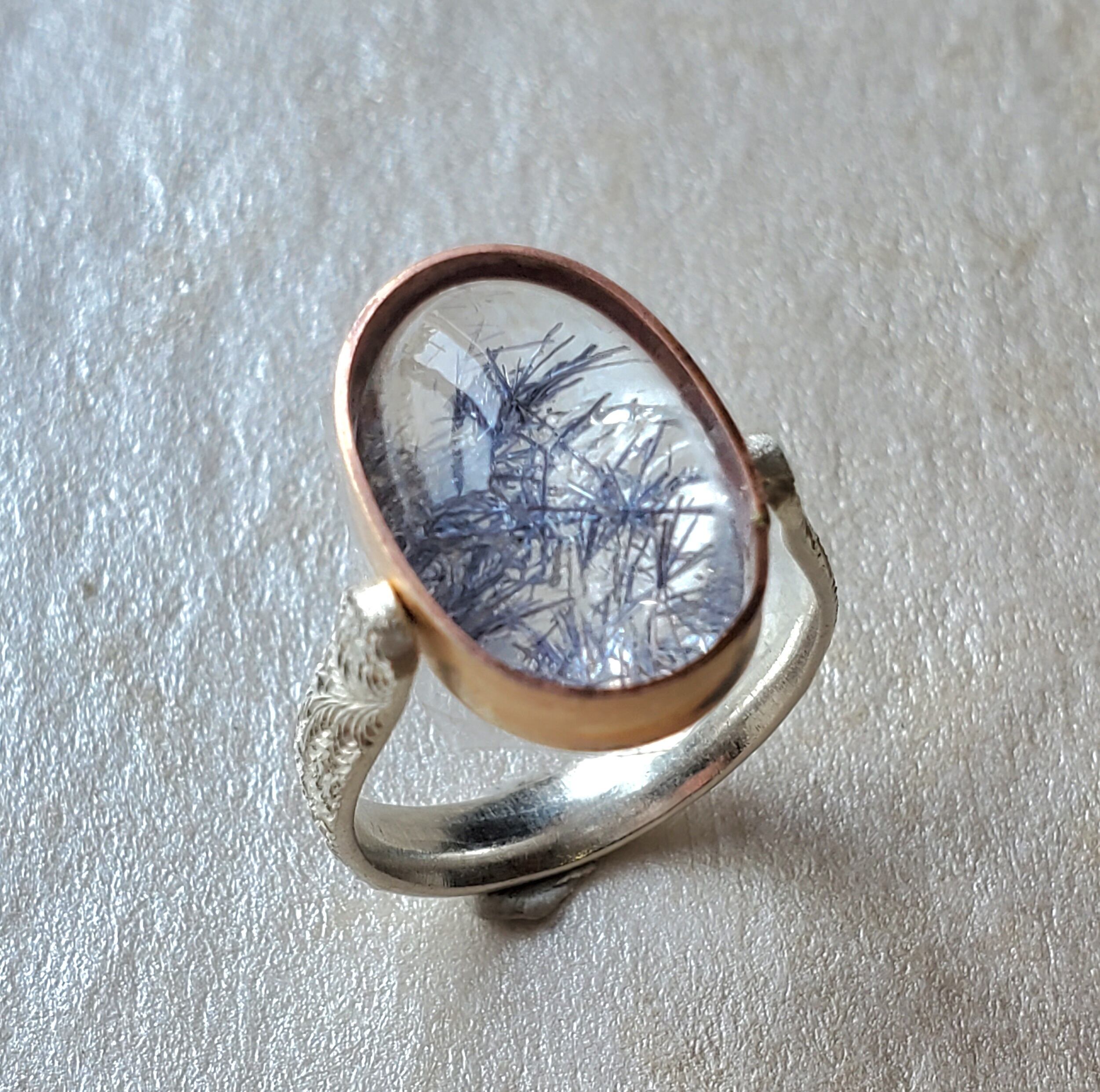 透明度の高いクォーツの中に、デュモルチェライトの結晶がびっしりと入っています。