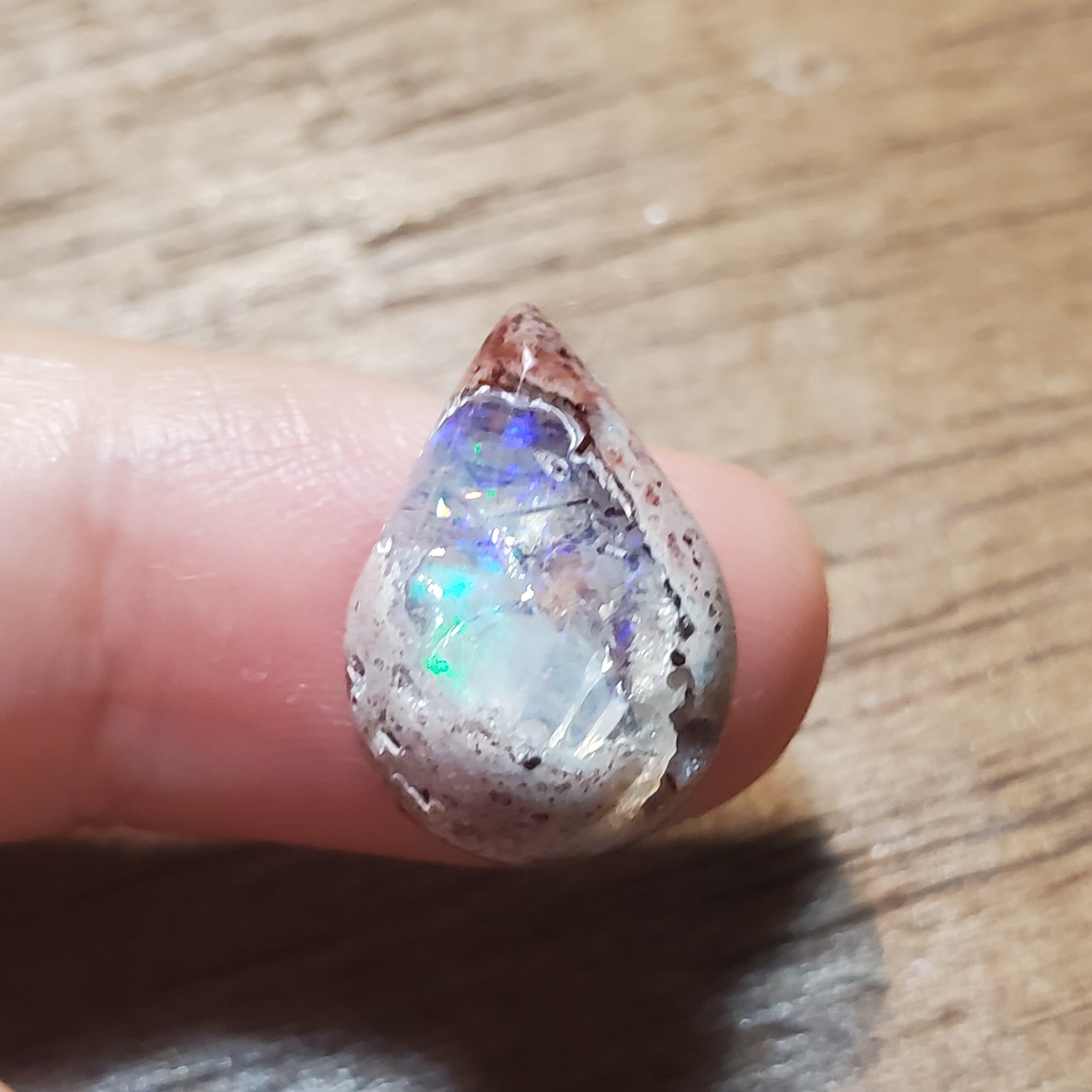 白っぽいベージュの母岩にクリアカラーのオパールです。オパールは一部、波立つように白くなっています。遊色はネオンブルー、グリーンの寒色系です。