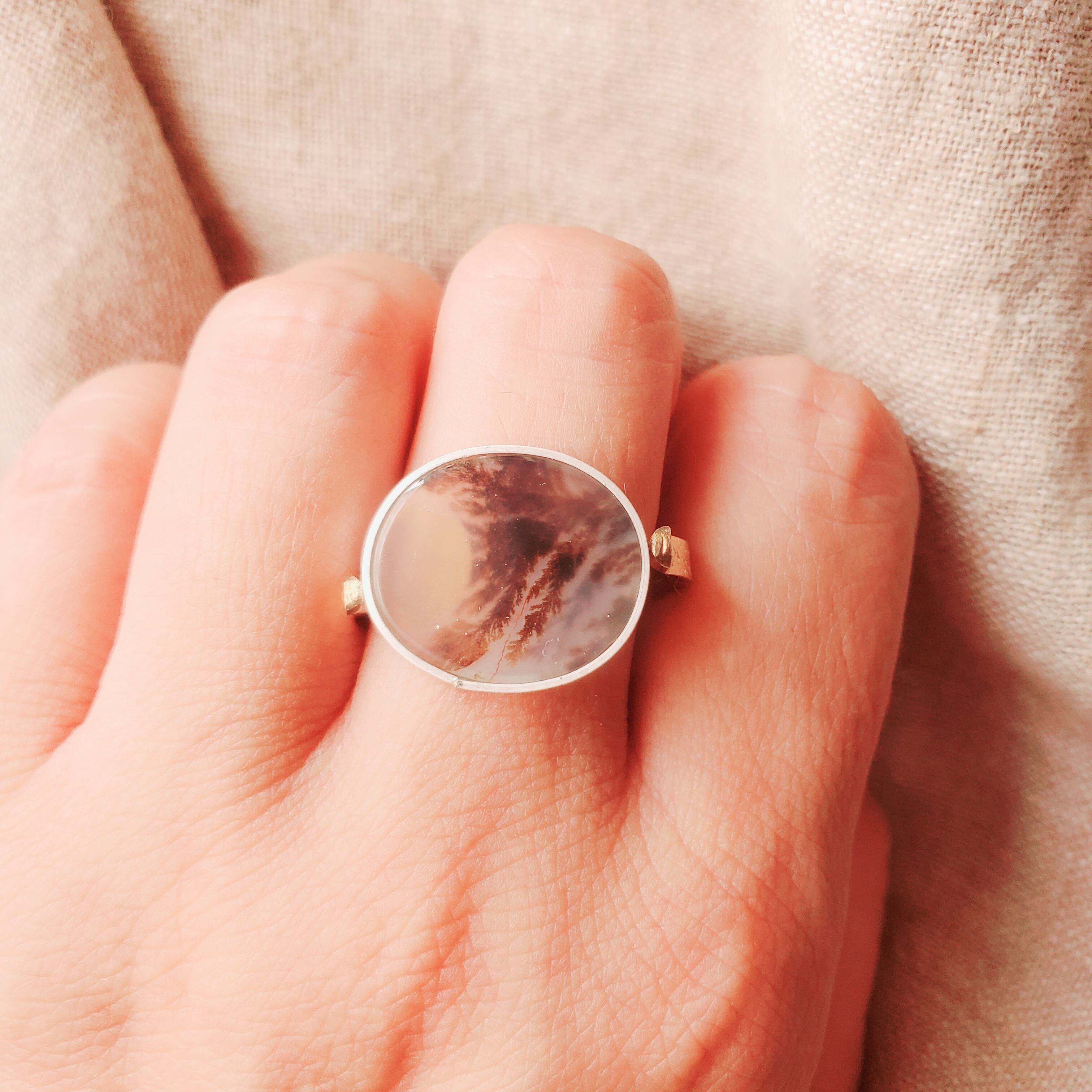 最近のデントリティックアゲートは薄いものが多くなってきてしまっているんですが、これは少し前に仕入れたものなのでしっかりとした厚みがあります。その分、模様に奥行きがあり見ごたえがあります。