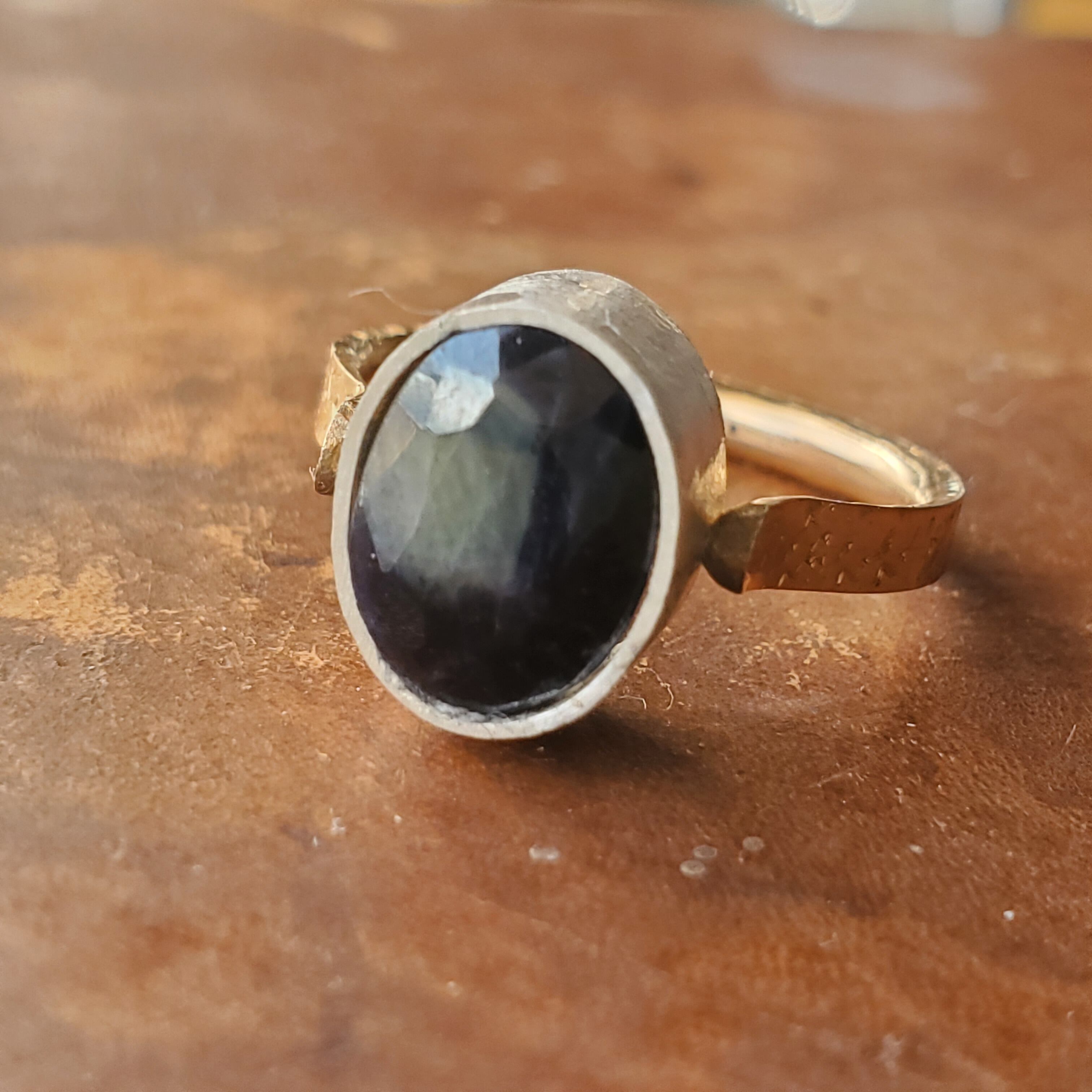 ブルーブラック(紺色)のサファイアが部分的に色変わりしたバイカラーサファイアです。