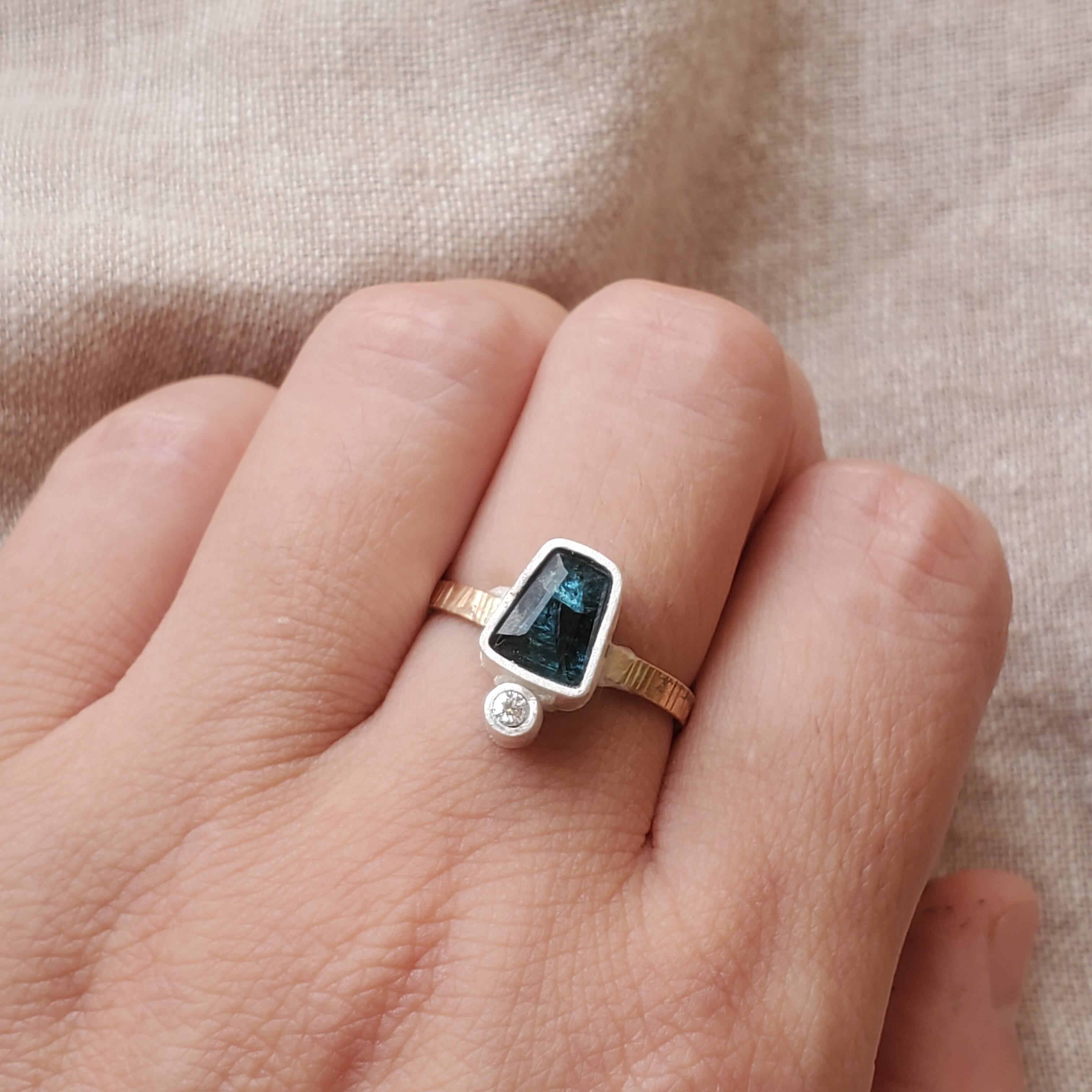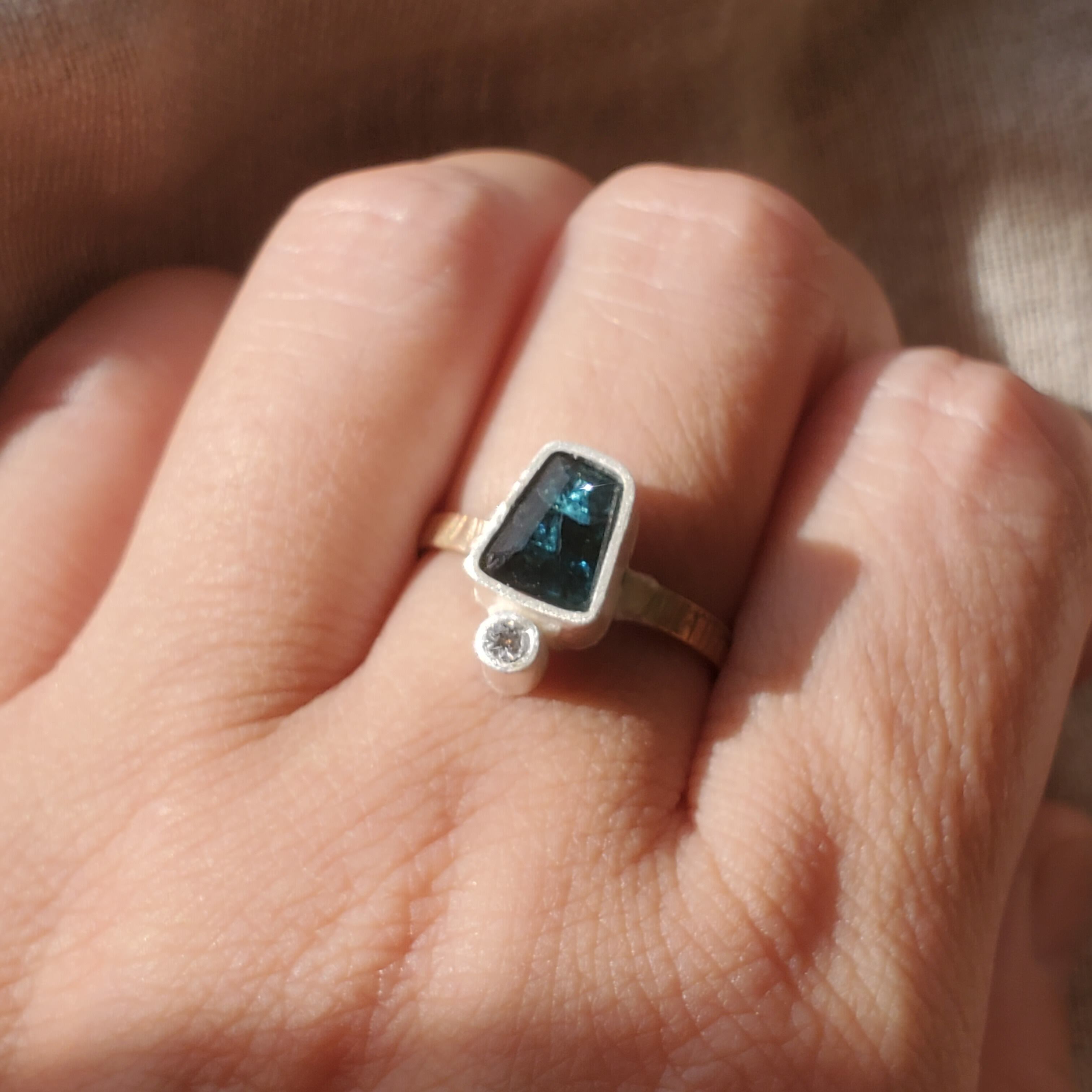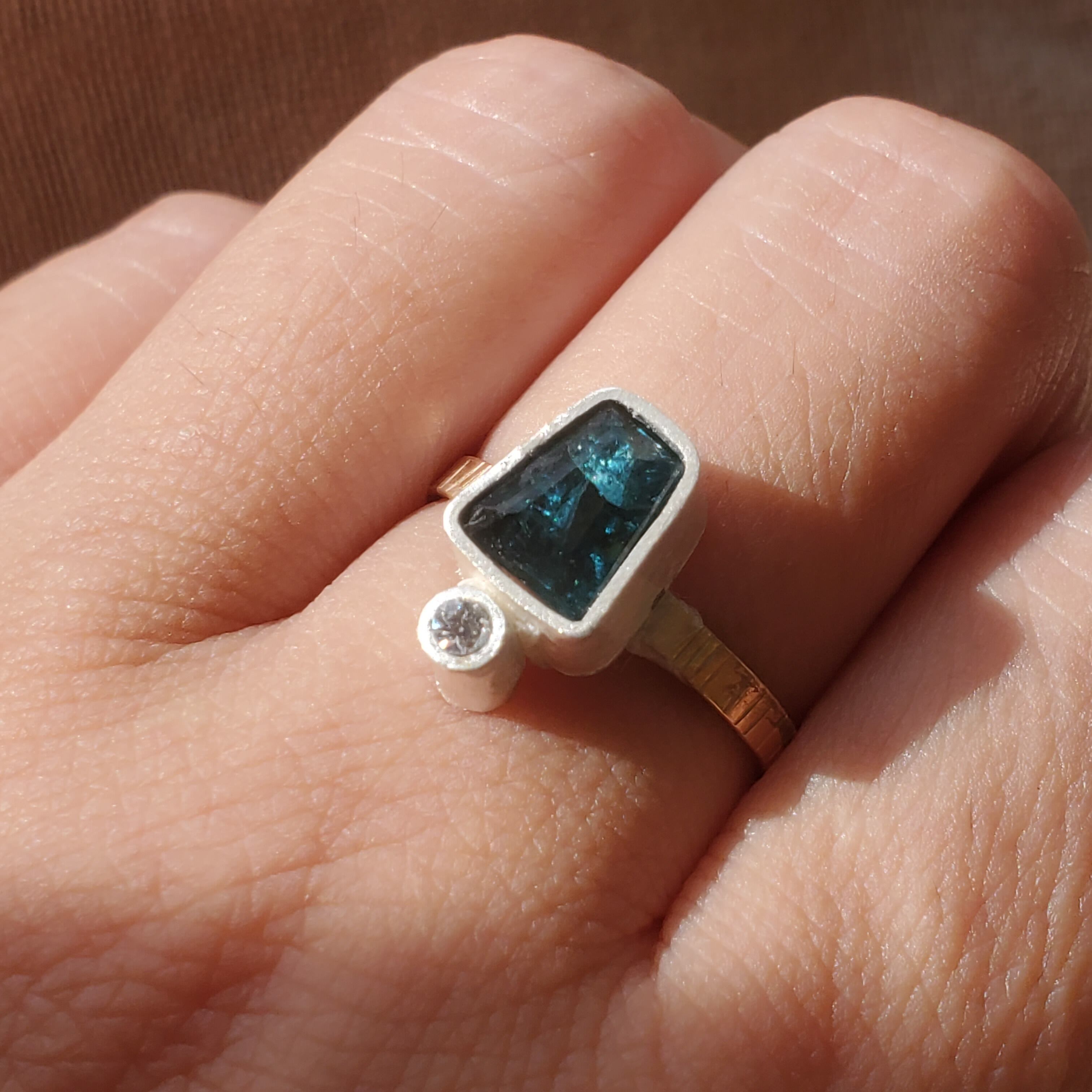 脇石として合わせたのはモアサナイト。人工石ですが ダイヤに匹敵する輝きを見せます。(脇石をモアサナイトにするには少し迷いもありました。強い輝きがインディコライトの良さを消してしまわないかという点です。クォーツやホワイトトパーズ、天然ジルコンなども試してみましたが、インディゴライトの深い青に対して若干輝きが弱いように感じました)