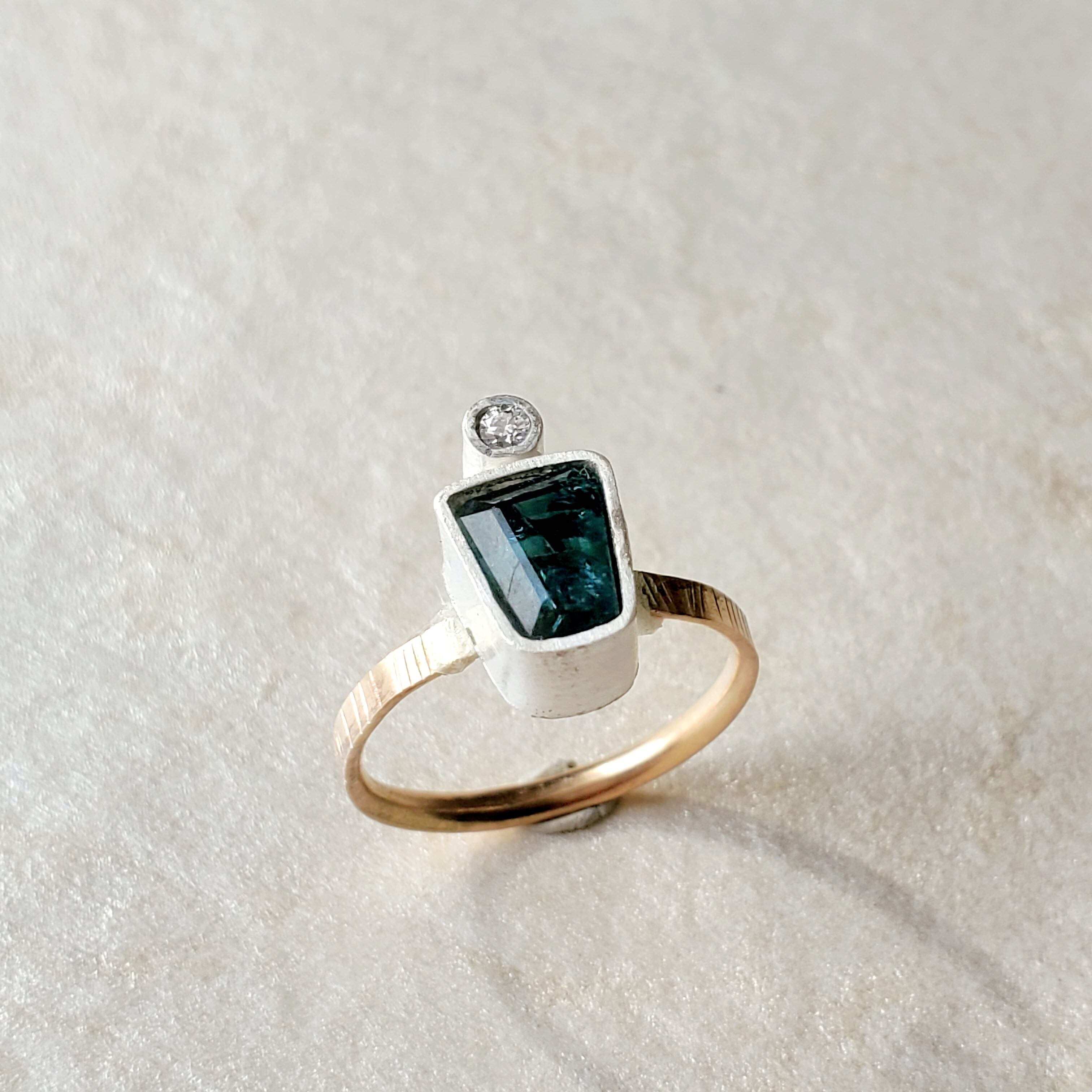 トルマリンの中でも美しいブルーのものは珍しく「インディコライト」と呼ばれます。それを台形(トラペゾイドカット)にした美しくもマニアックな石です。