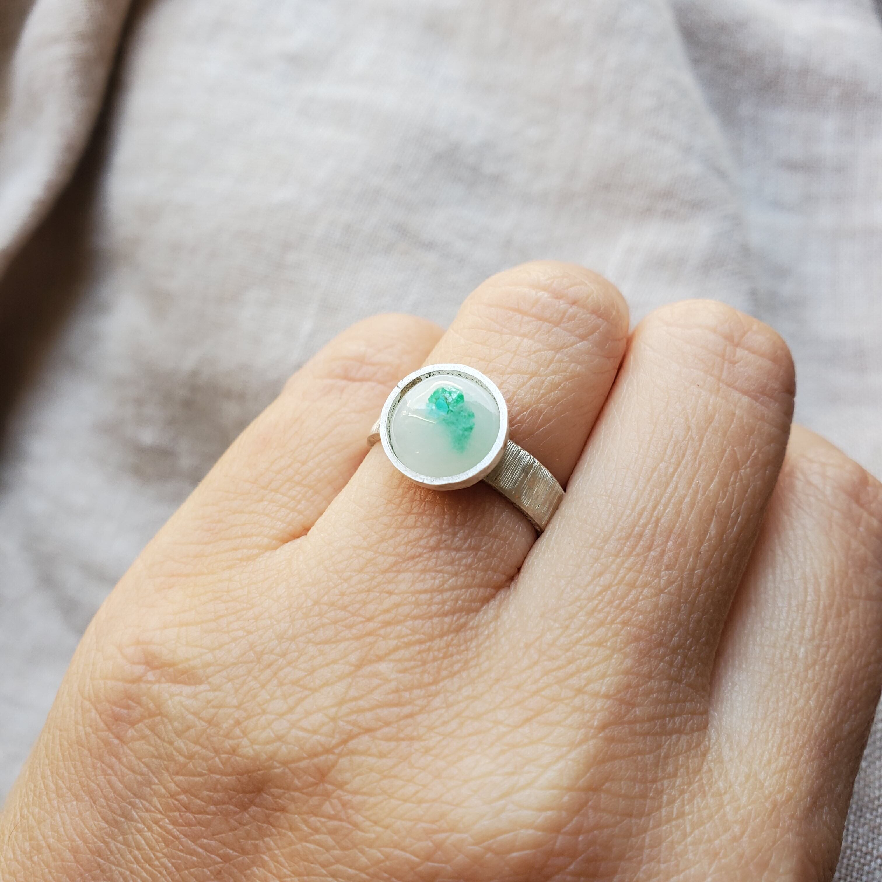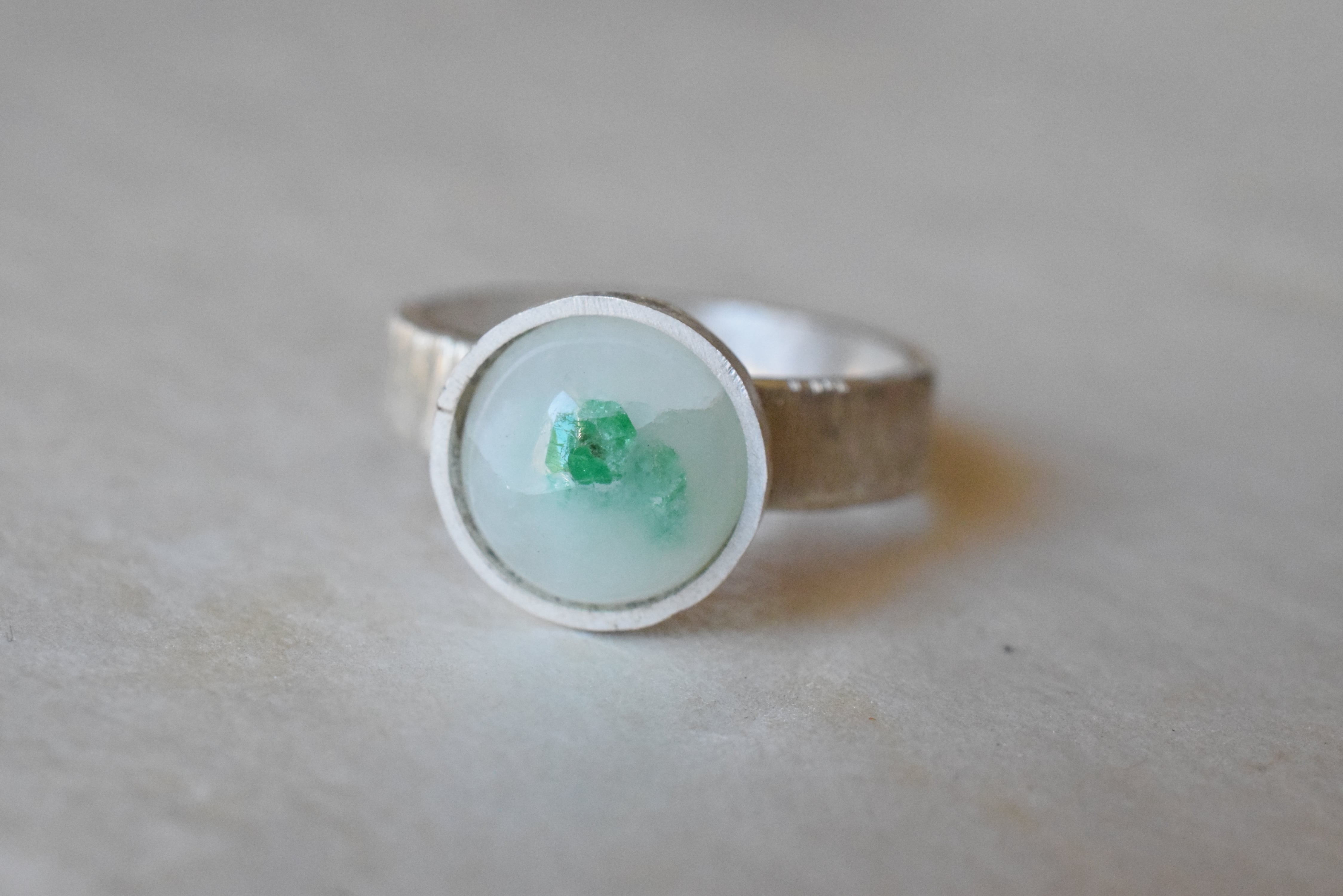目玉のような形がこわ(怖)かわいい粒です。 中央のエメラルドは鮮やかなグリーン&きれいな柱状です。
