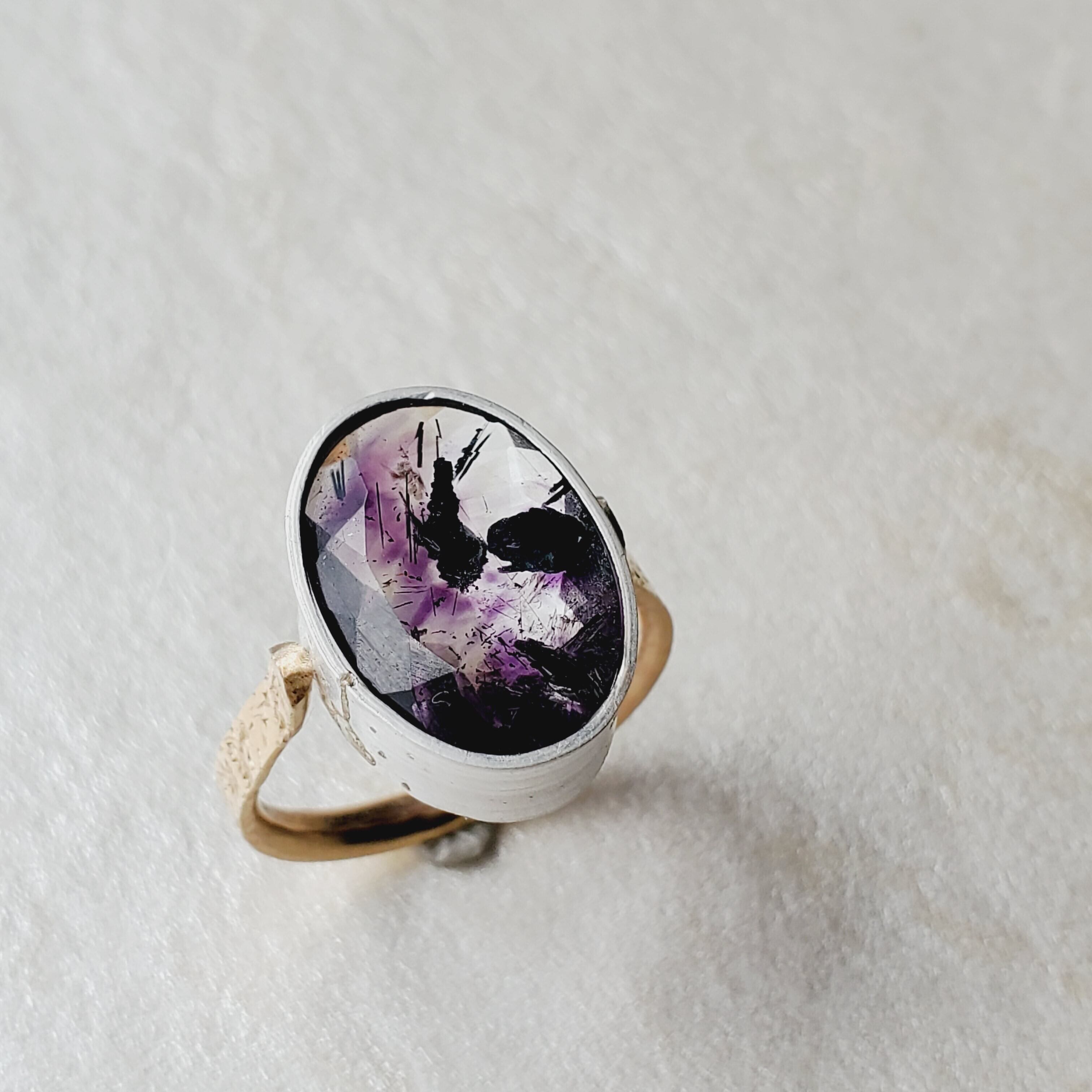 クォーツの中に紫色のアメジスト、黒色のヘマタイトなどが内包されています。
