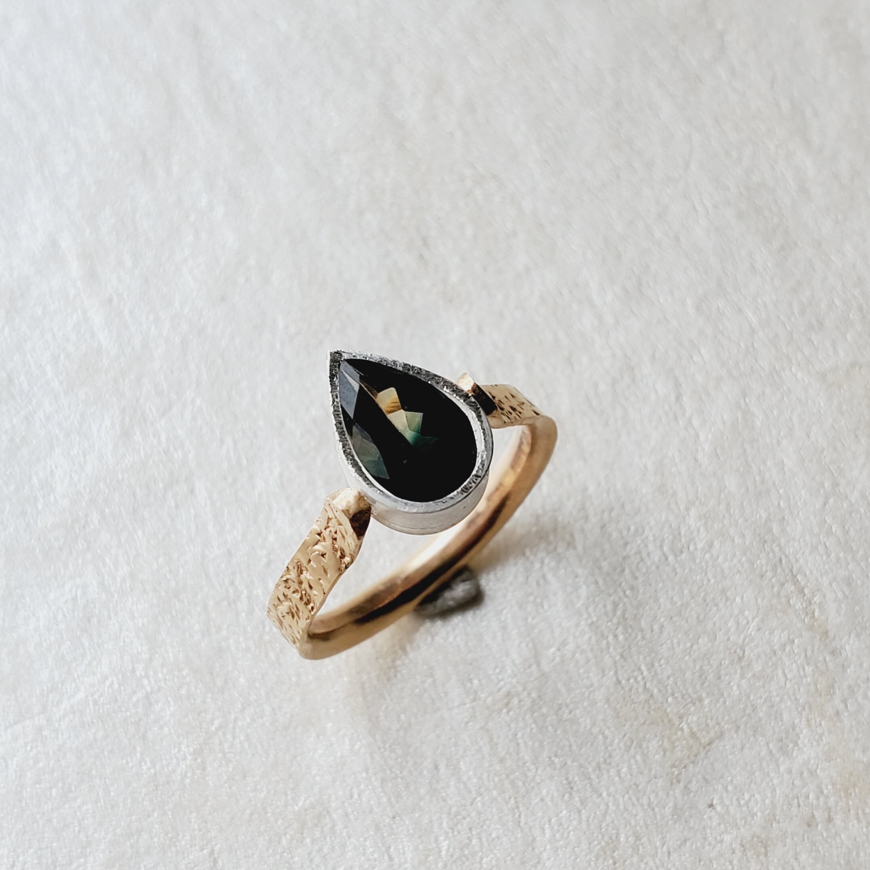 トルマリンらしい硬質の輝きがあり、ダークグリーンの中にひそむグリーンのきらめきが麗しい石です。