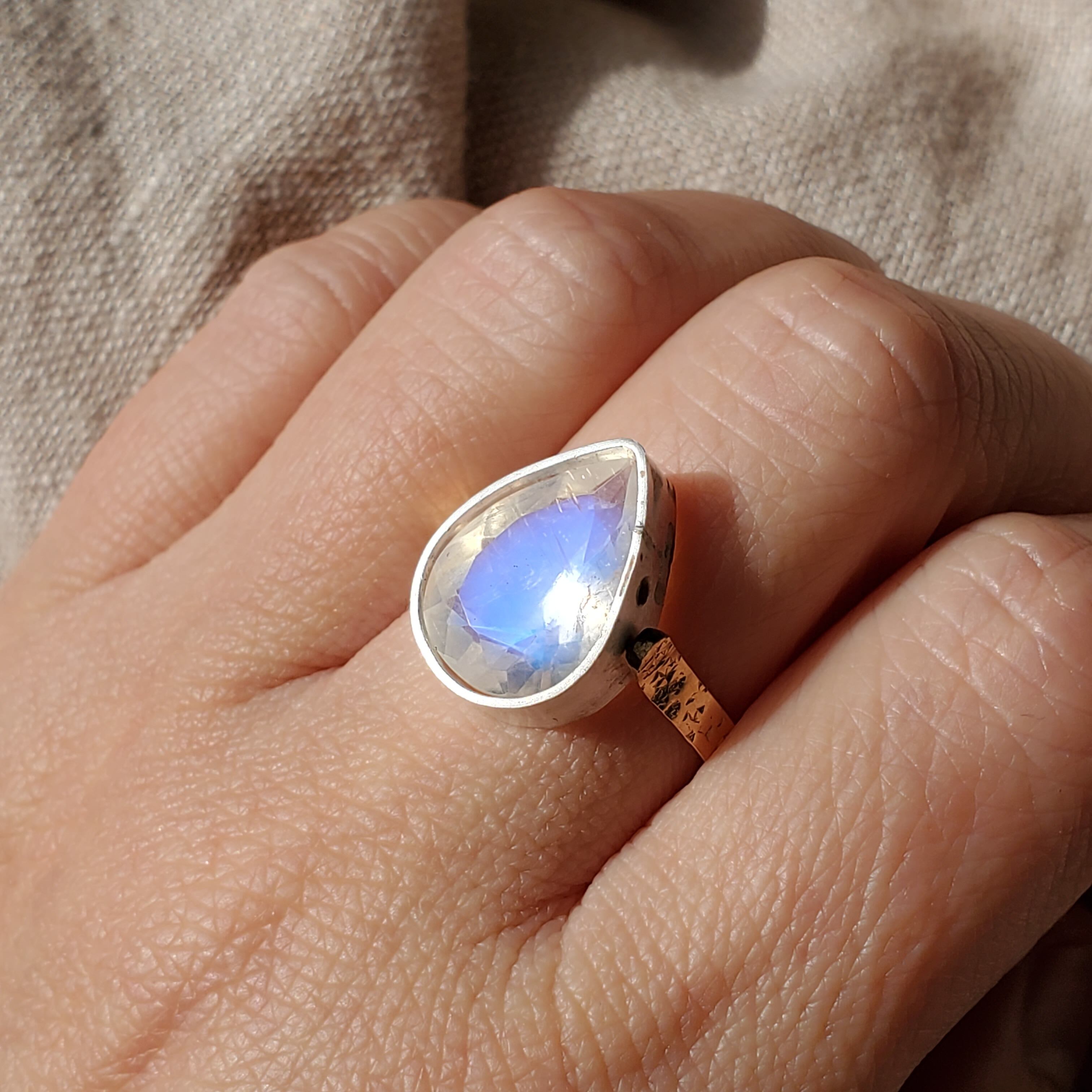 大粒の場面がとても映えるホワイトラブラドライトです。光の角度によっては幻想的なブルーのシラーを見せてくれます。