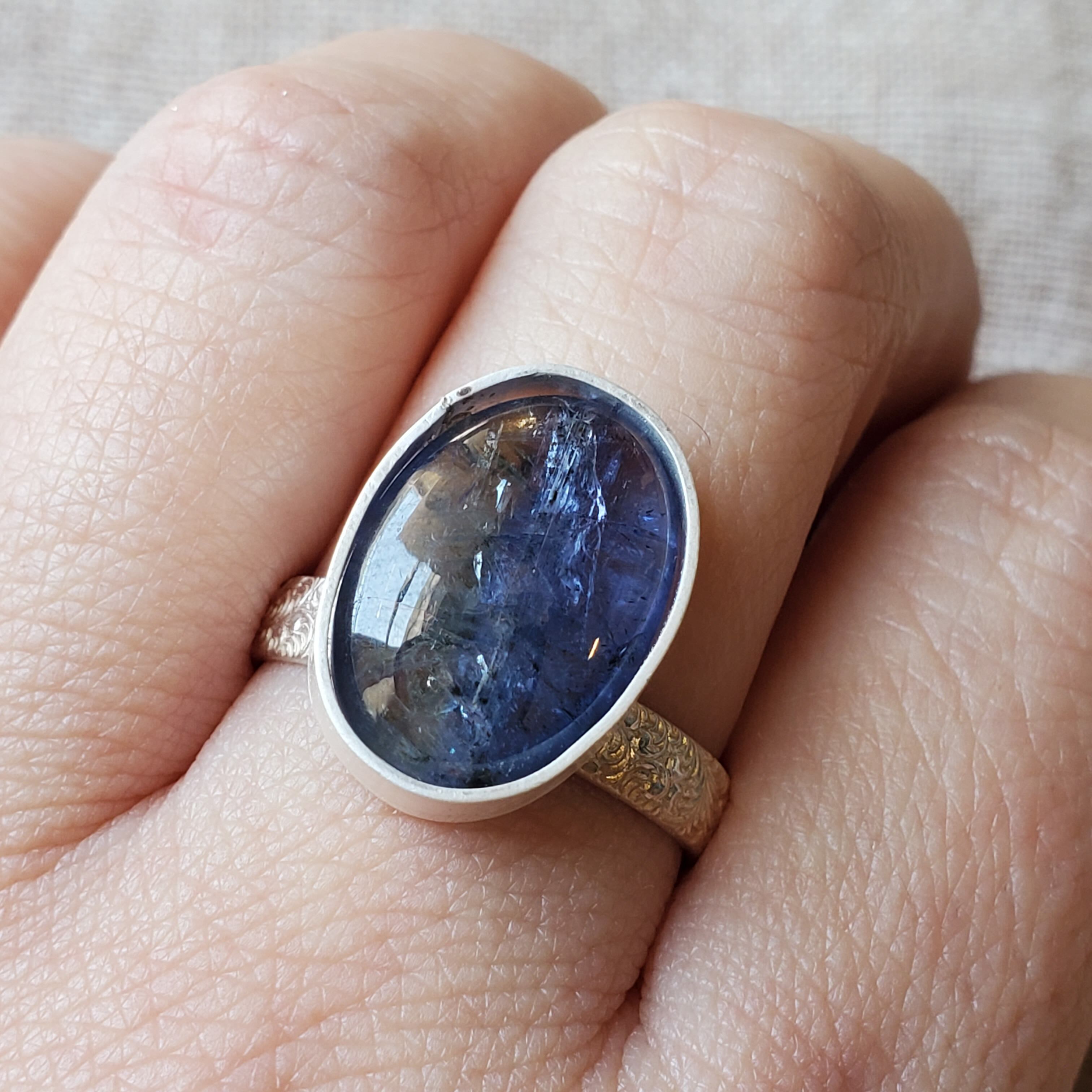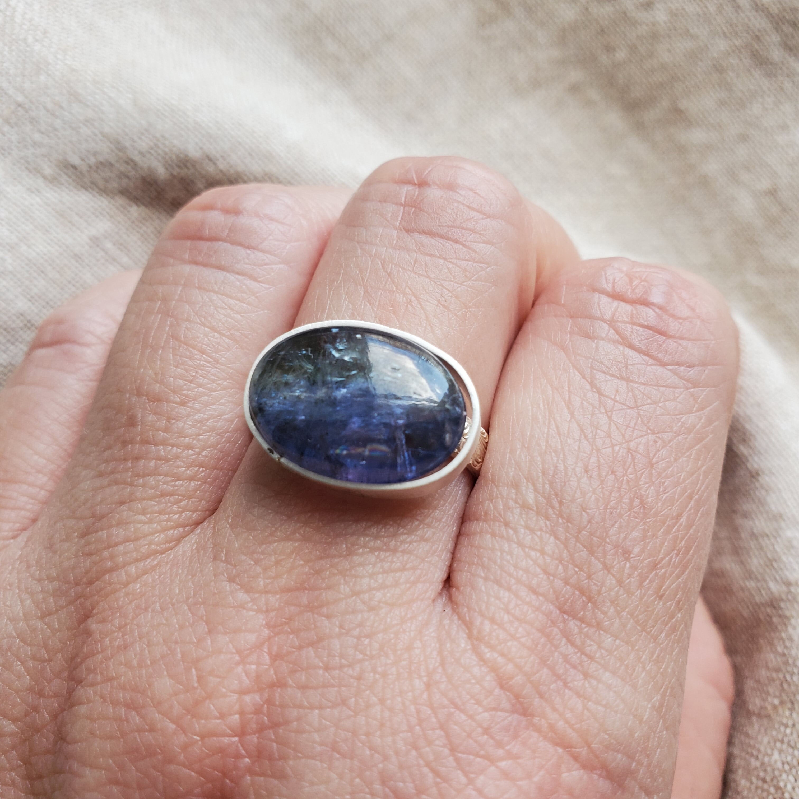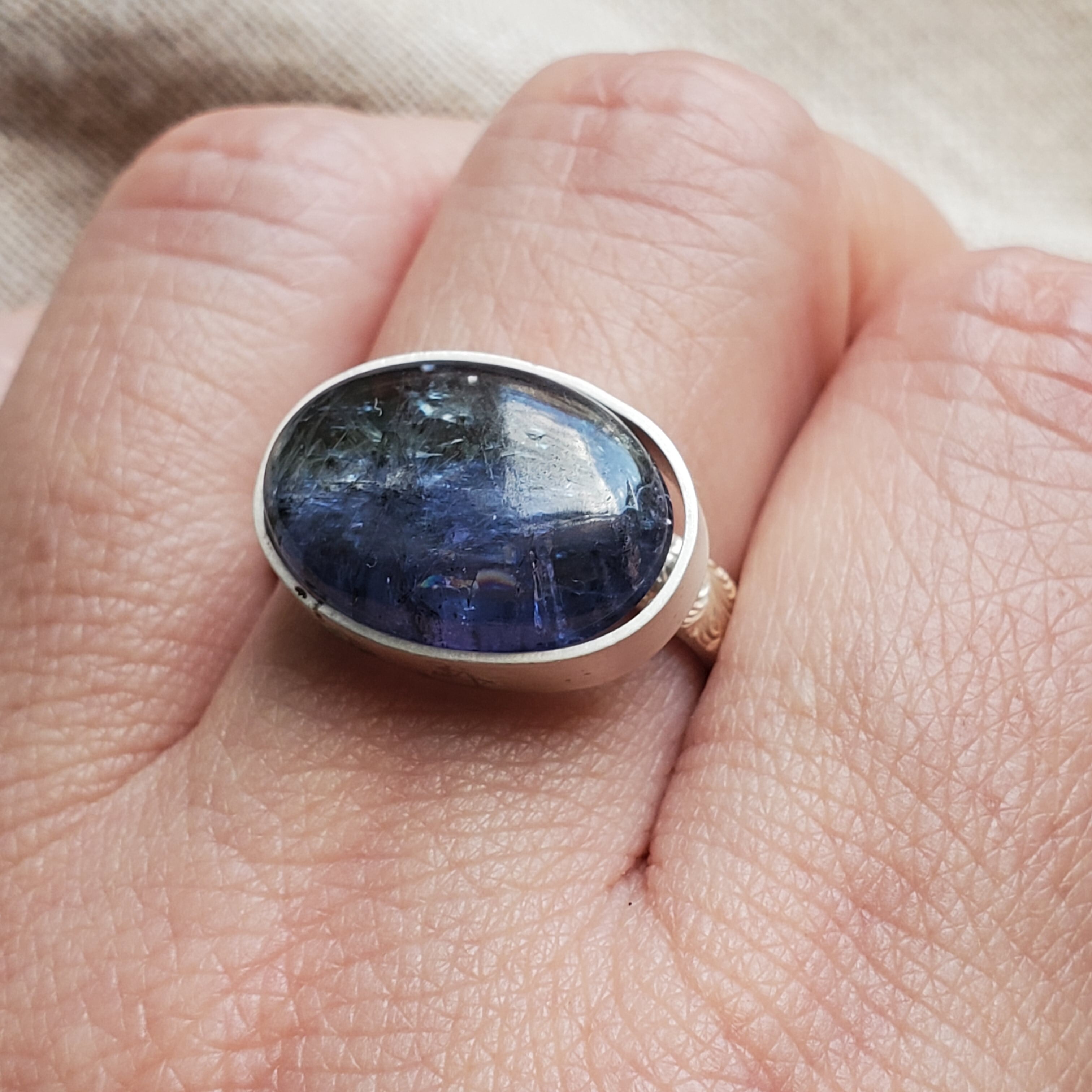 クラックが多めの野生のタンザナイトですが、光があたるとシルバーのシラーのような輝き方をします。