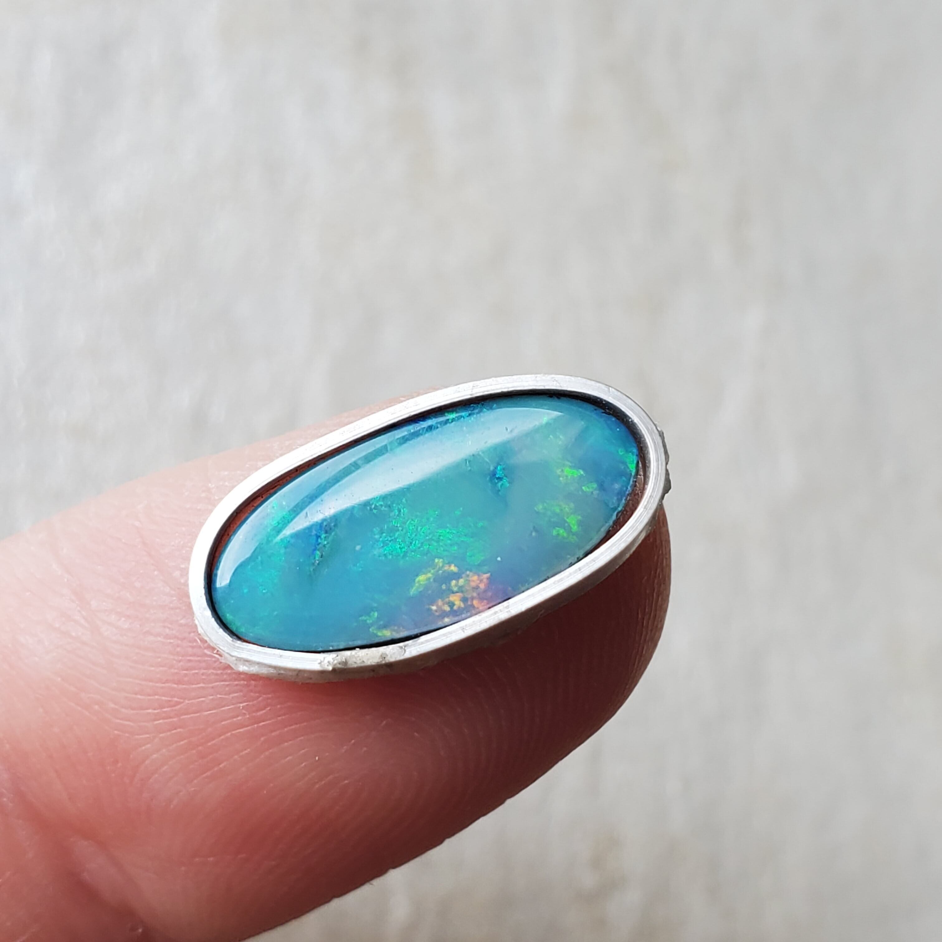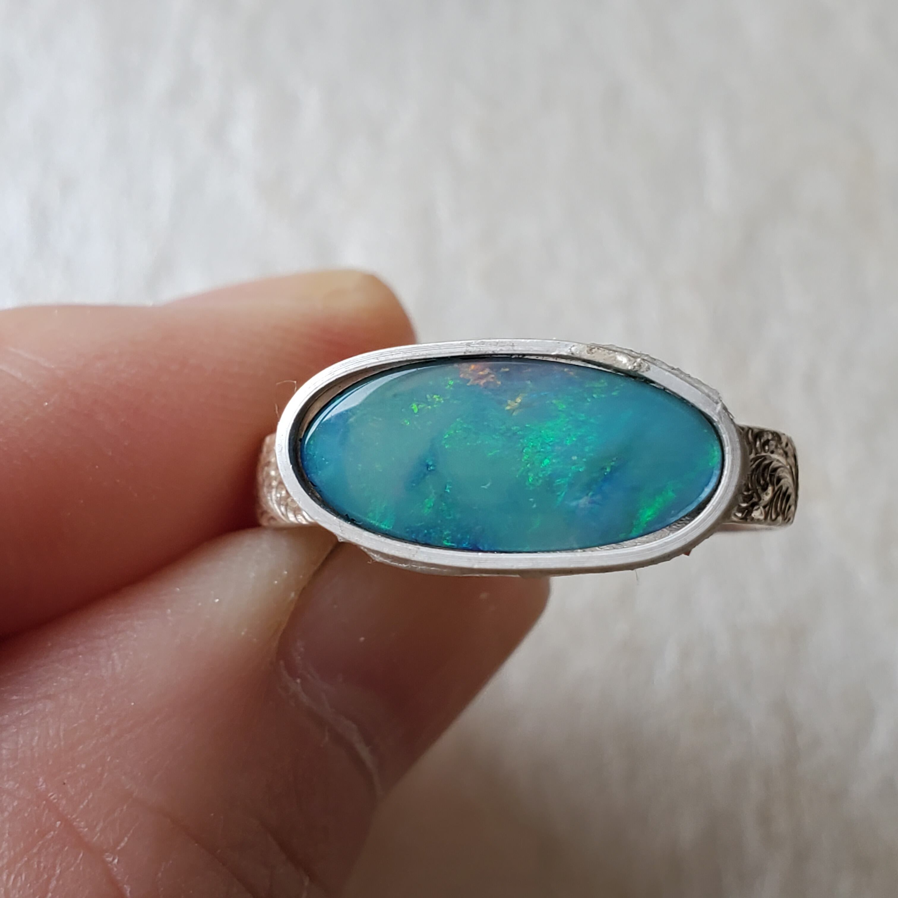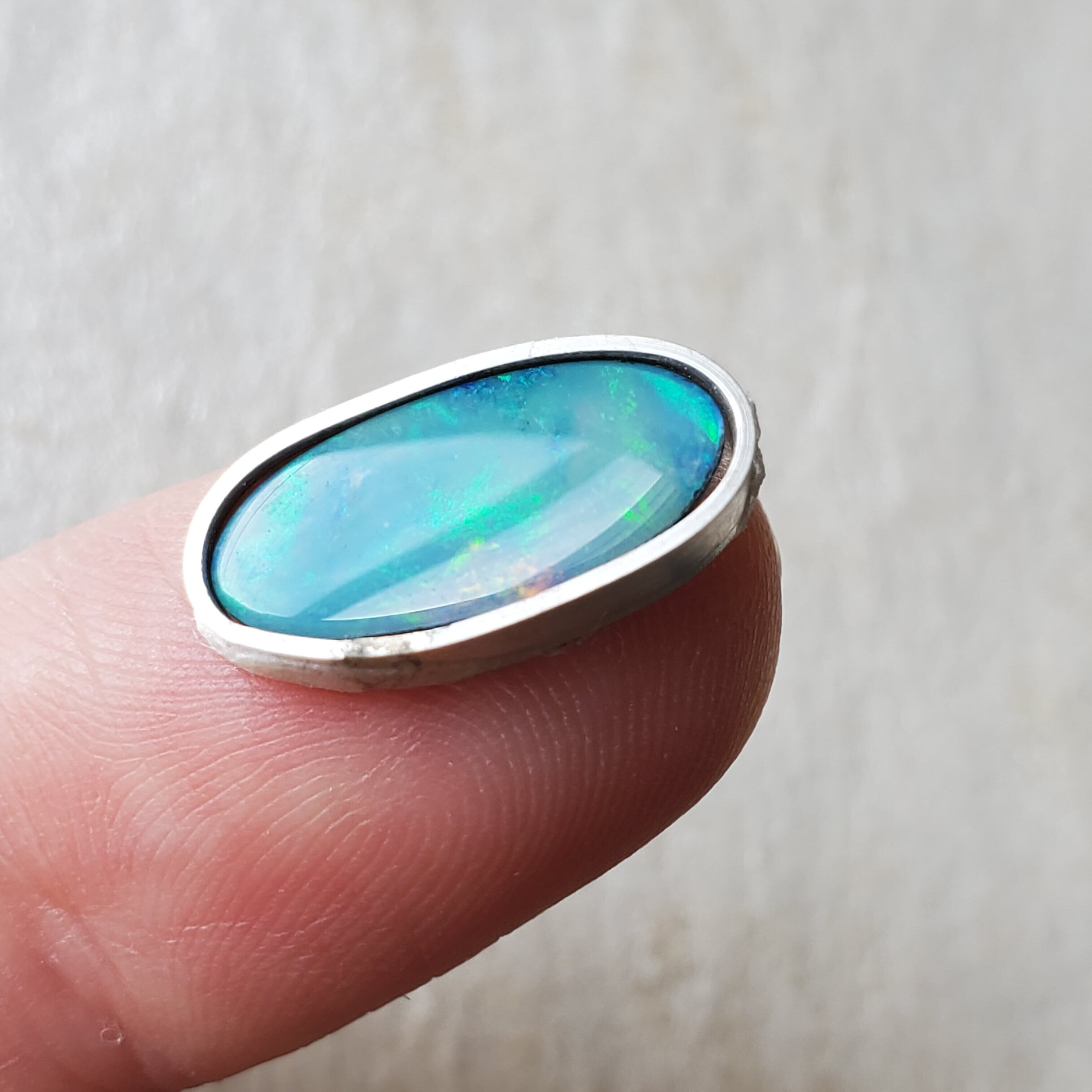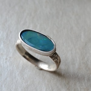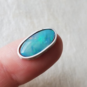 ブルーグリーンのオパールにエメラルドグリーンの遊色が浮かびあがります。中央のはしにピンクの遊色がちょこっと出るのが良いアクセントになっています。