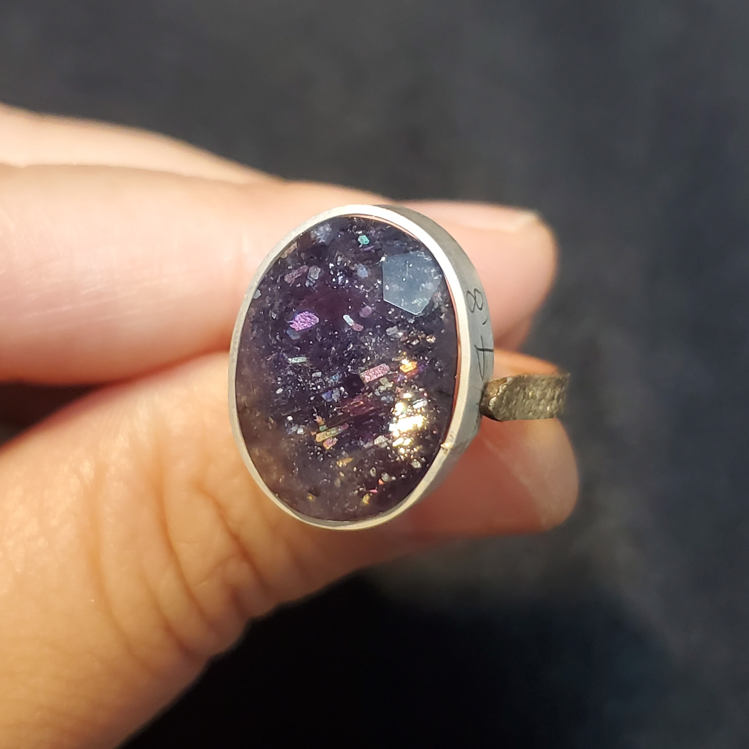 ふっくらとしたオーバルシェイプです。濃紺のアイオライトに、色彩豊かなインクルージョンが特徴で、白やパープル、ひとつだけ青のラメが入っています。