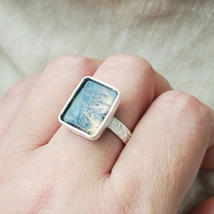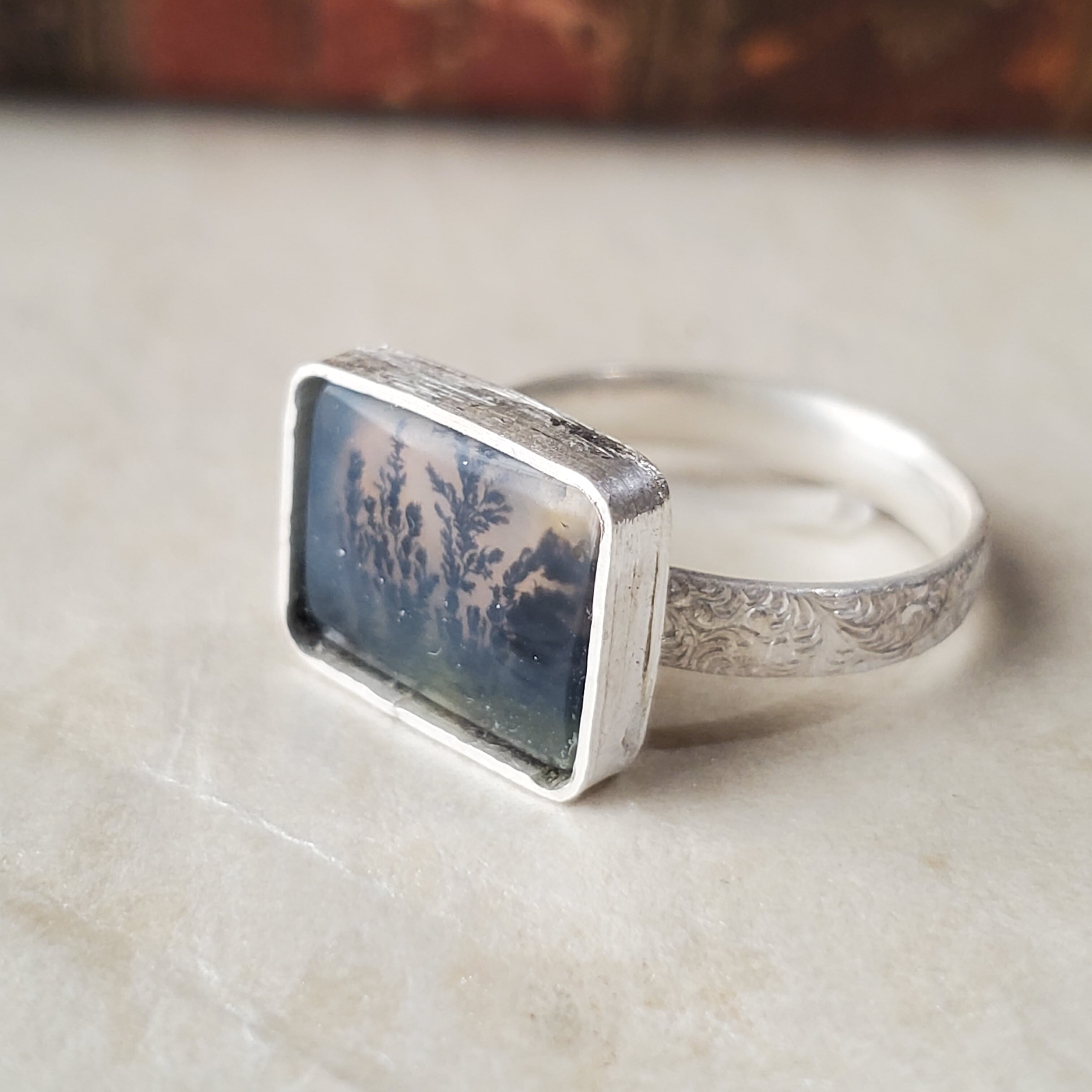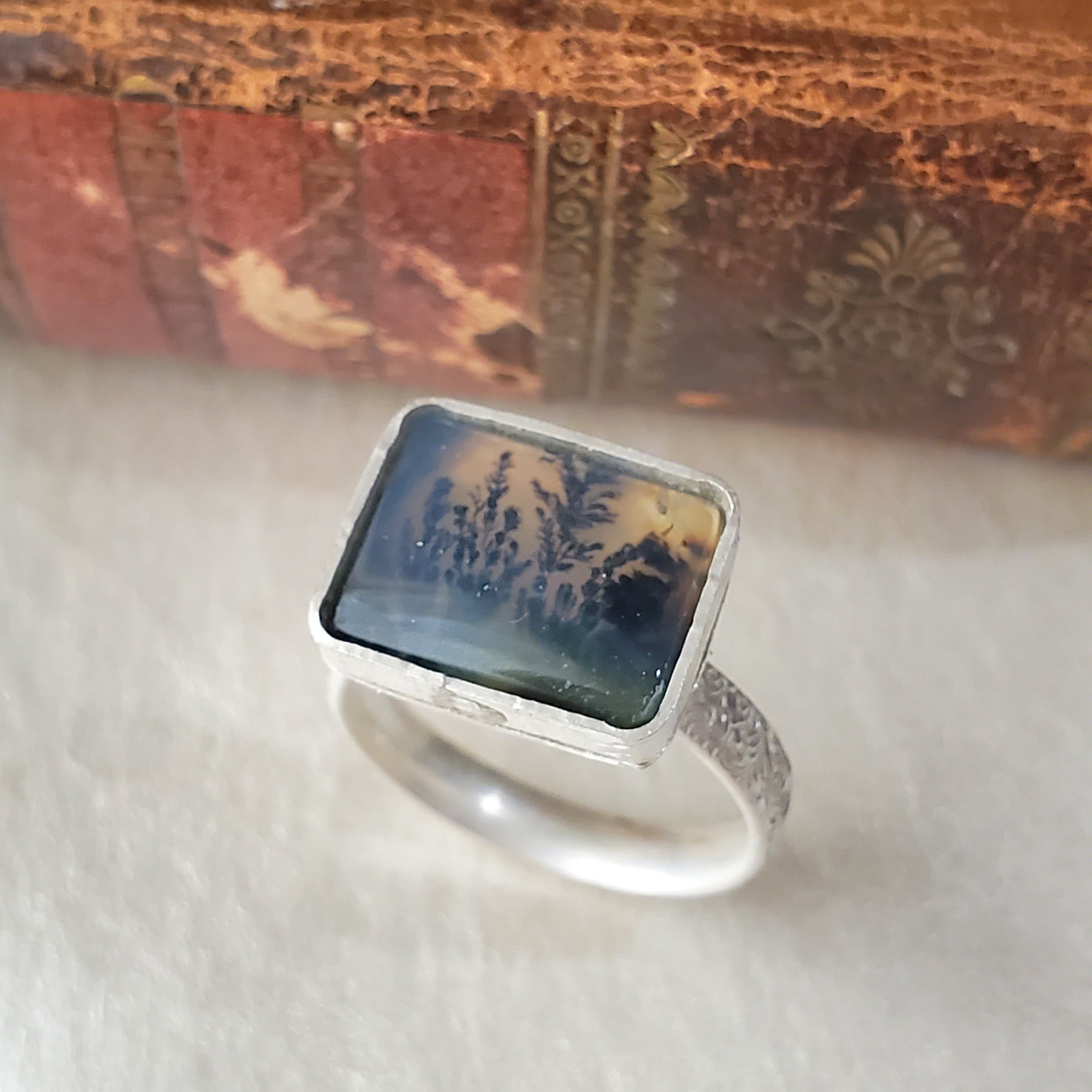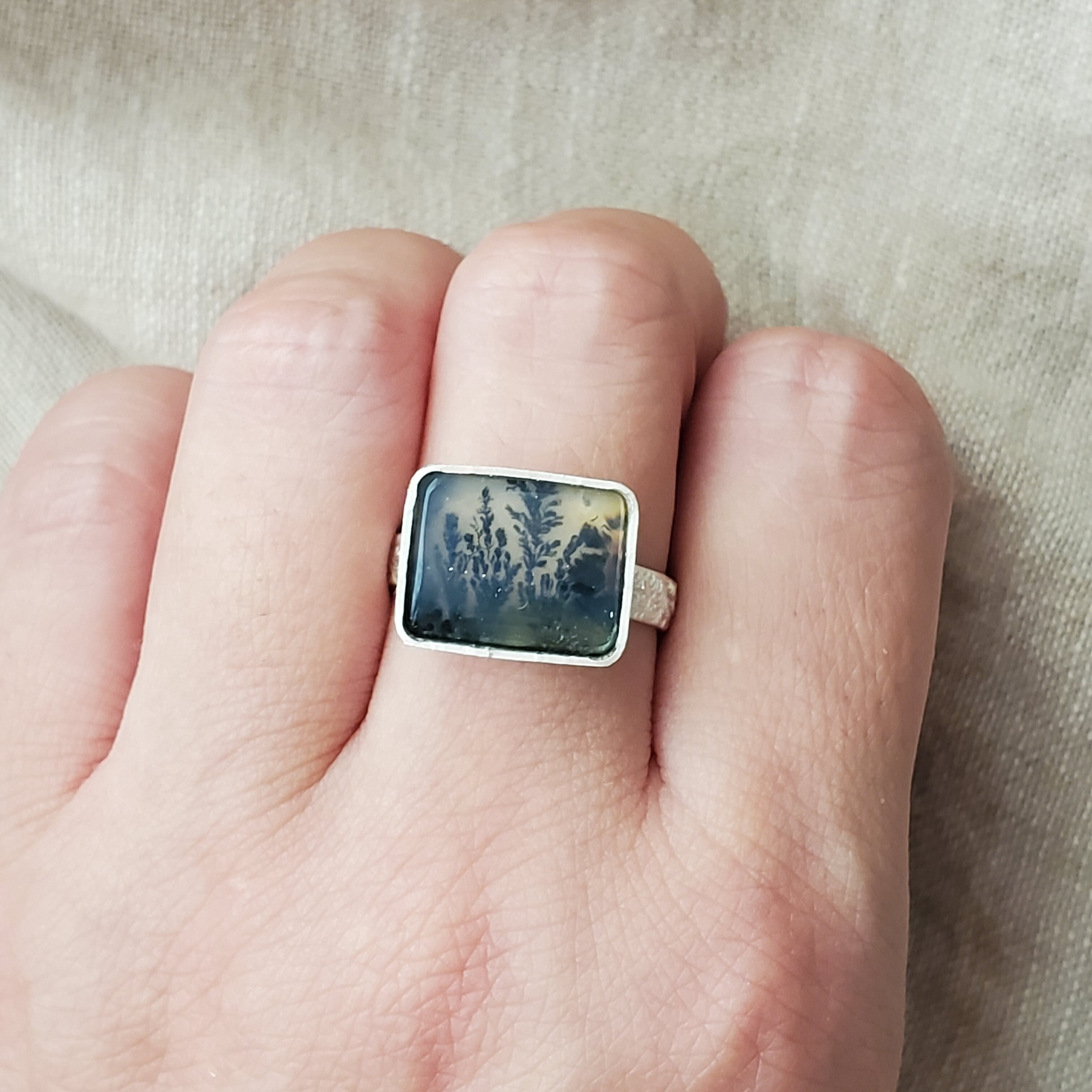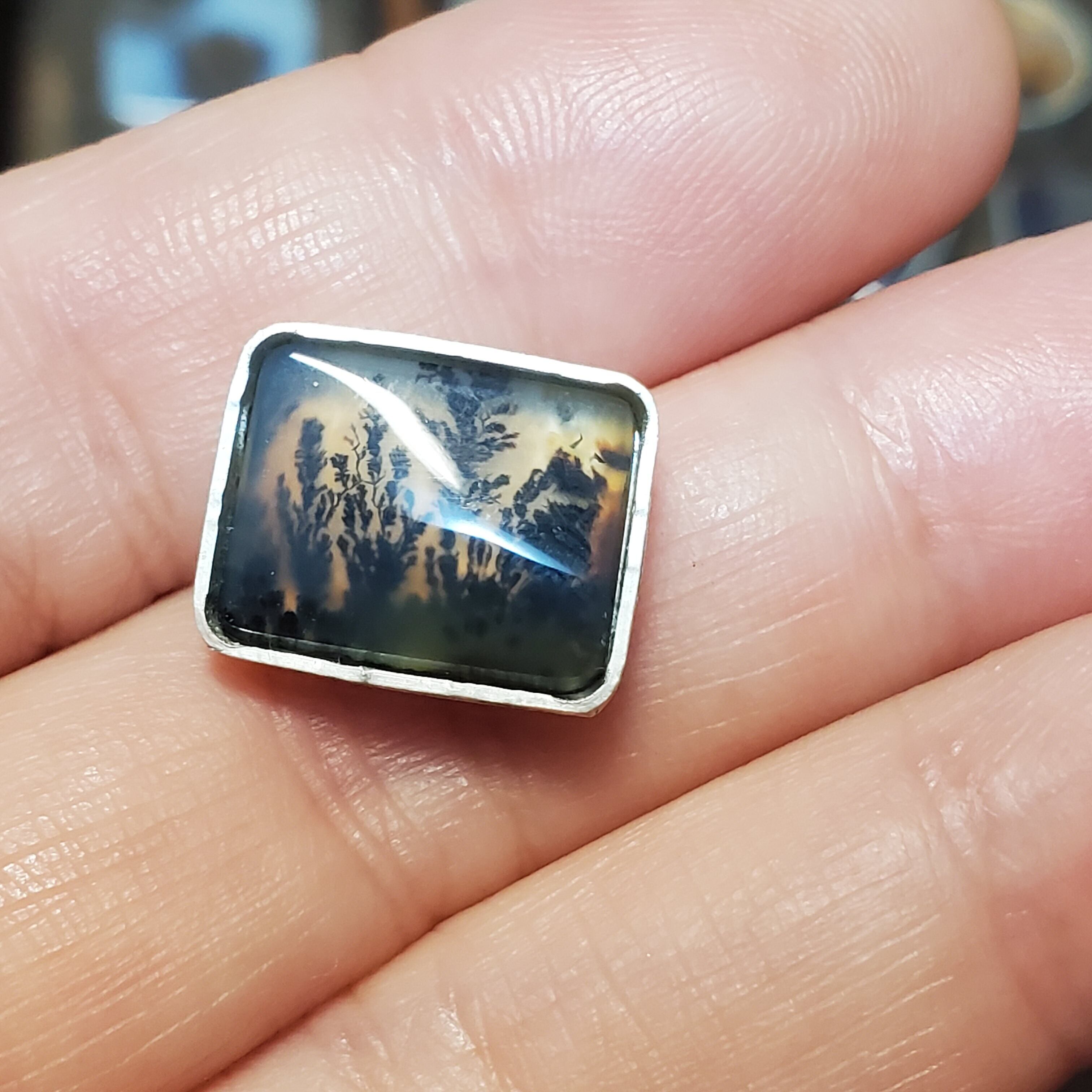 ●デンドリティックアゲートのアゲートの色は白っぽいものが多いです。その中には少しオレンジや茶色がかったものがあります。こちらの【夕焼け】シリーズはそういう石の石座を銀板で閉じることで、夕焼けのように全体がオレンジがかって見えるようにしてあります。(※光に透かしても裏側は透けません。一部、高さの関係でアームはサイド付けに出来ません。)