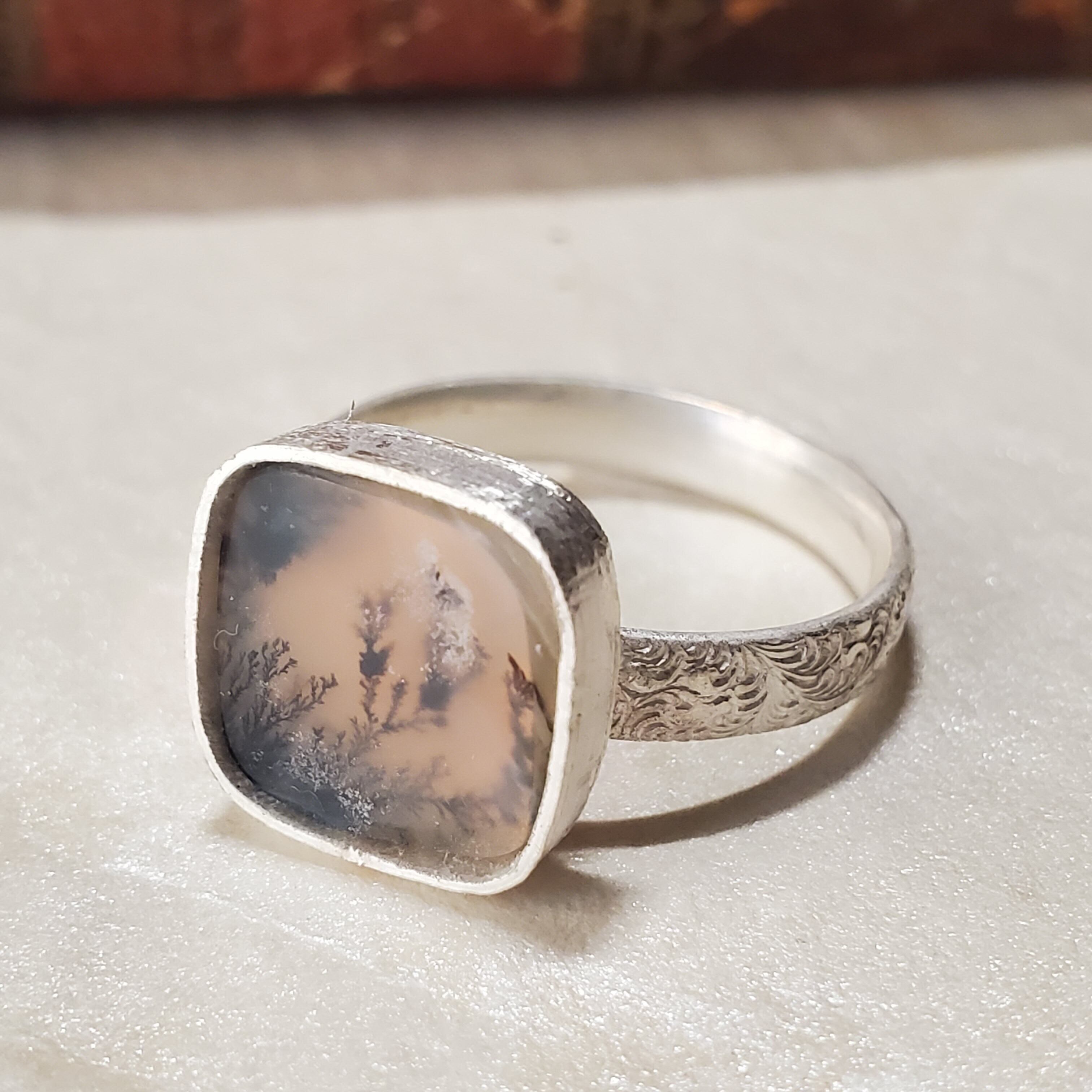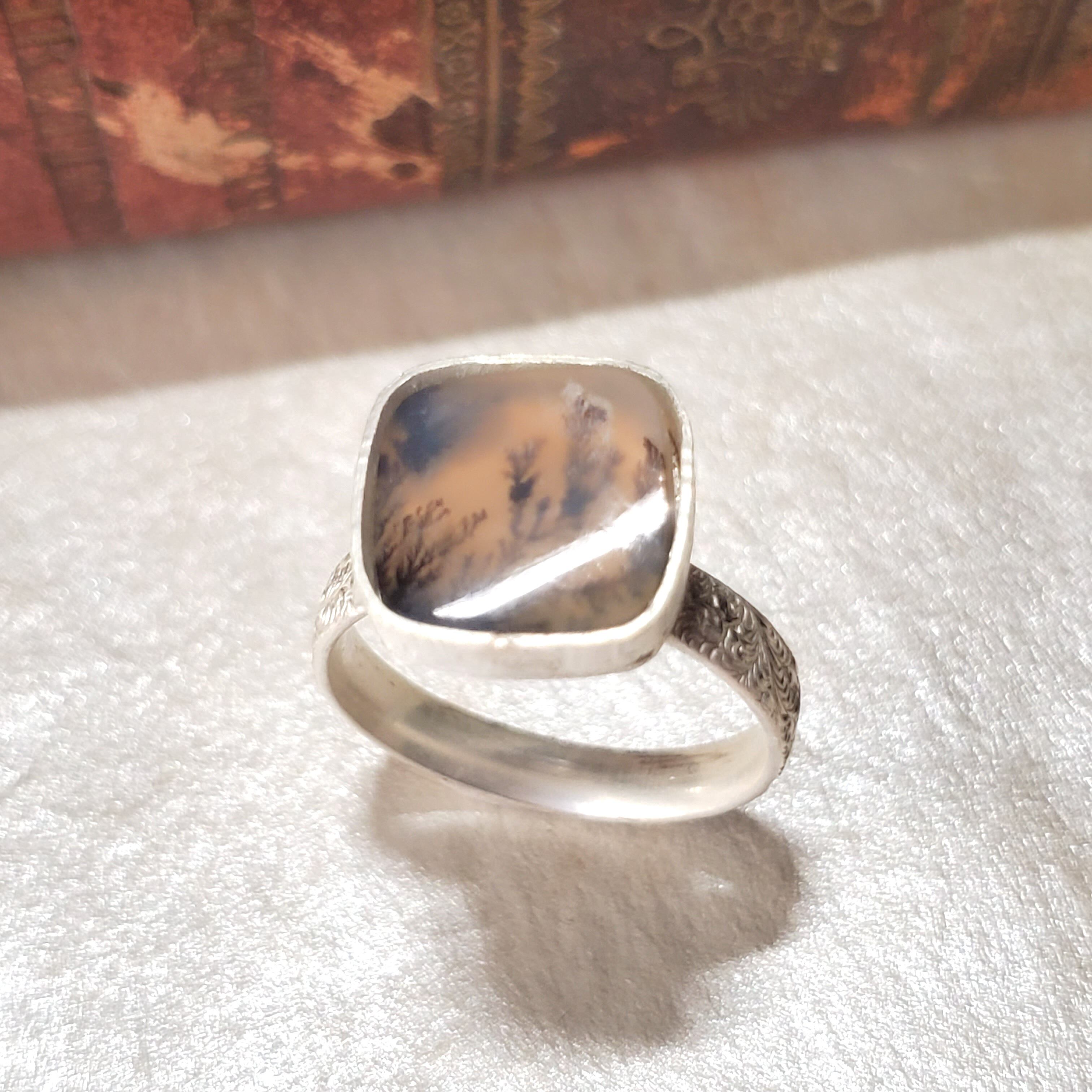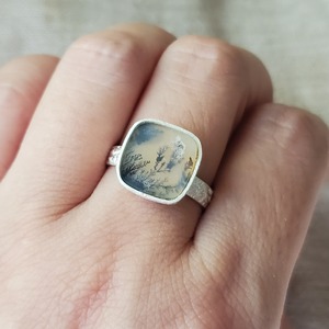 ●デンドリティックアゲートのアゲートの色は白っぽいものが多いです。その中には少しオレンジや茶色がかったものがあります。こちらの【夕焼け】シリーズはそういう石の石座を銀板で閉じることで、夕焼けのように全体がオレンジがかって見えるようにしてあります。(※光に透かしても裏側は透けません。高さの関係でアームはサイド付けには出来ません。)