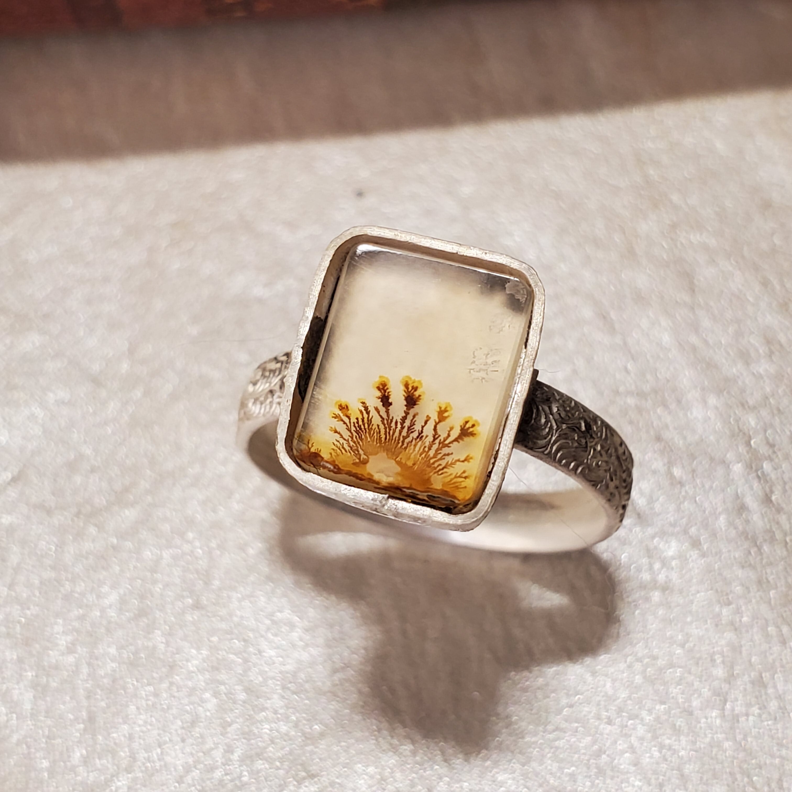 ●デンドリティックアゲートのアゲートの色は白っぽいものが多いです。その中には少しオレンジや茶色がかったものがあります。こちらの【夕焼け】シリーズはそういう石の石座を銀板で閉じることで、夕焼けのように全体がオレンジがかって見えるようにしてあります。(※光に透かしても裏側は透けません。高さの関係でアームはサイド付けには出来ません。)