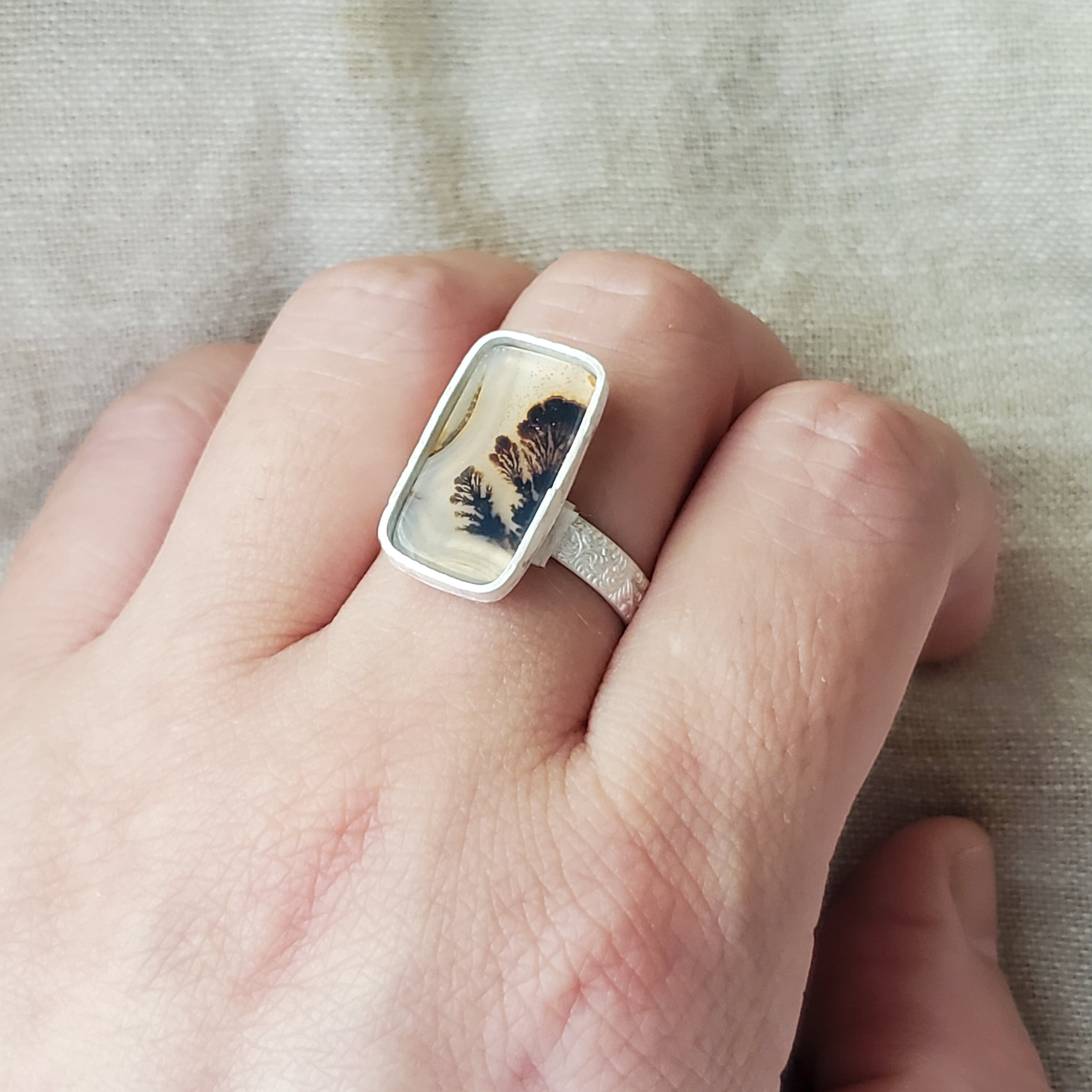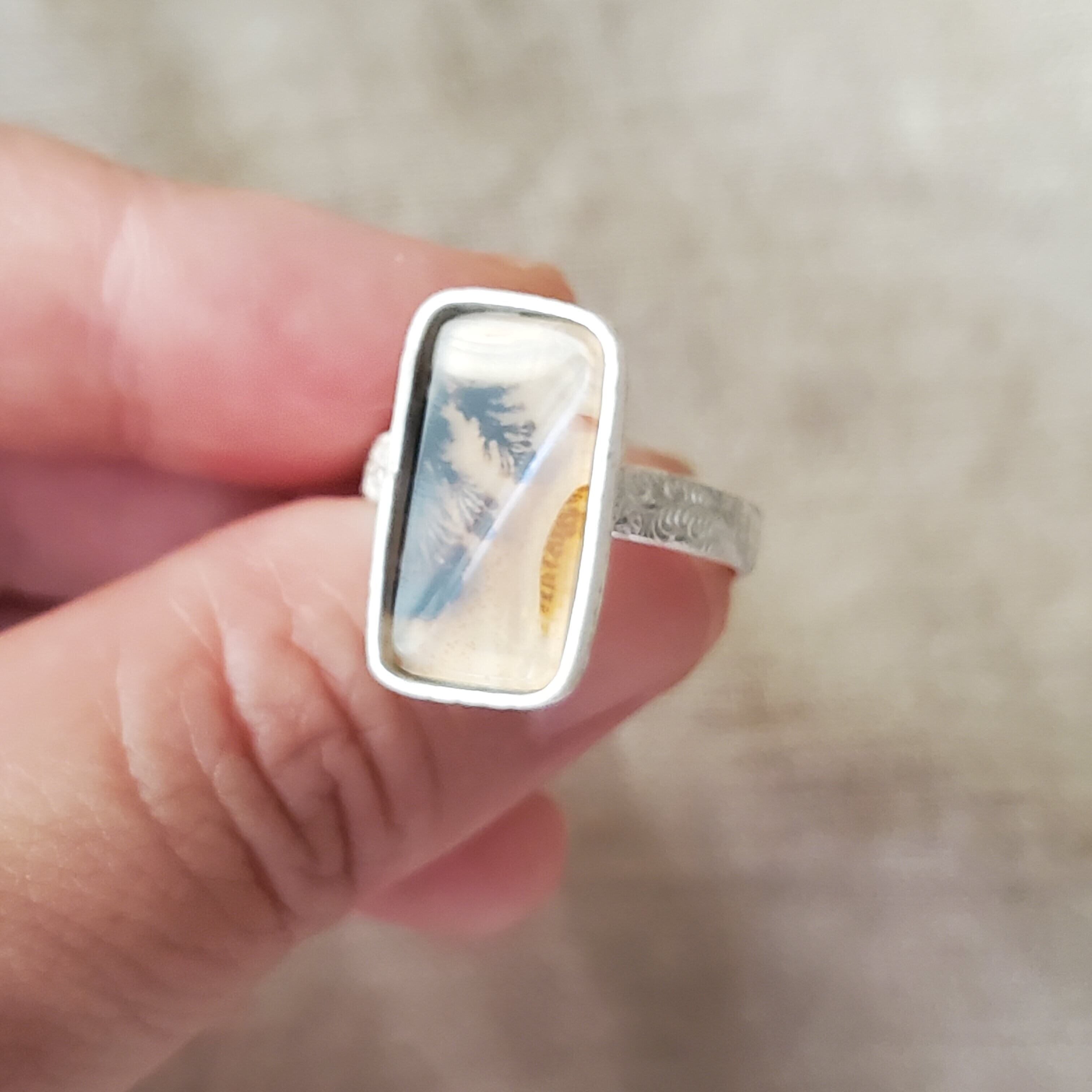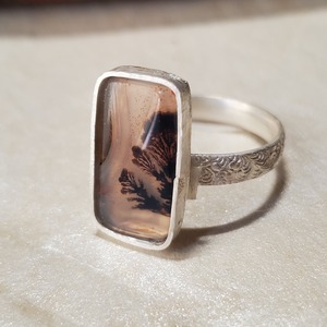 ●デンドリティックアゲートのアゲートの色は白っぽいものが多いです。その中には少しオレンジや茶色がかったものがあります。こちらの【夕焼け】シリーズはそういう石の石座を銀板で閉じることで、夕焼けのように全体がオレンジがかって見えるようにしてあります。(※光に透かしても裏側は透けません。高さの関係でアームはサイド付けには出来ません。)