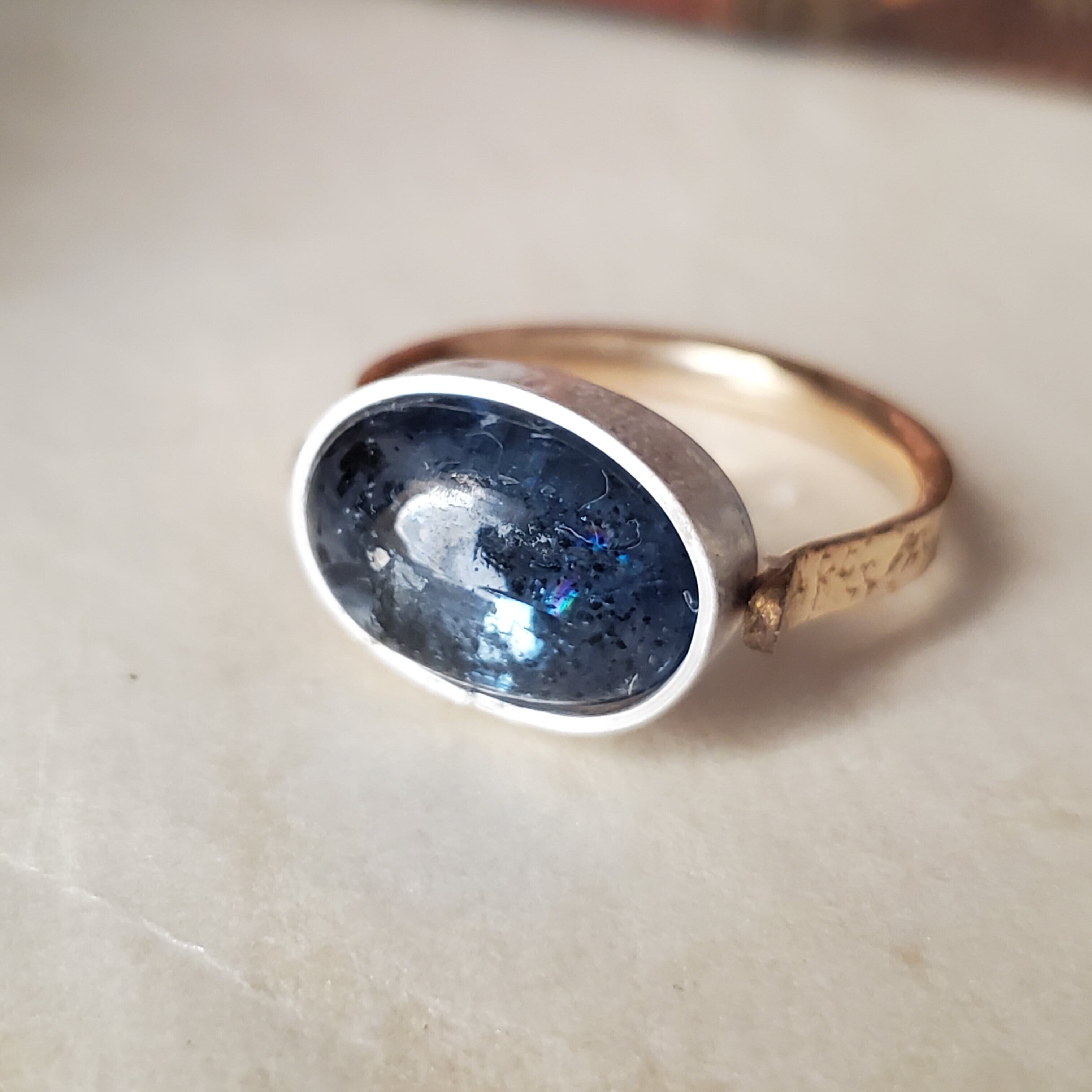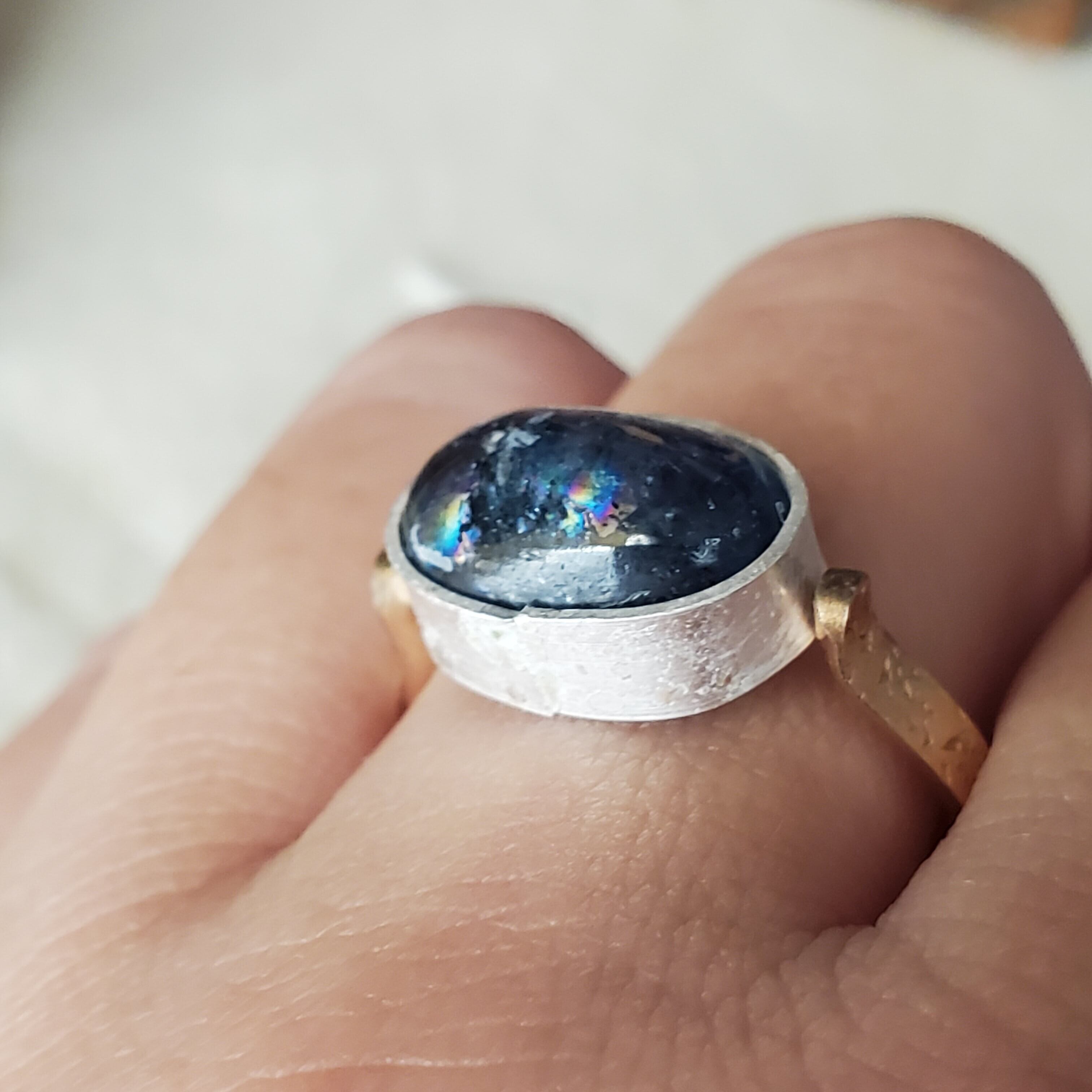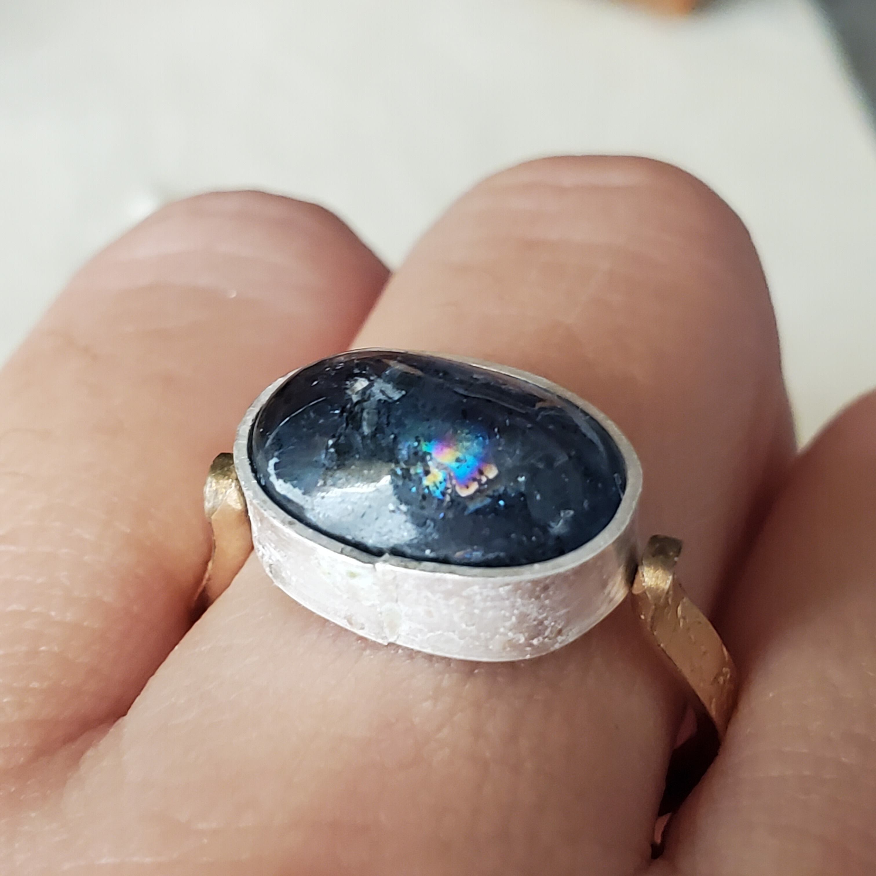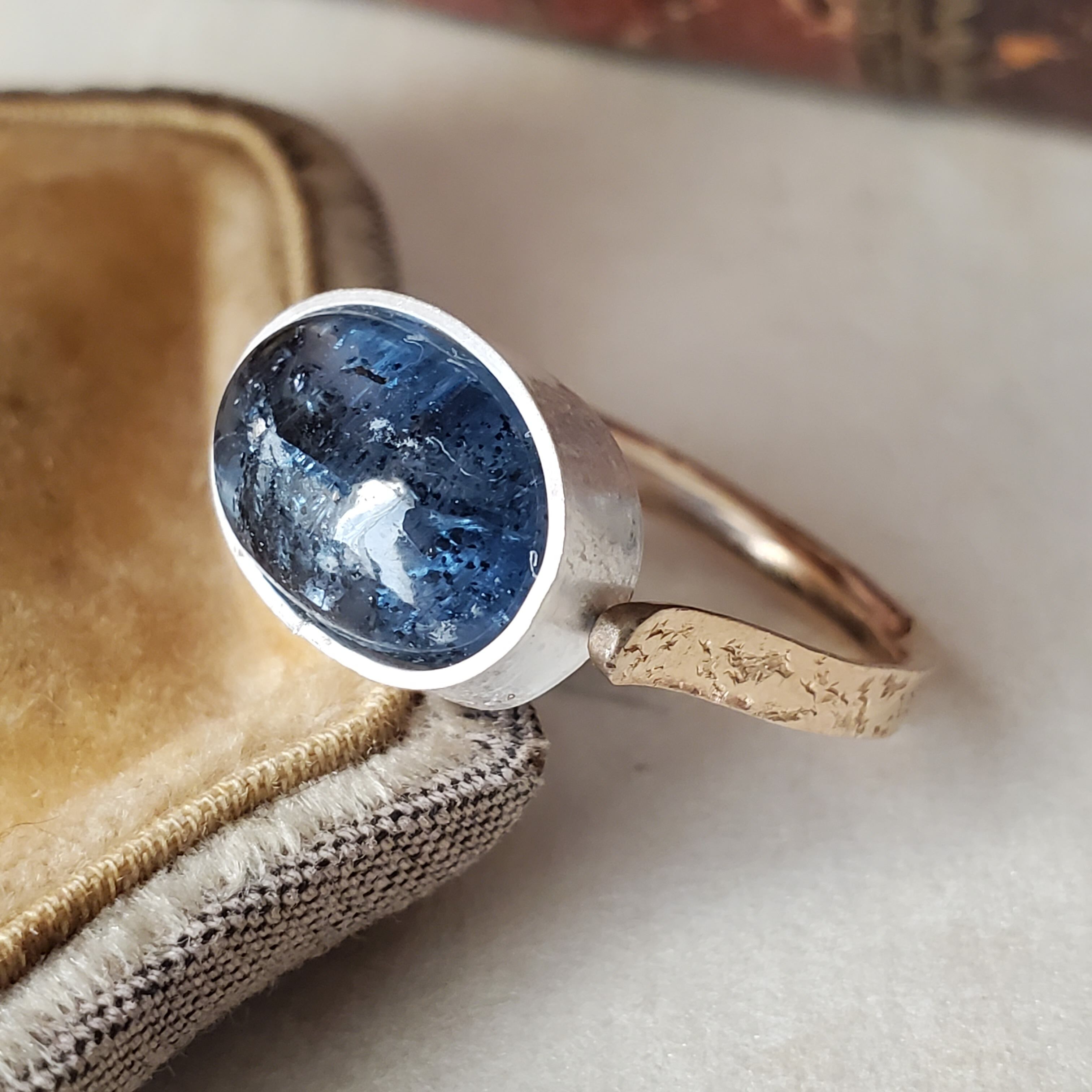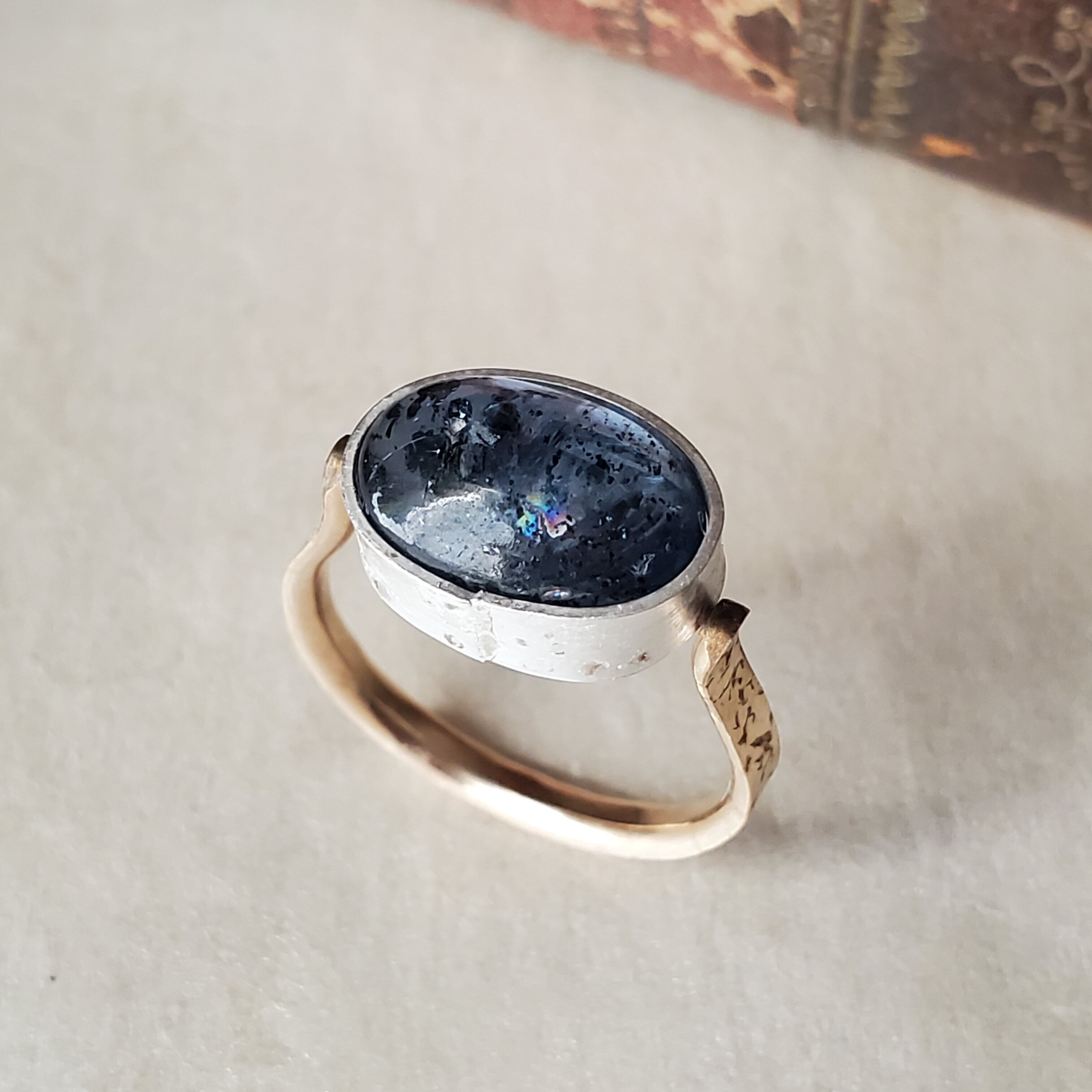 ぎっしりと黒色のインクルージョンを内に秘めたモスカイヤナイトです。