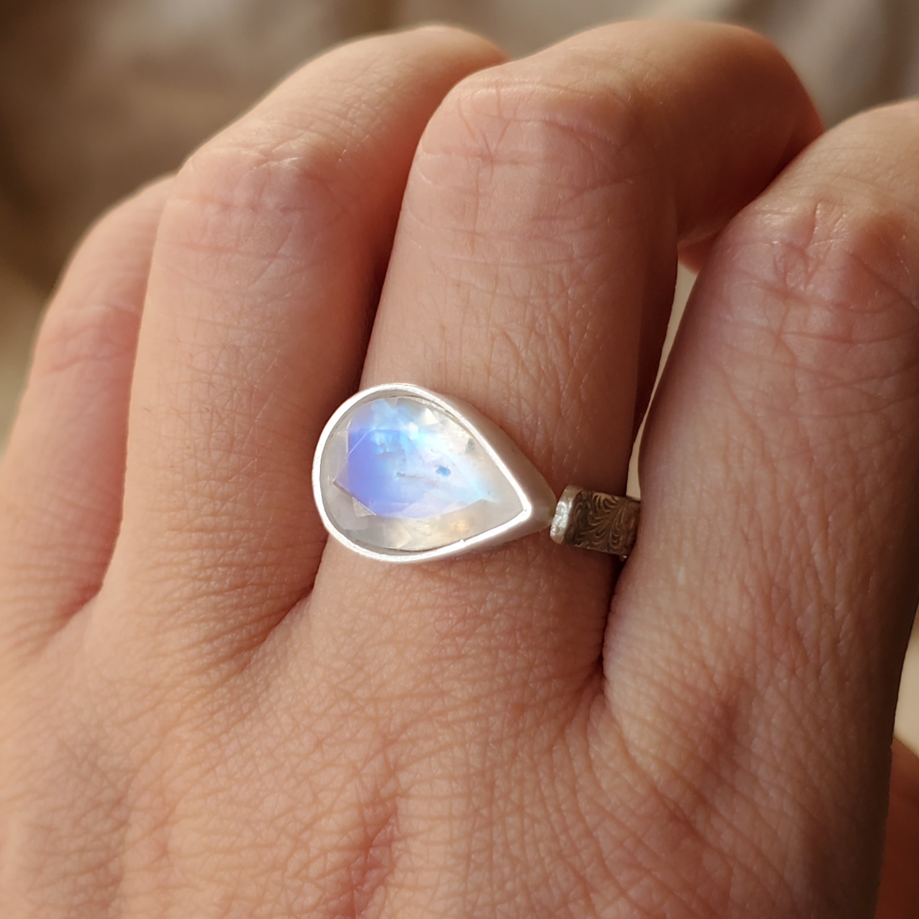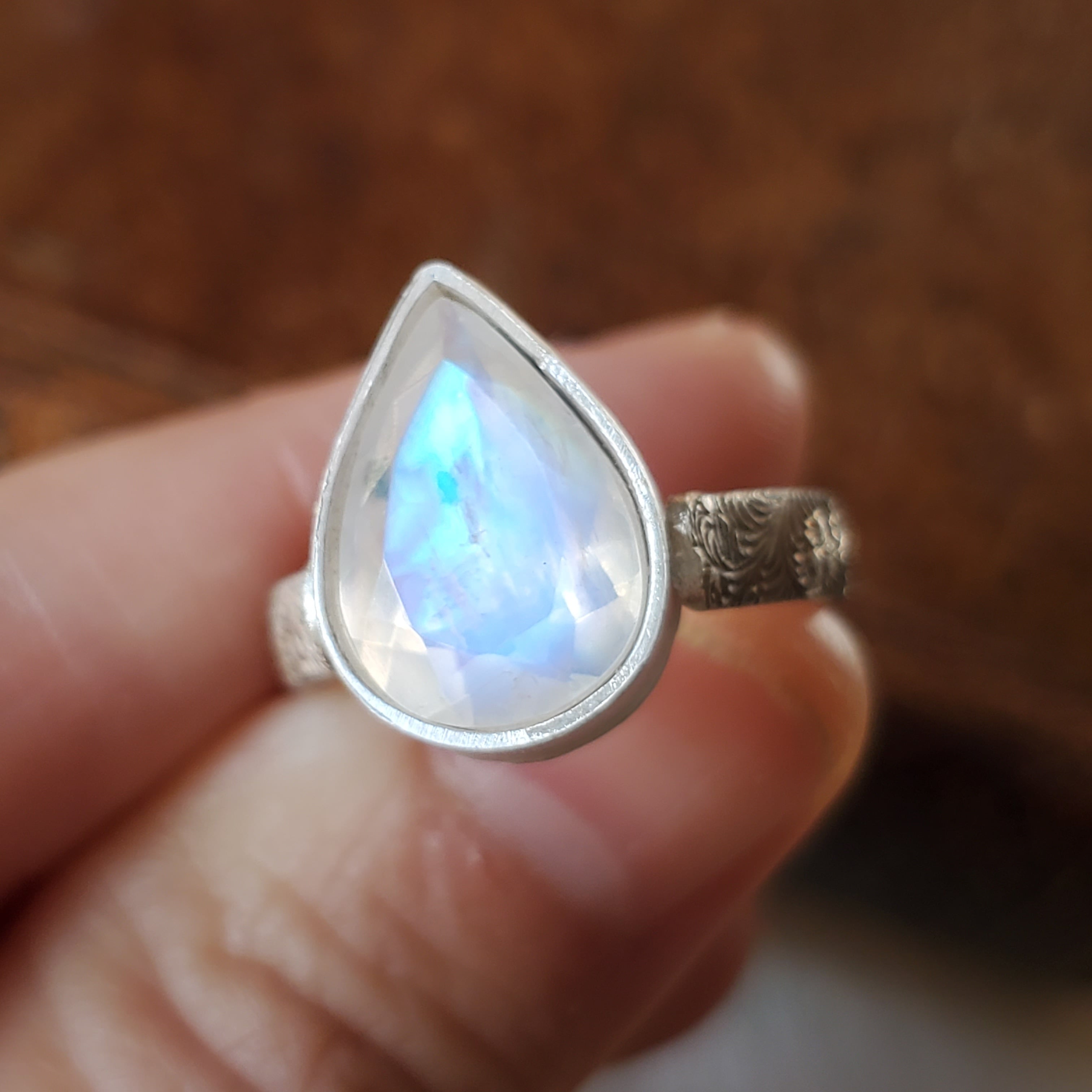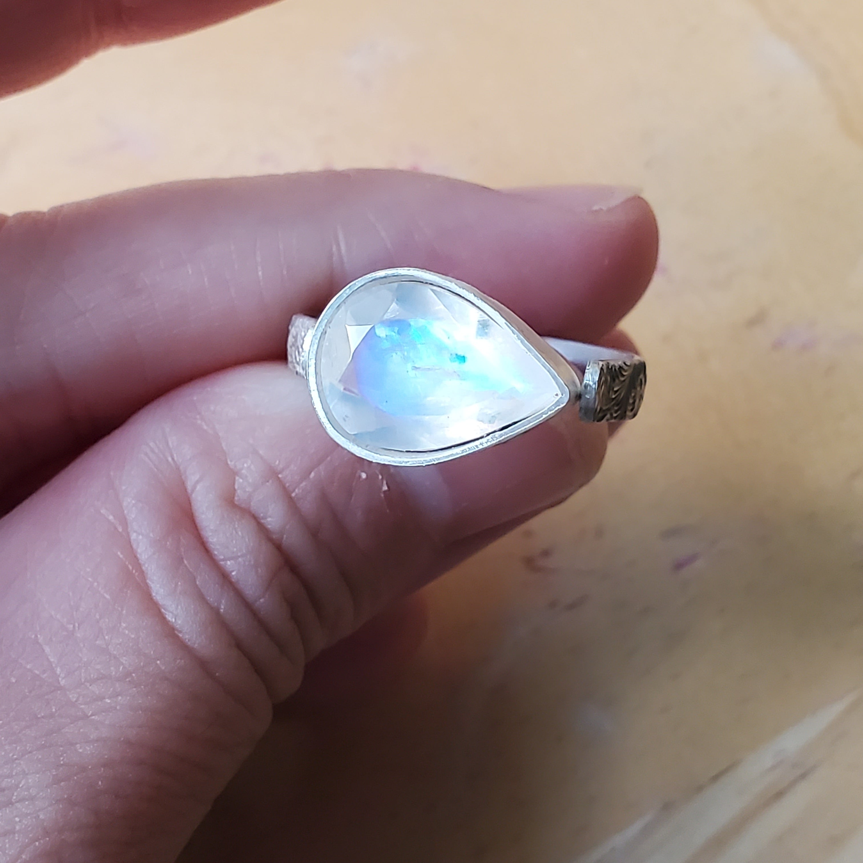 ●レインボームーンストーンは人気の石で、カボションやローズカット、ビーズの作品は多く出回っていますが、ファセットカットで覆輪留めのものは数がぐっと少なくなります。