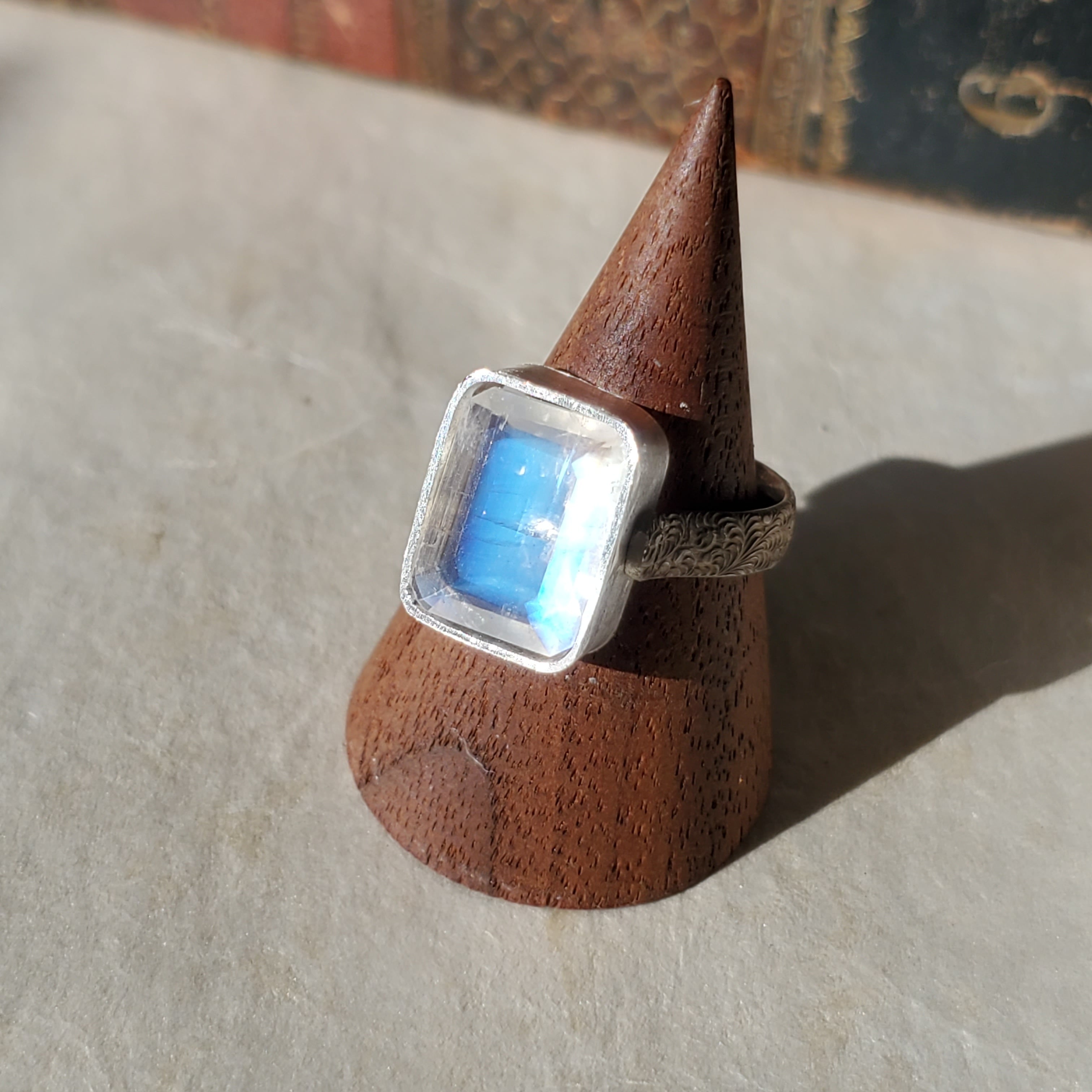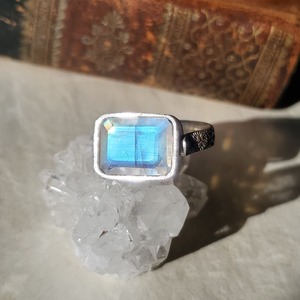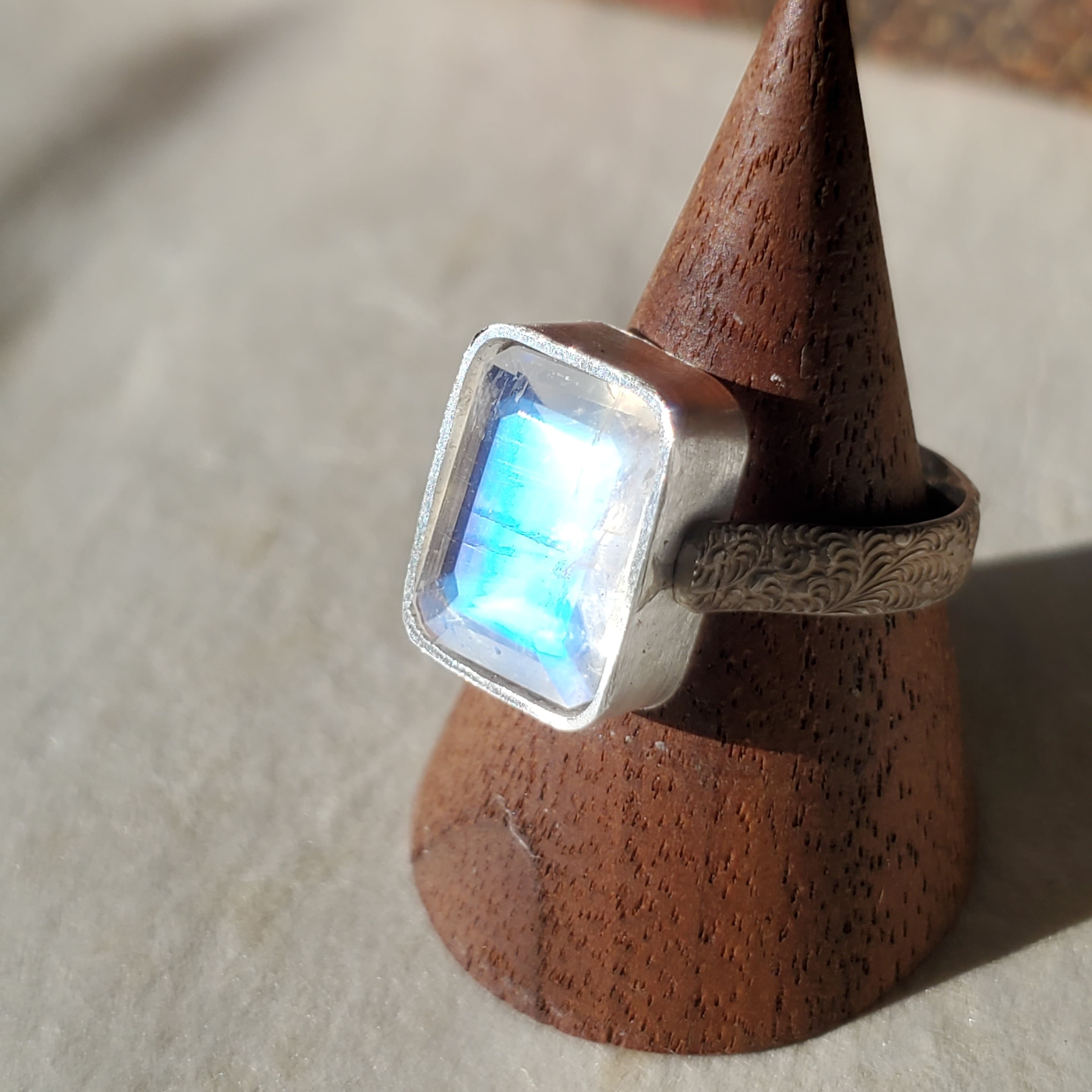 ●レインボームーンストーンは人気の石で、カボションやローズカット、ビーズの作品は多く出回っていますが、ファセットカットで覆輪留めのものは数がぐっと少なくなります。